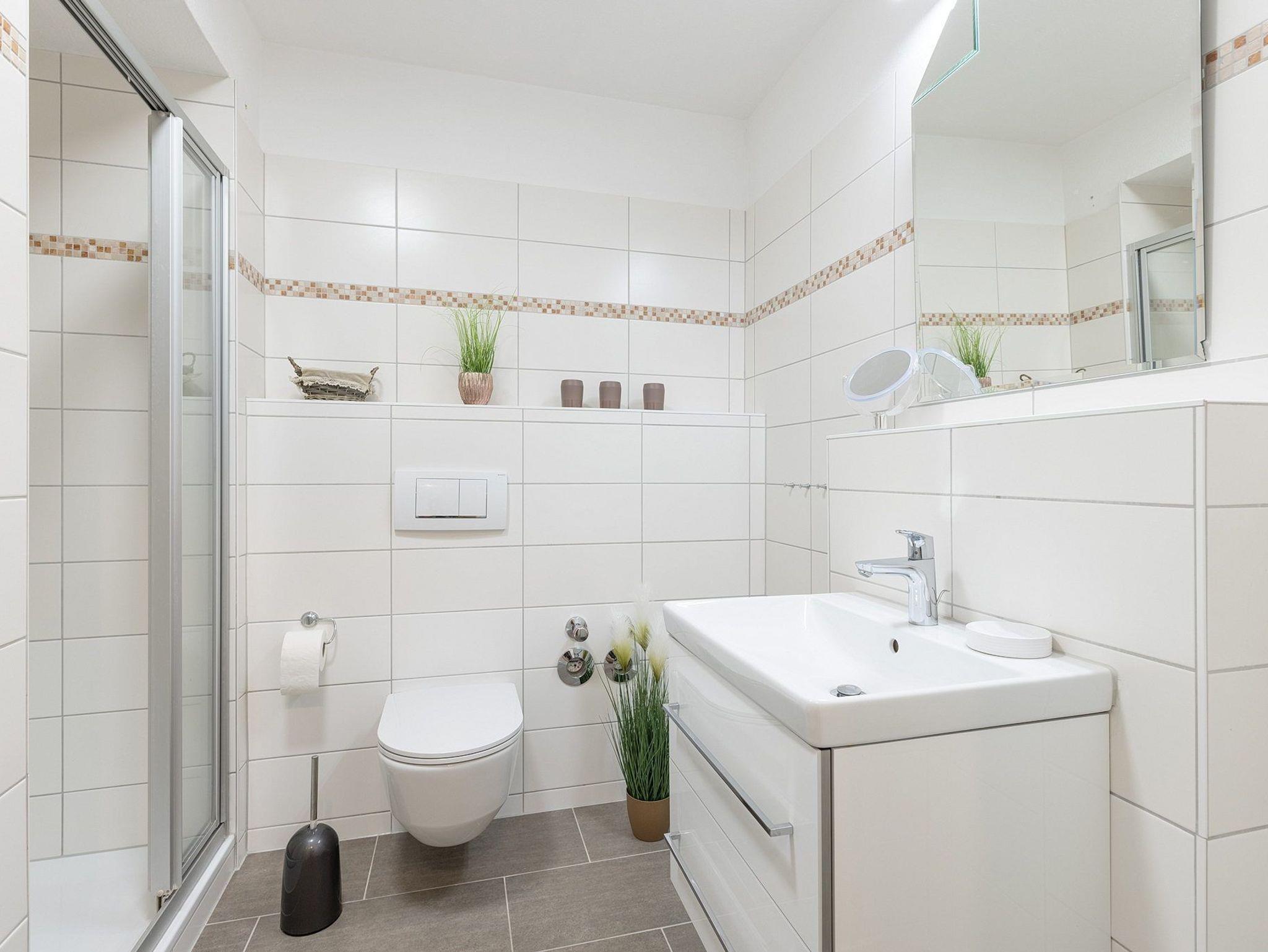 Helles Badezimmer mit Dusche, WC und Waschbecken.