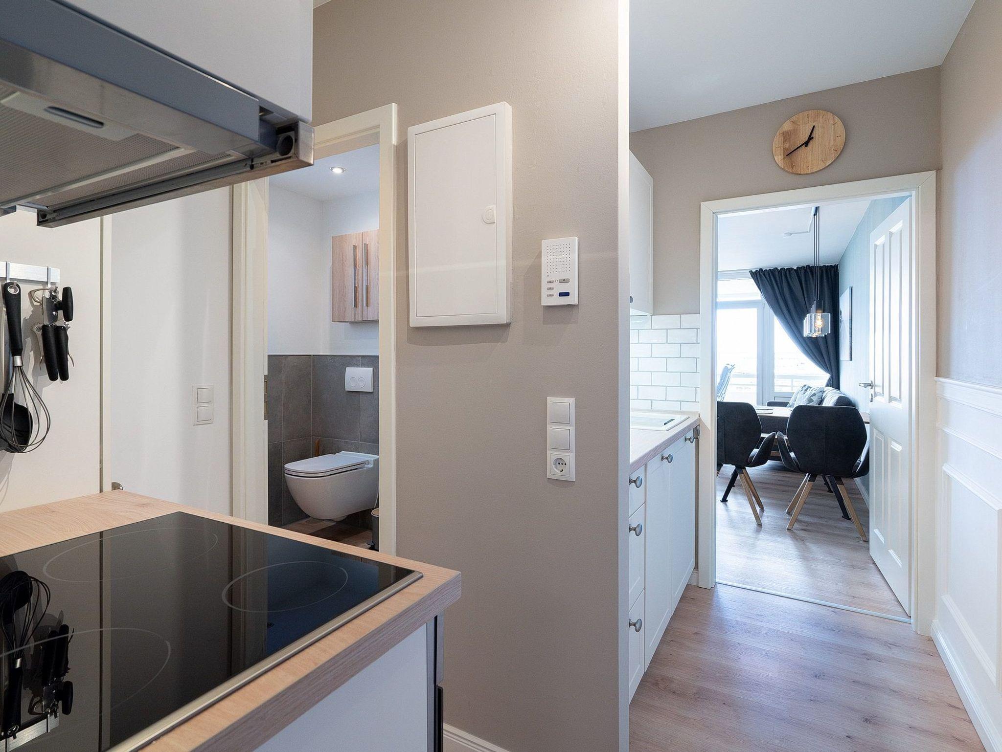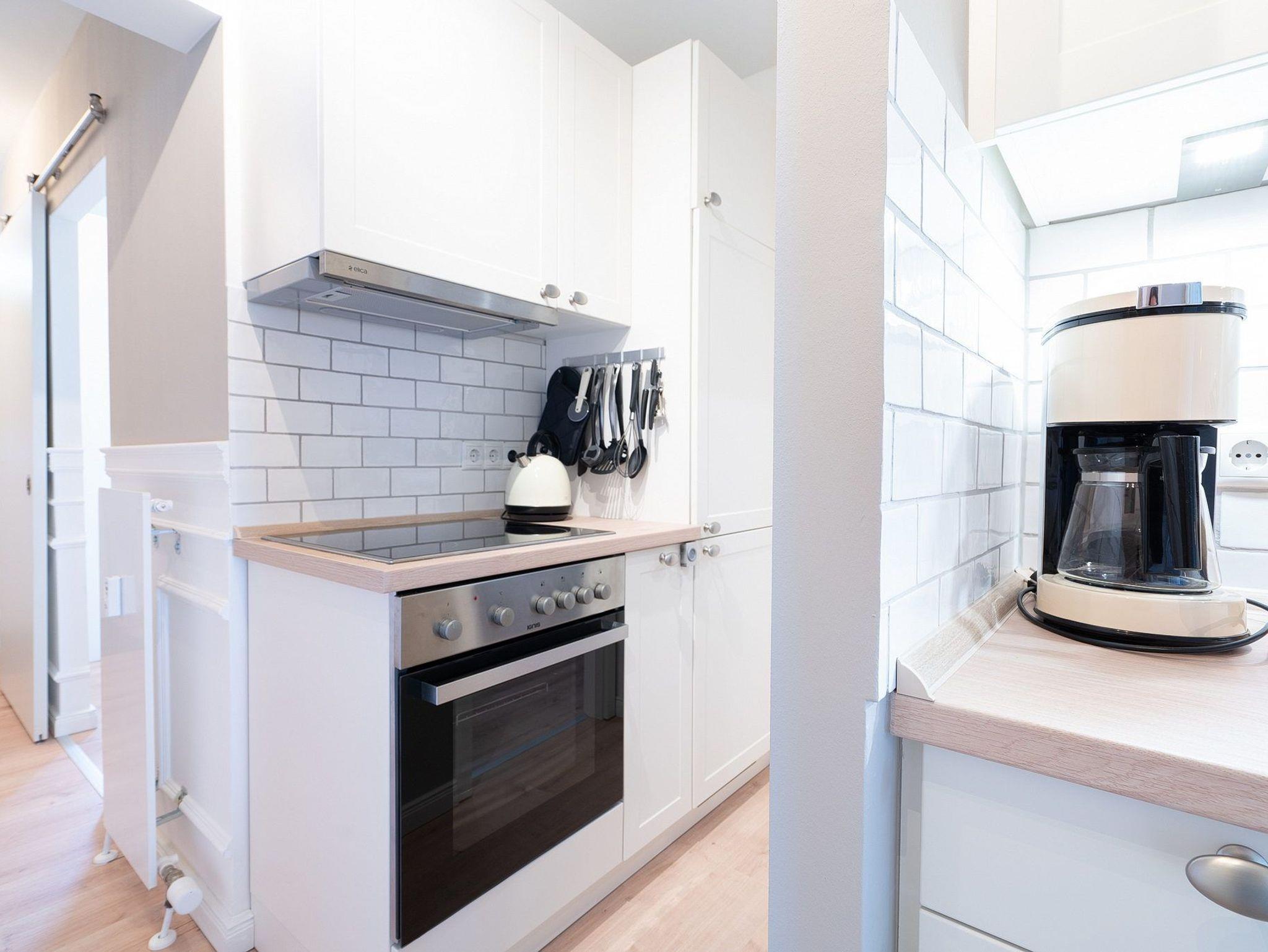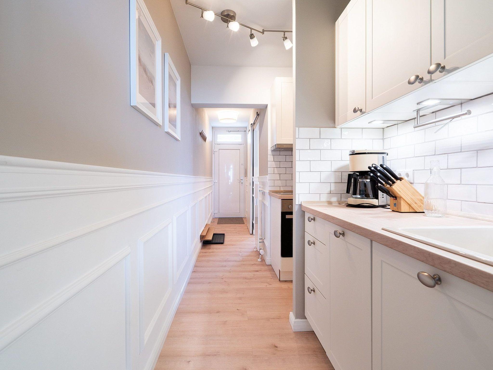 Moderne, Pantry-Küche im Flur. Die Küche ist mit einem 4-Platten Cerankochfeld, einem Backofen, einer Spülmaschine, einem Kühlschrank mit Gefrierschrank (2 Schubladen), einer Kaffeemaschine, einem Toaster und einem Wasserkocher ausgestattet.