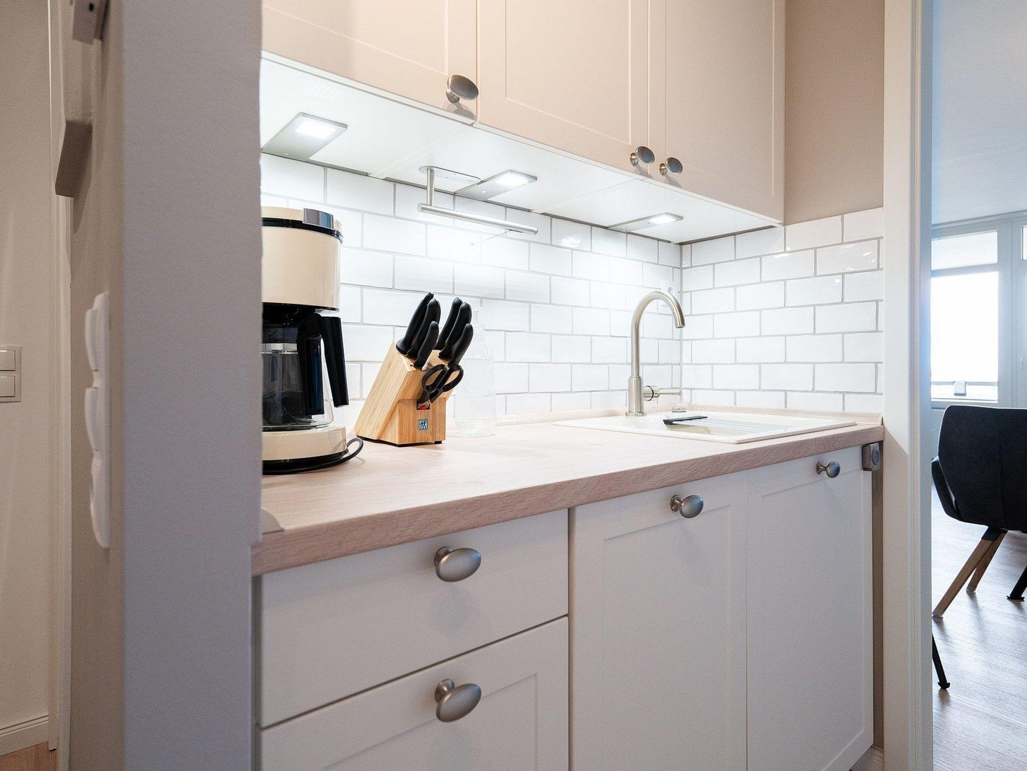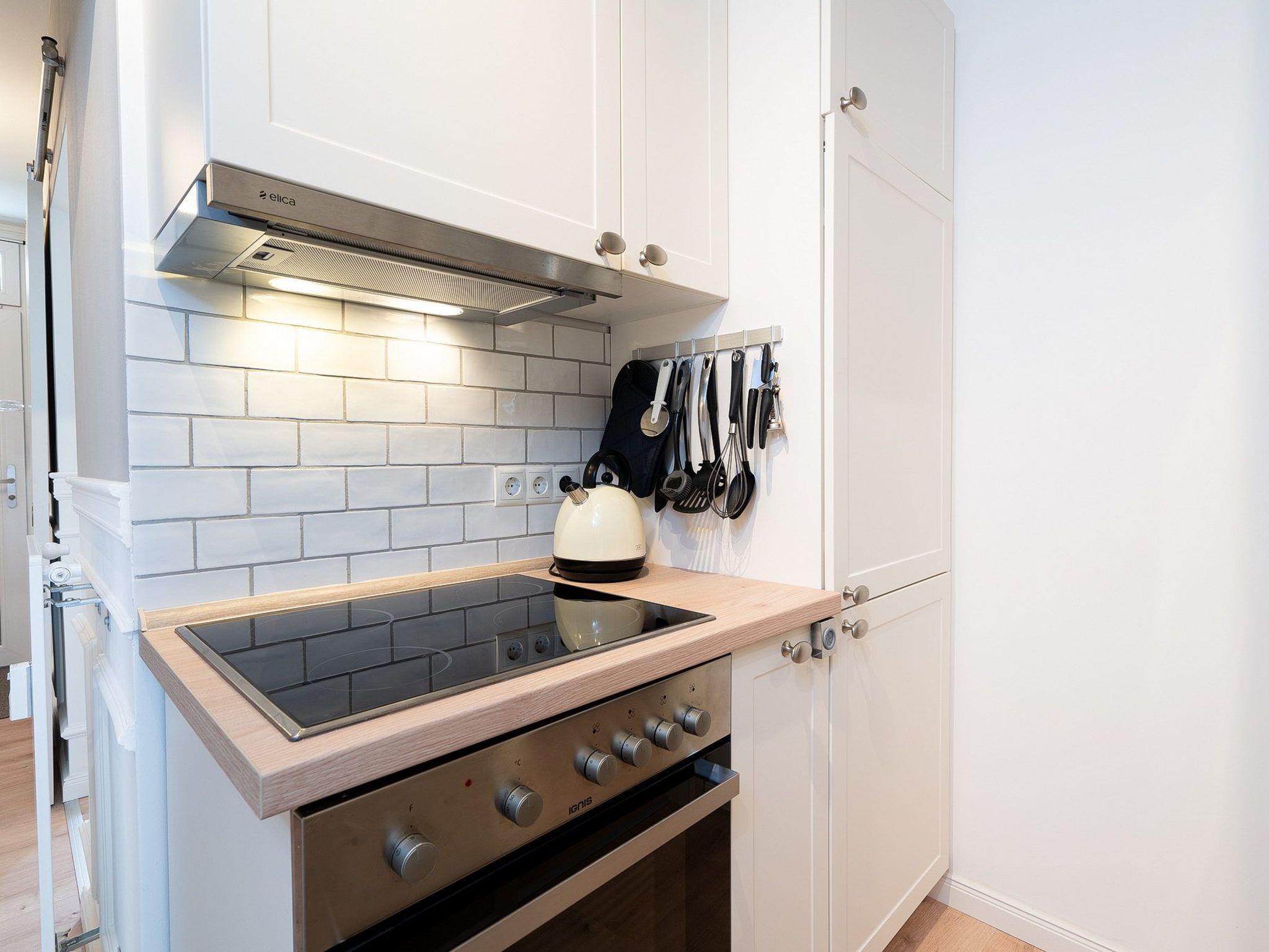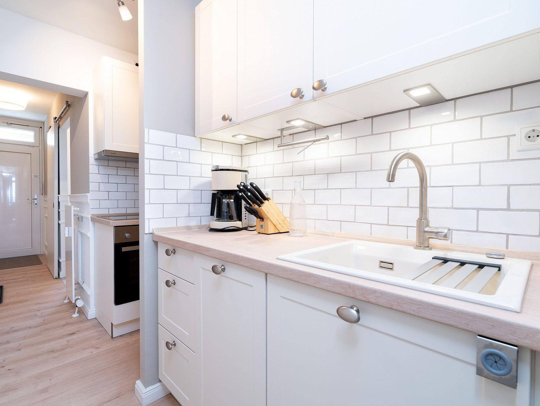 Moderne, Pantry-Küche im Flur. Die Küche ist mit einem 4-Platten Cerankochfeld, einem Backofen, einer Spülmaschine, einem Kühlschrank mit Gefrierschrank (2 Schubladen), einer Kaffeemaschine, einem Toaster und einem Wasserkocher ausgestattet.