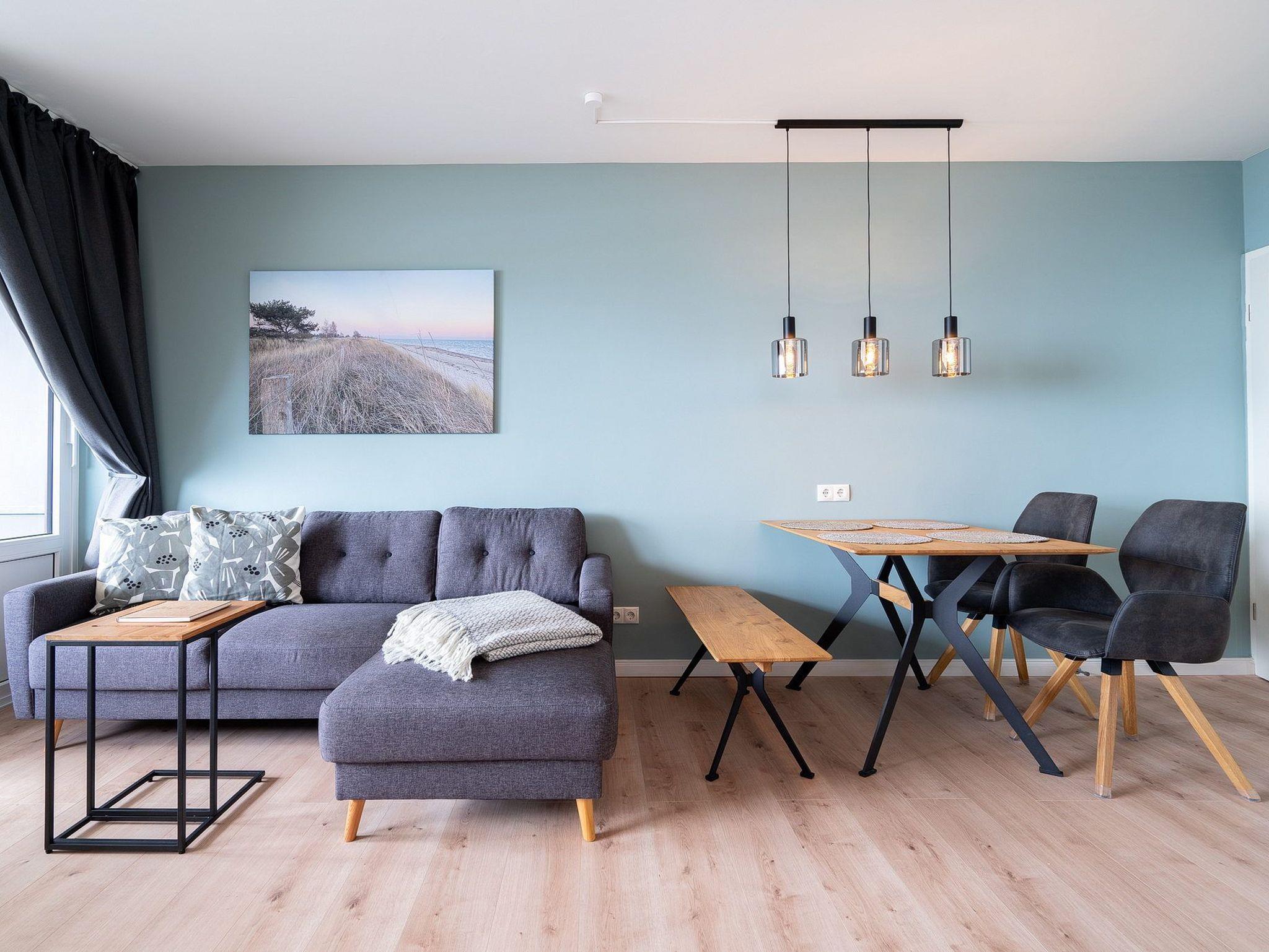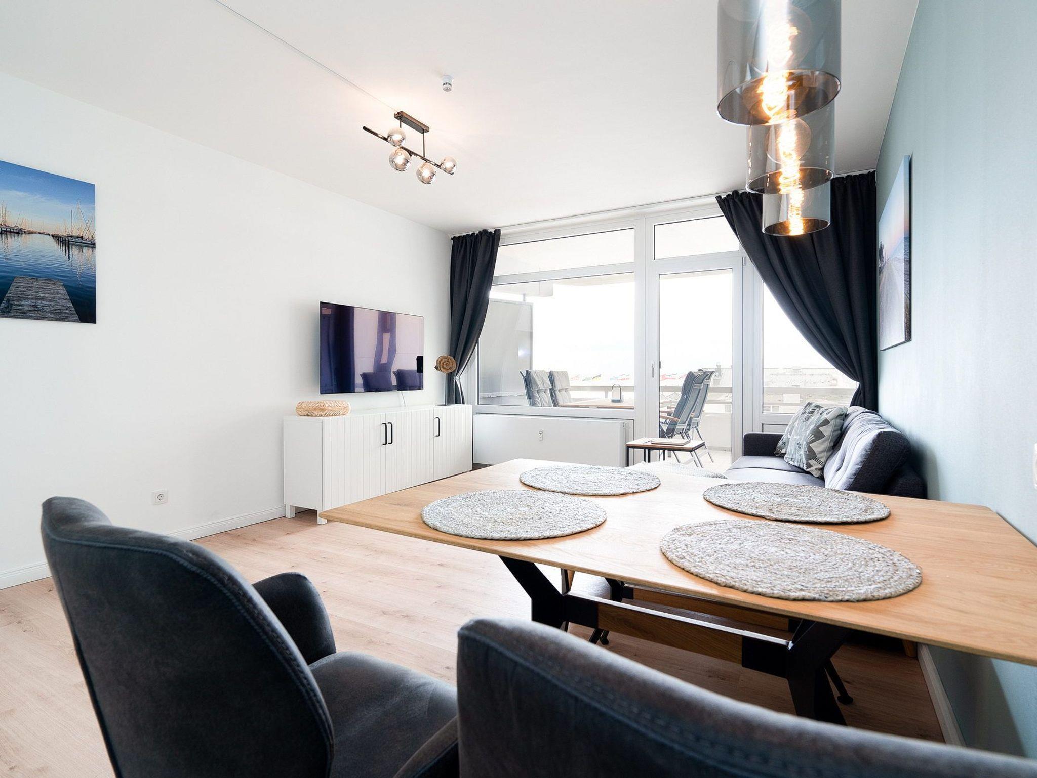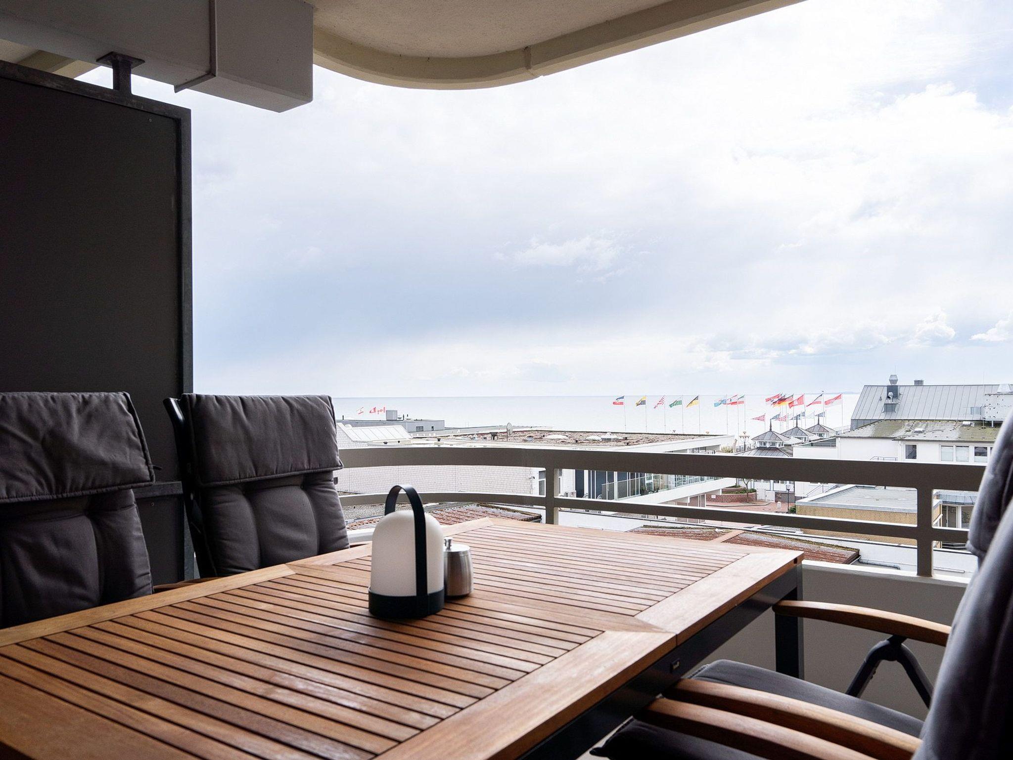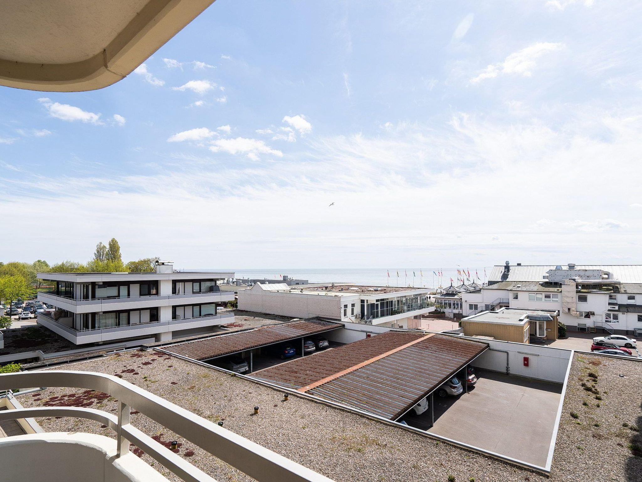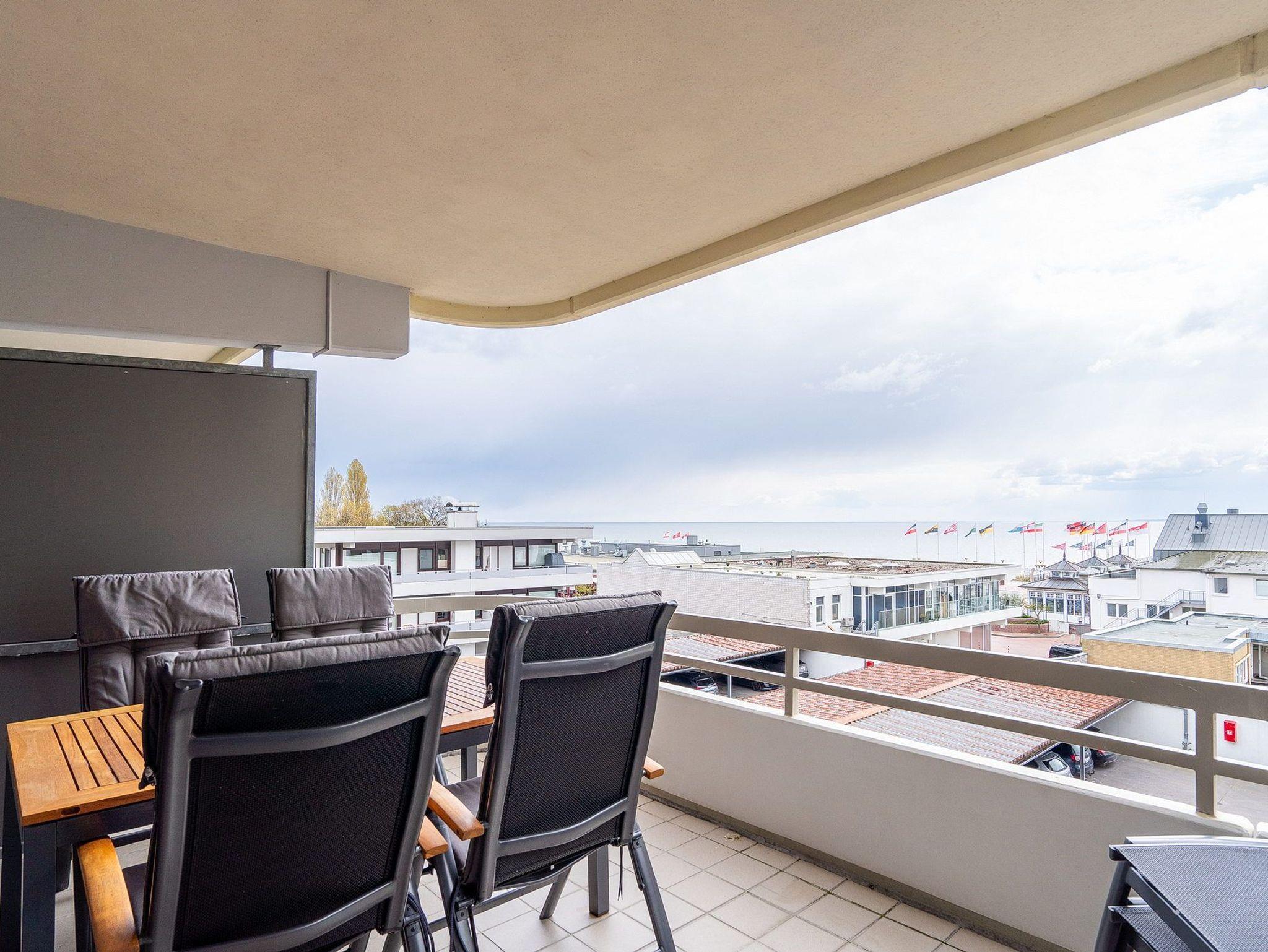 Balkon in südliche Richtung mit Blick auf die Ostsee. Eigener, schmaler PKW-Stellplatz (max. Höhe 1,90 m), Waschmaschine und Trockner gegen Gebühr.