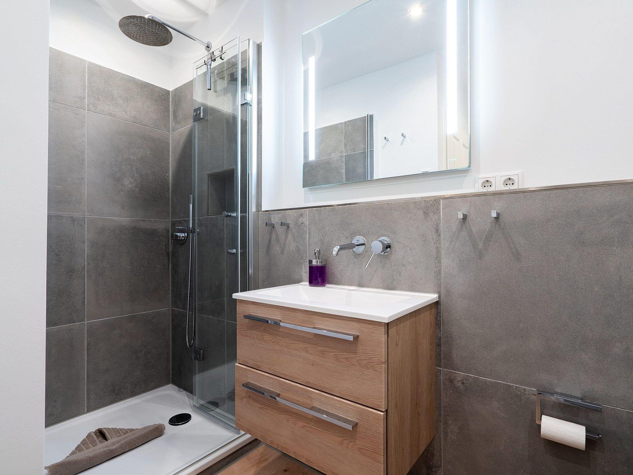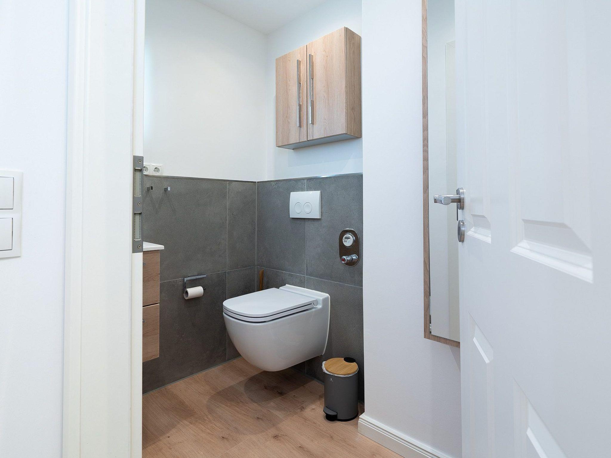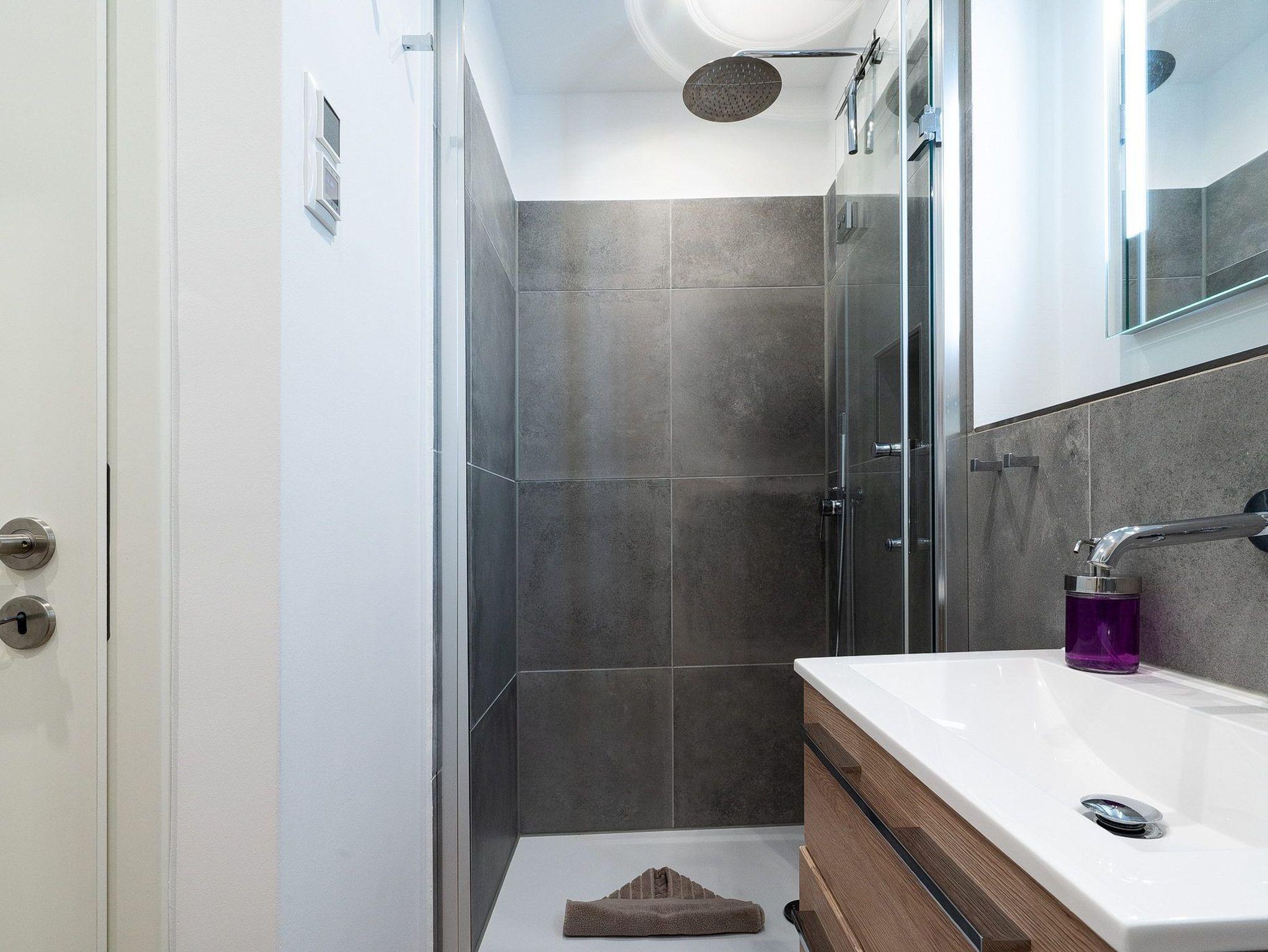 Modernes, kleines Bad mit Dusche, WC und Waschbecken.