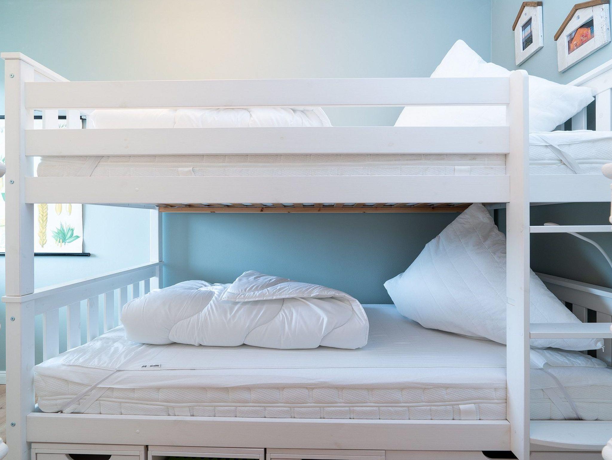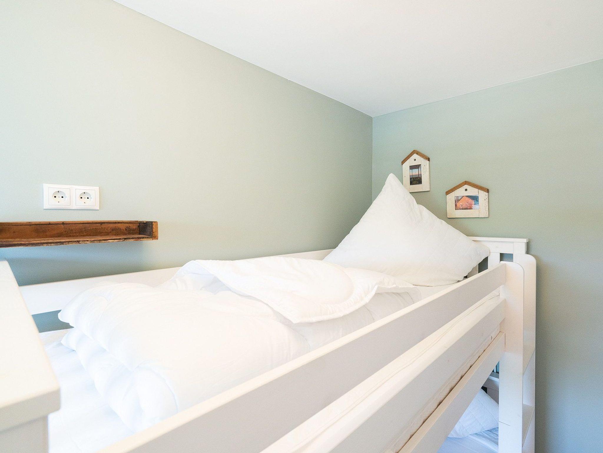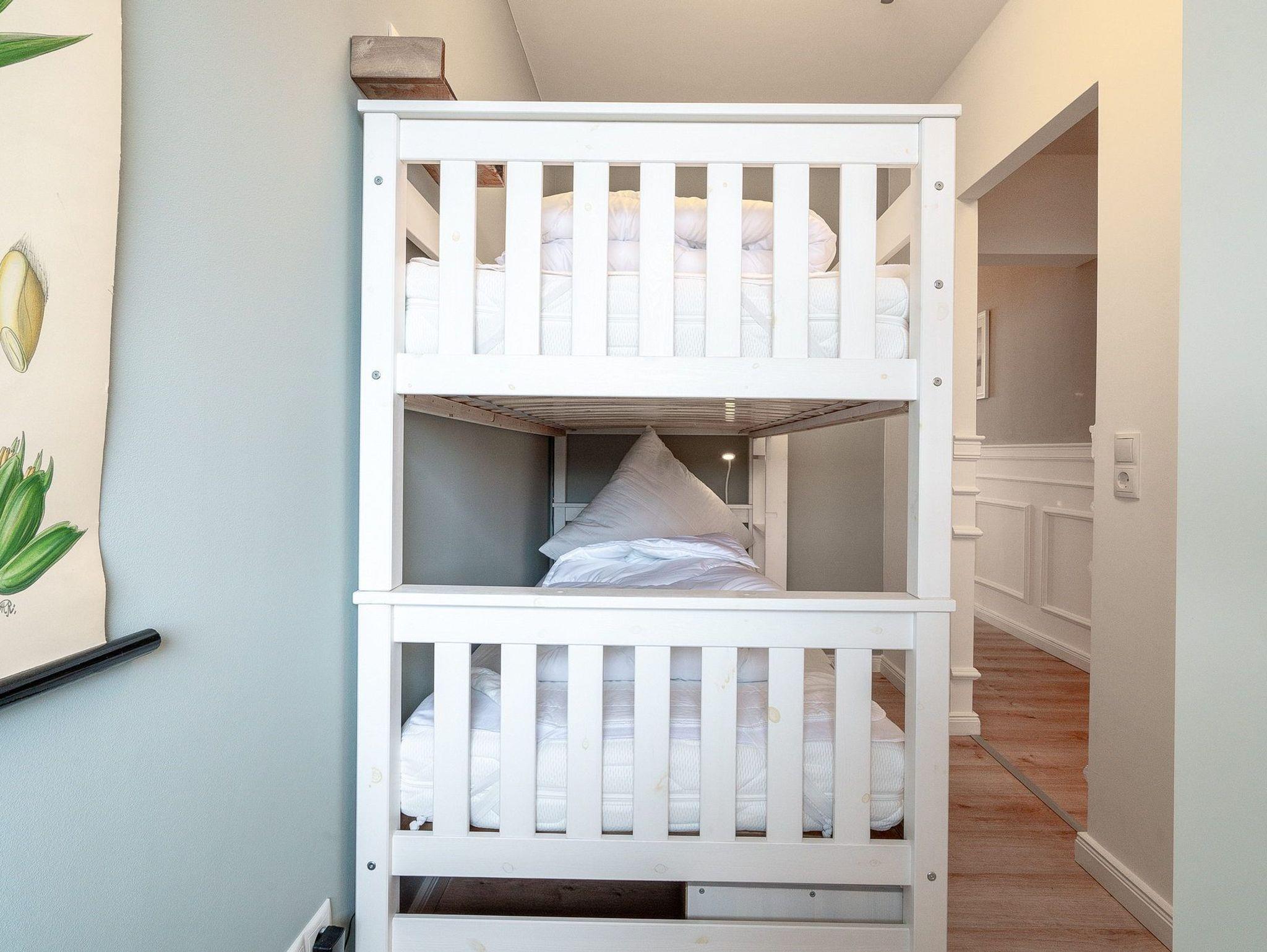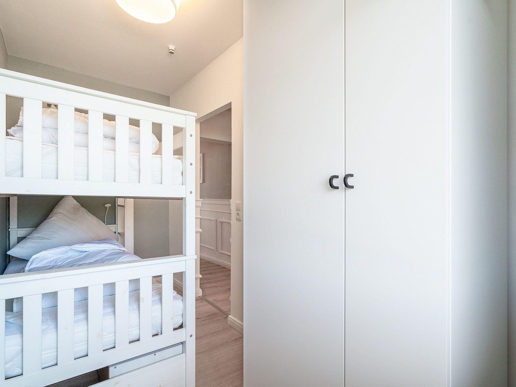 Kleines separates Zimmer mit Etagenbett ( je 90x200cm), kleiner Schrank, Designerfußboden in Holzoptik und Fenster zum Laubengang.