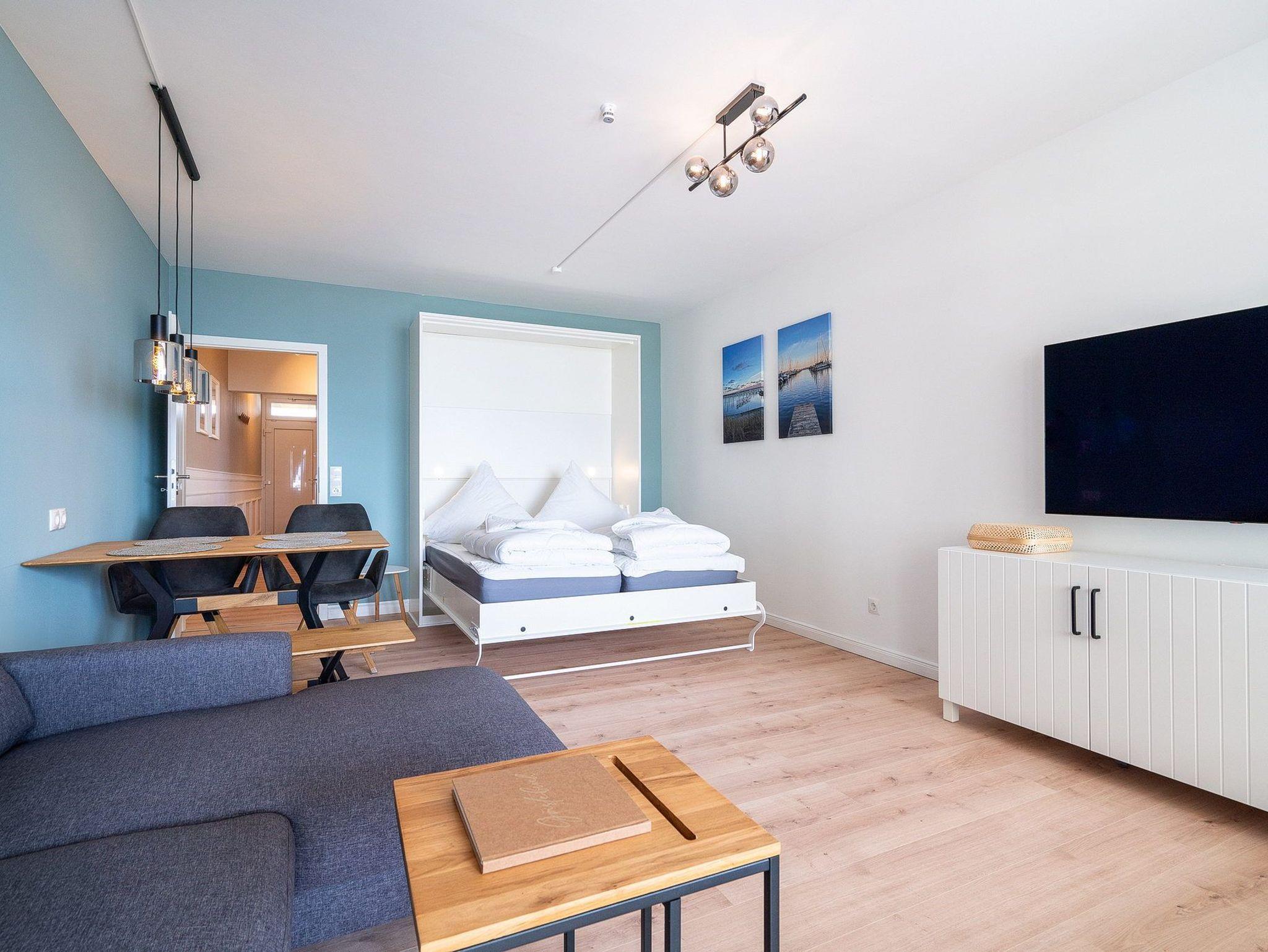 Freundliches, helles und gemütliches Wohn- und Schlafzimmer mit einem Designerfußboden in Holzoptik. Im Wohn-/Schlafzimmer befinden sich eine Eck-Couch, ein Couch-Tisch, ein Essplatz für 4 Personen, ein Schrankbett (2x80x200cm) sowie ein SAT-TV (Flachbildschirm). Das Zimmer lässt sich mit Vorhängen verdunkeln. Direkter Zugang vom Wohn- und Schlafzimmer zum Balkon mit Aussicht auf das Meer.