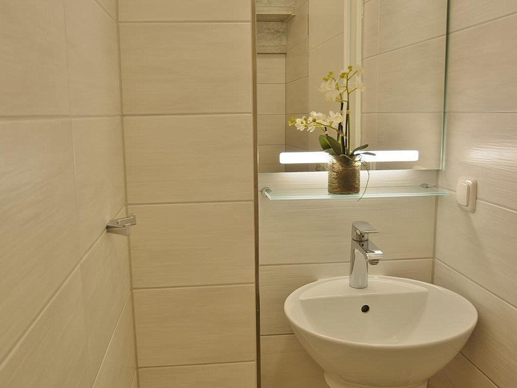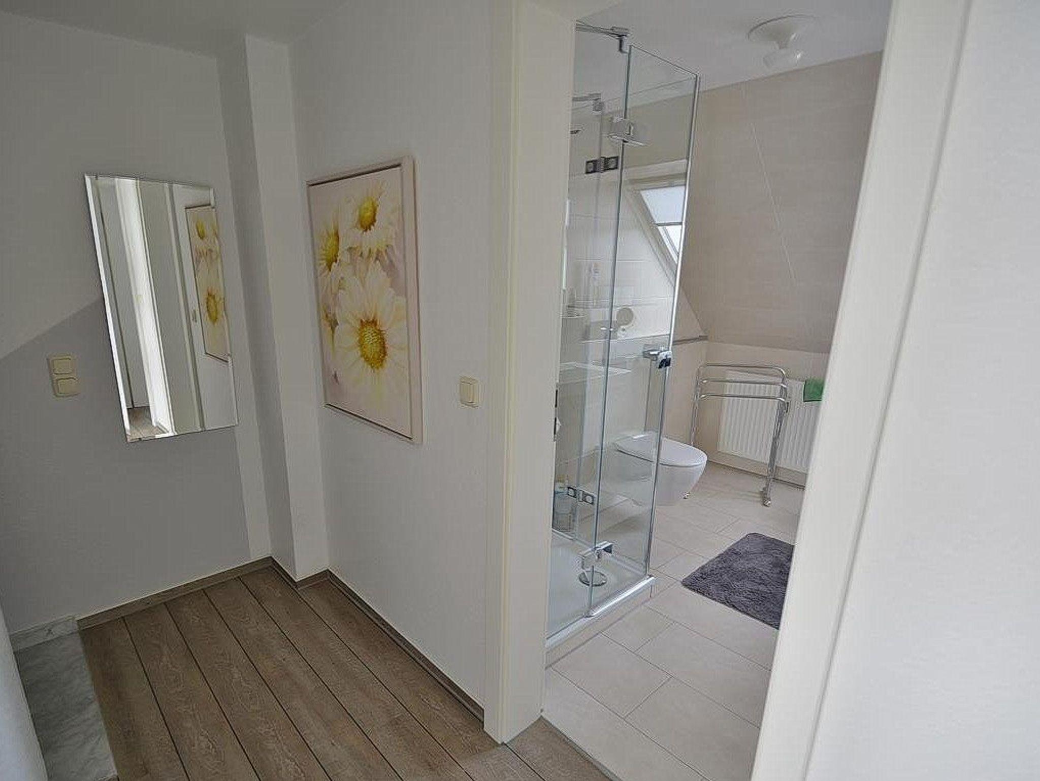 Modernes, hell gefliestes Tageslichtbad im 2.OG. Das Bad verfügt über eine Dusche, Waschbecken und WC. Ein weiteres modernes WC befindet sich im 1. OG.