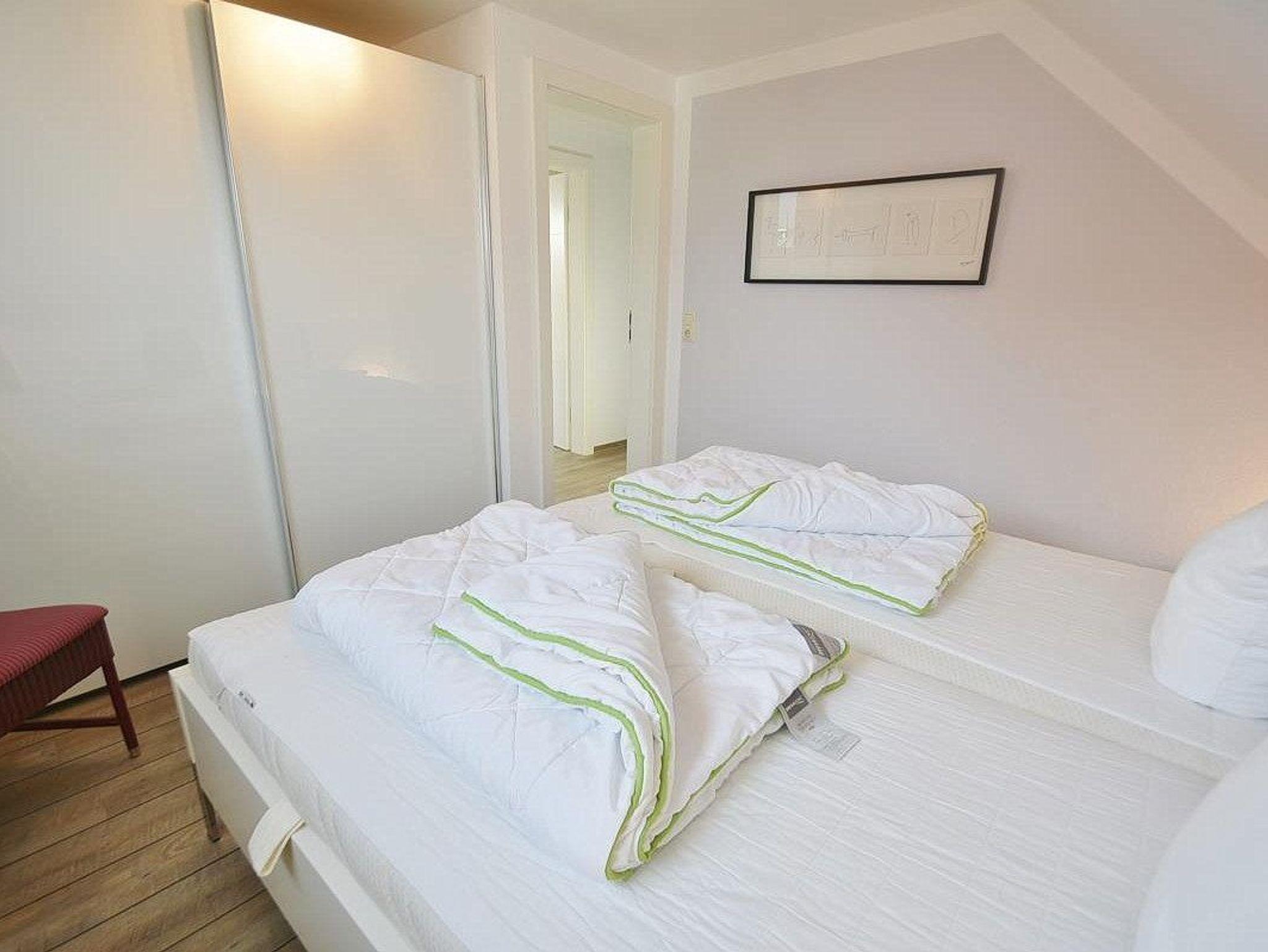 Das separate, modern ausgestattete Schlafzimmer im 1. OG verfügt über 2 Einzelbetten (je 90x200cm) und einem 2-türigen Kleiderschrank. Das Zimmer ist mit Designer-Planken ausgestattet. Das Fenster lässt sich durch ein Plissee vollständig verdunkeln.