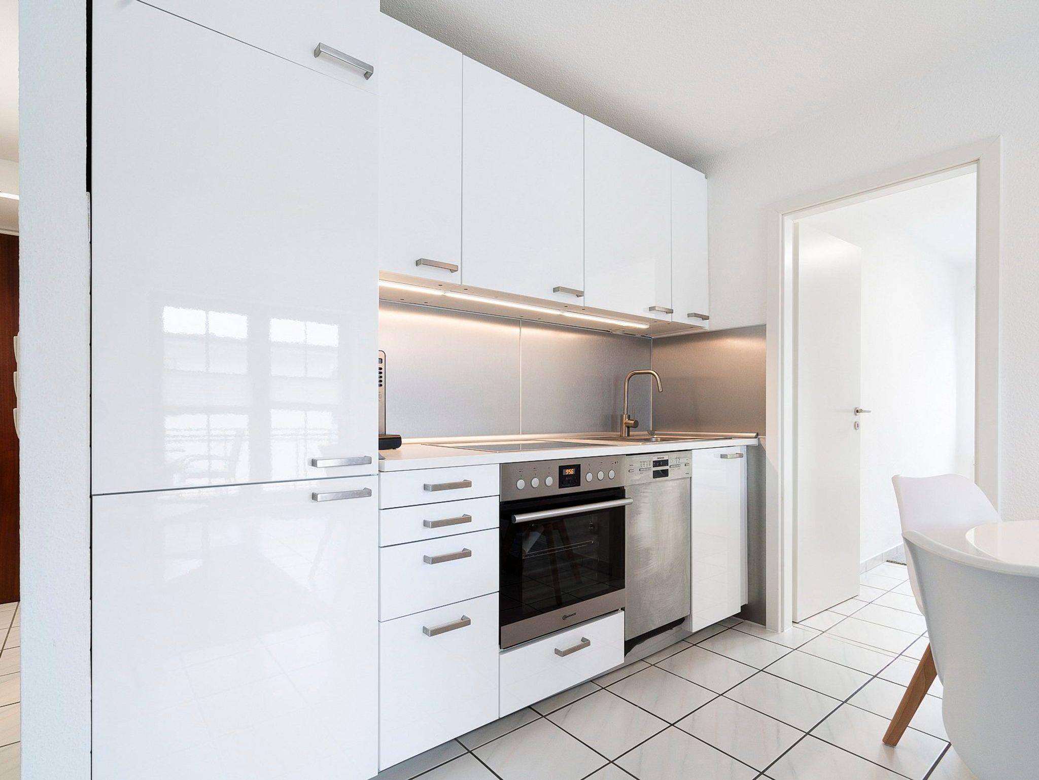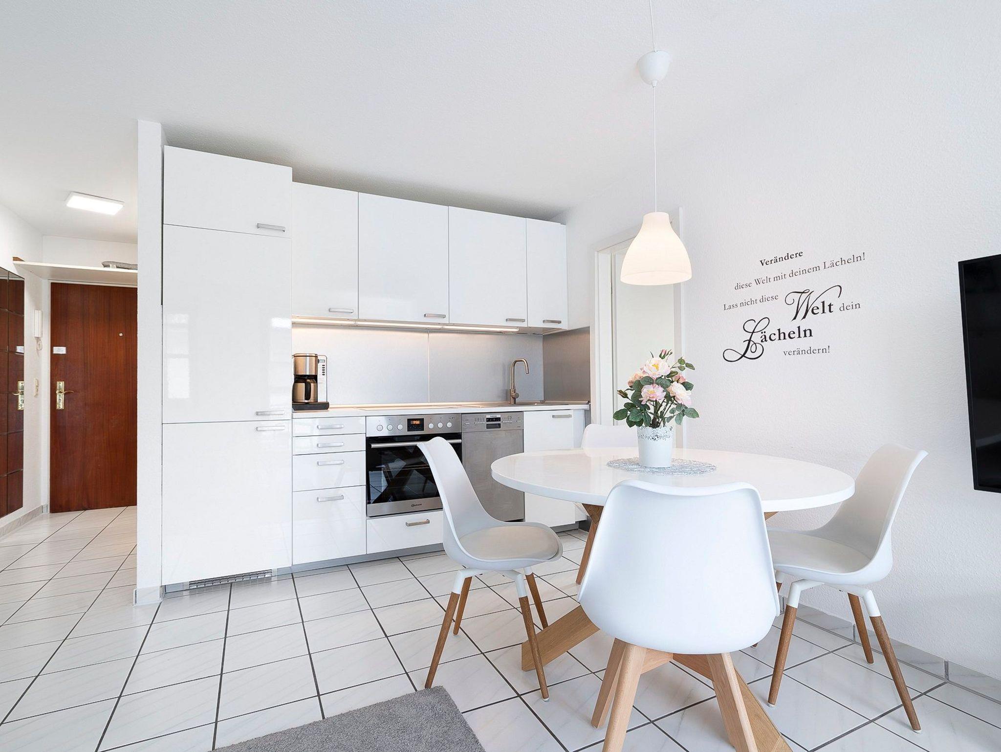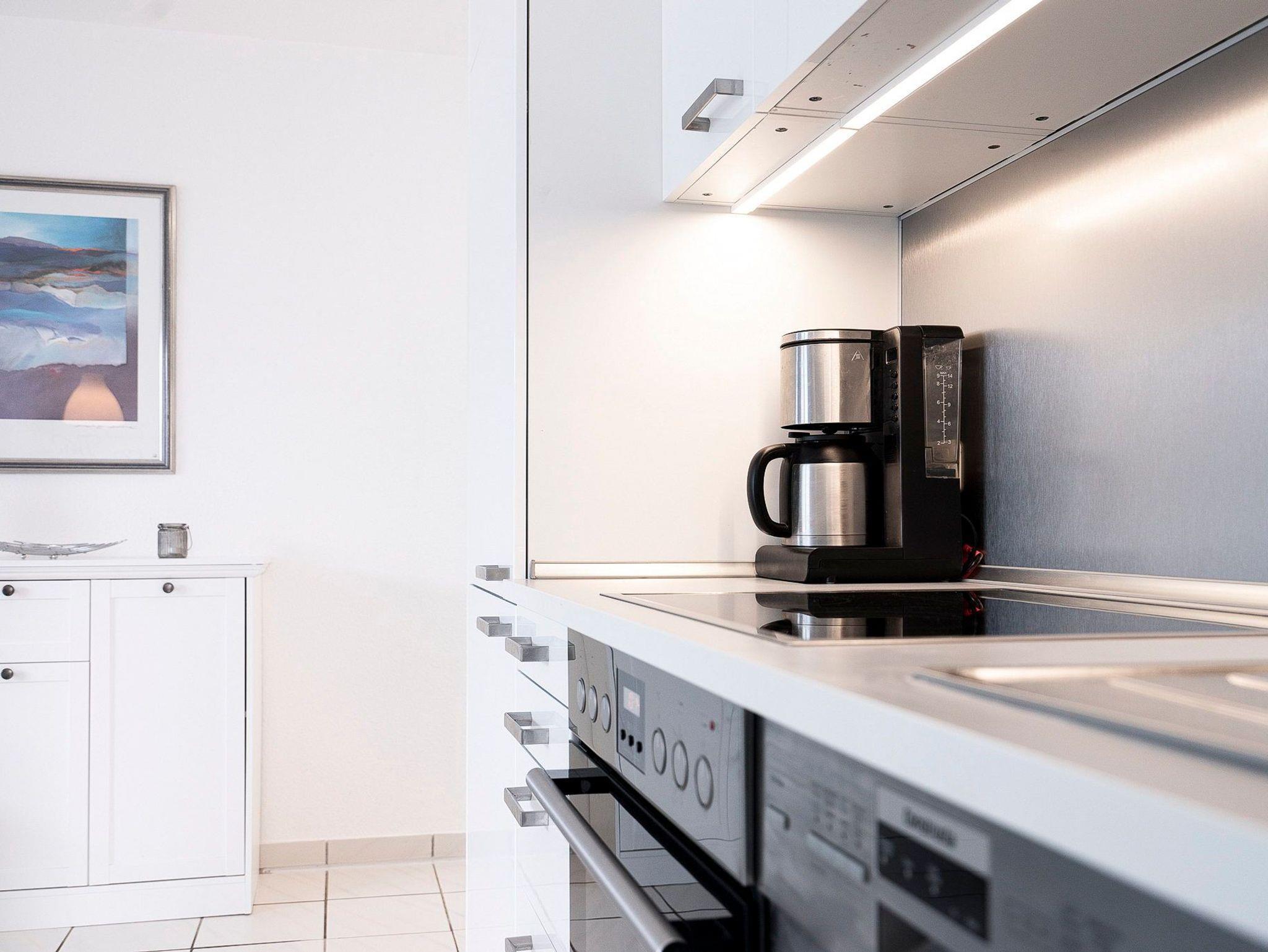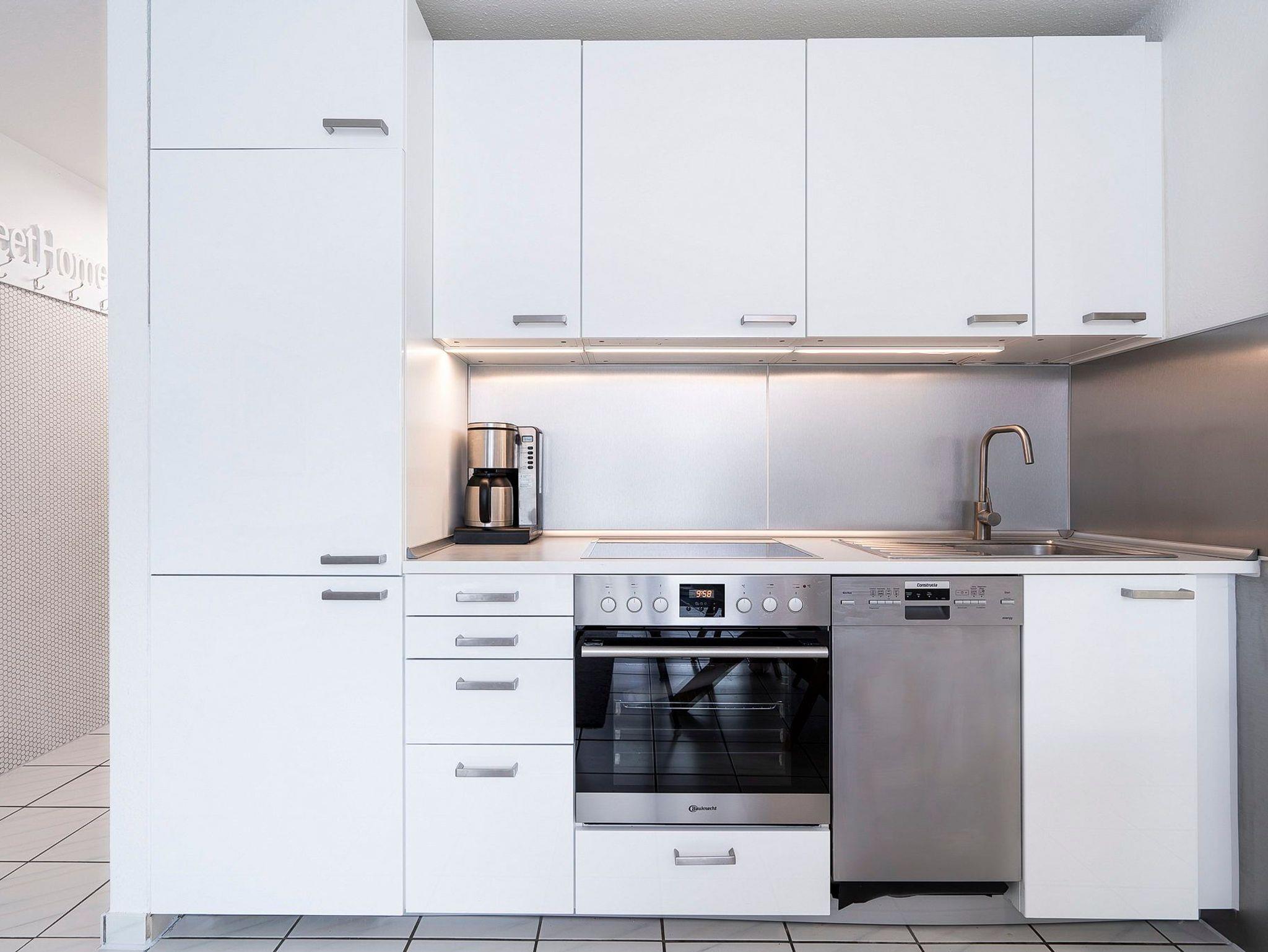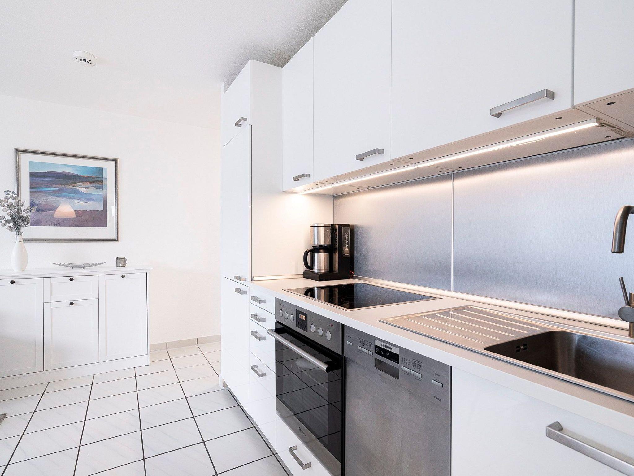Komplett ausgestattete, zum Wohn- [&] Esszimmer offene, moderne Küche mit 4 Platten Cerankochfeld, Backofen, Kühlschrank mit 3* Gefrierfach und Spülmaschine. Geschirr, Besteck, Wasserkocher, Eierkocher, Kaffeemaschine, etc. sind selbstverständlich ebenfalls vorhanden.