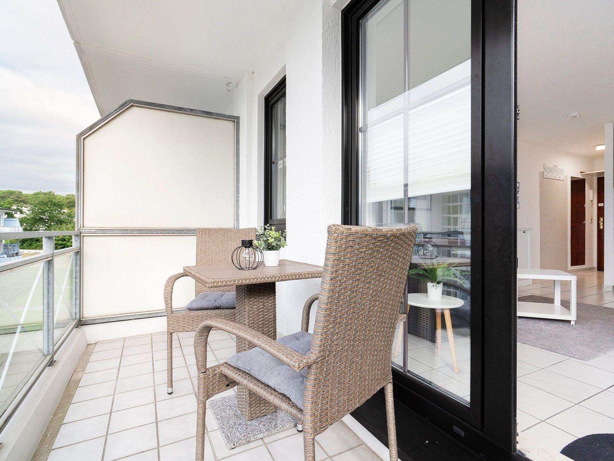 Schöner, sonniger Balkon mit geringem Teilseeblick, in süd-westliche Richtung lädt zum Frühstück, Mittag-[&] Abendessen ein. Eigener Pkw-Stellplatz hinterm Haus. Waschmaschine und Trockner gegen Gebühr. Fahrradkeller.
