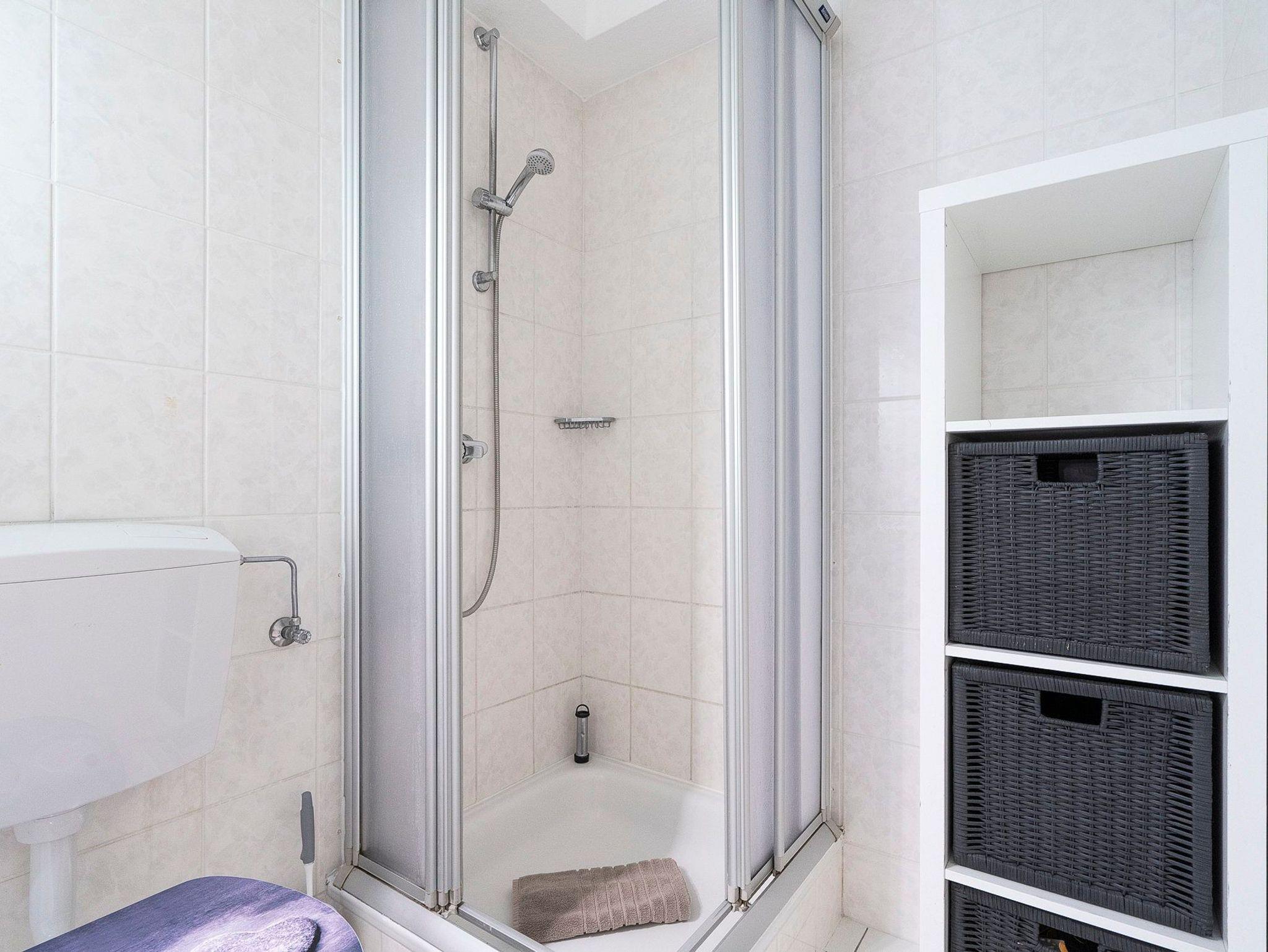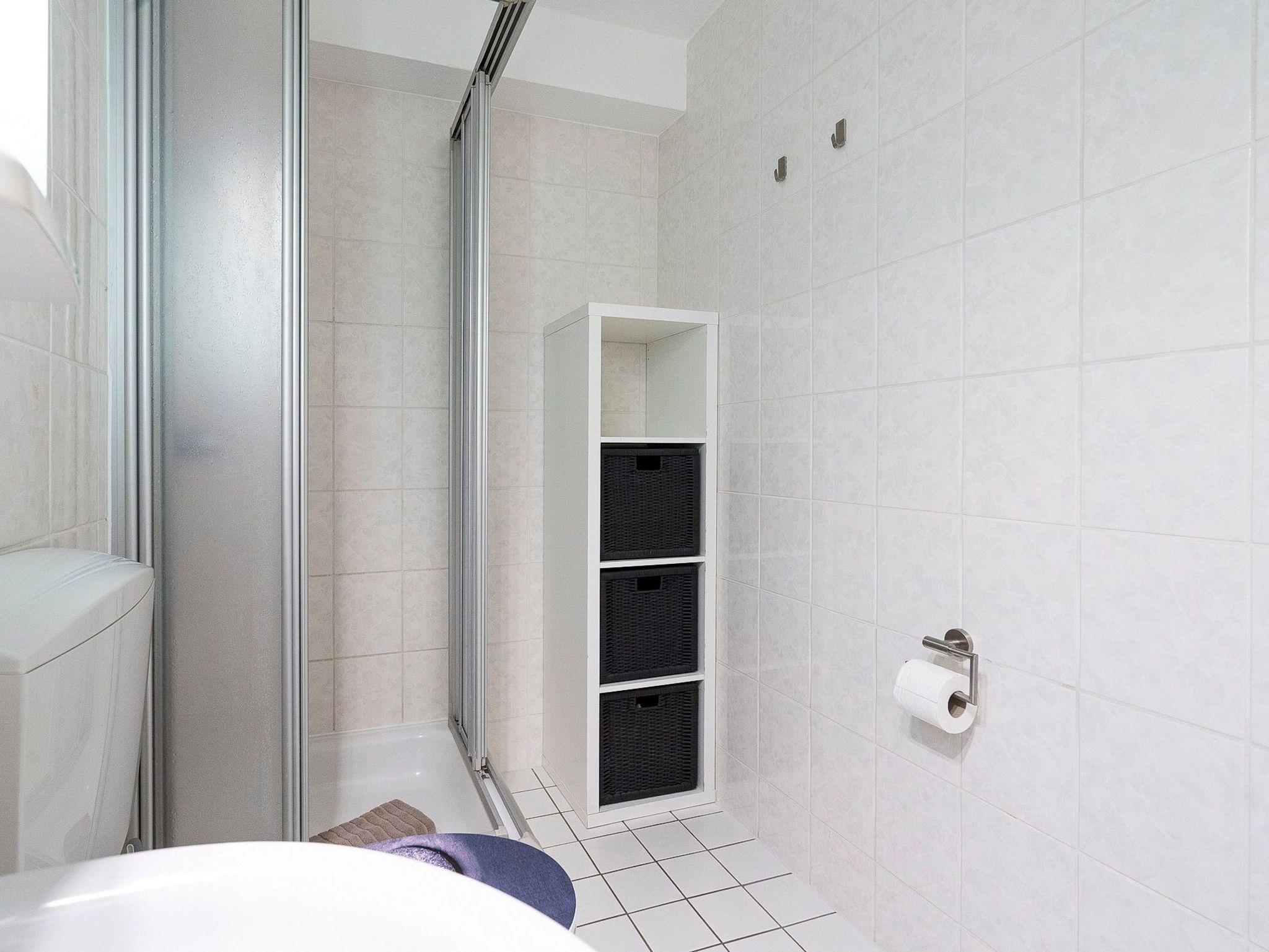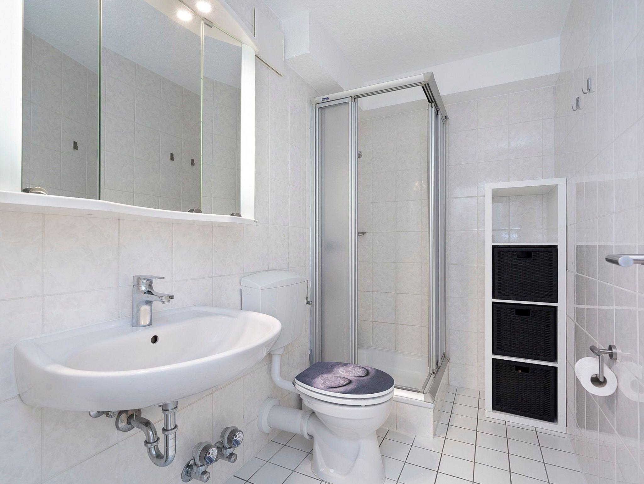 Modernes, hell gefliestes Bad mit Dusche, Waschbecken und WC.