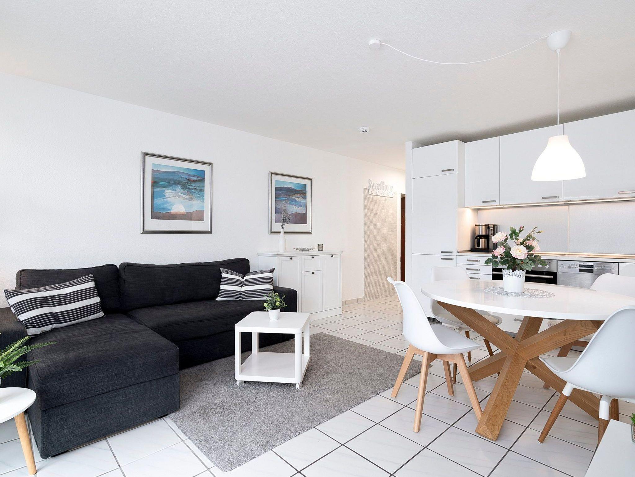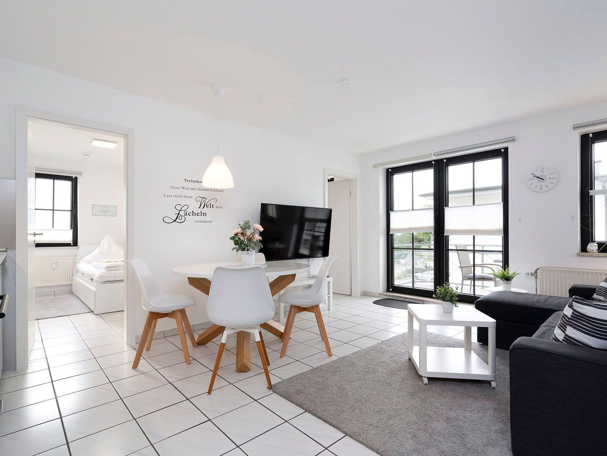 Modernes, hell gefliestes Wohn- [&] Esszimmer mit einer Couch und 2 Sesseln. Ein HD-Fernseher sowie DVD-Player stehen Ihnen zur Verfügung. Ein Esstisch für 4 Personen steht ebenfalls bereit. In der Kommode finden sie eine Spielesammlung für nette gemeinsame Stunden. Die Fenster lassen sich durch Innenrollos etwas verdunkeln.