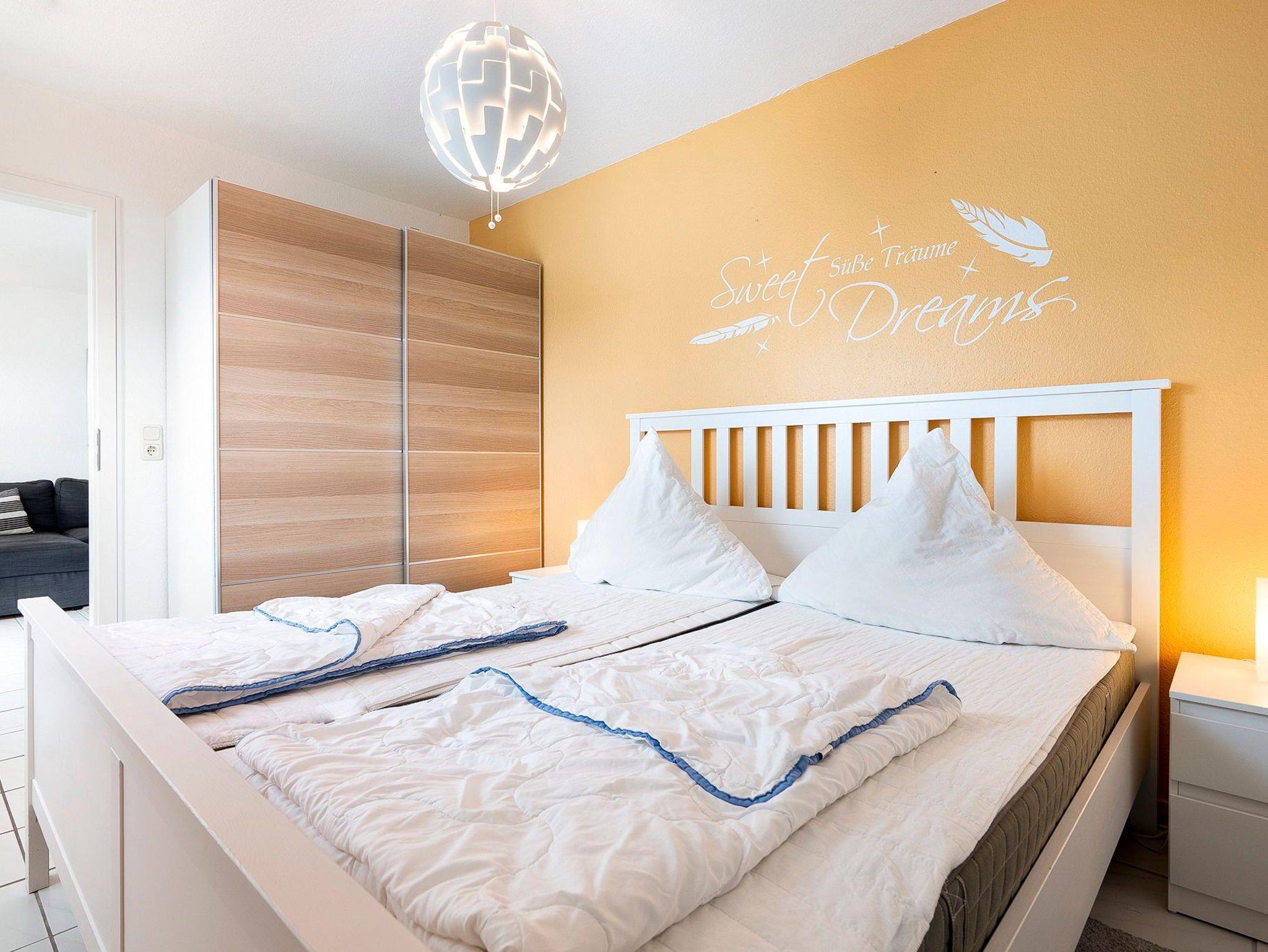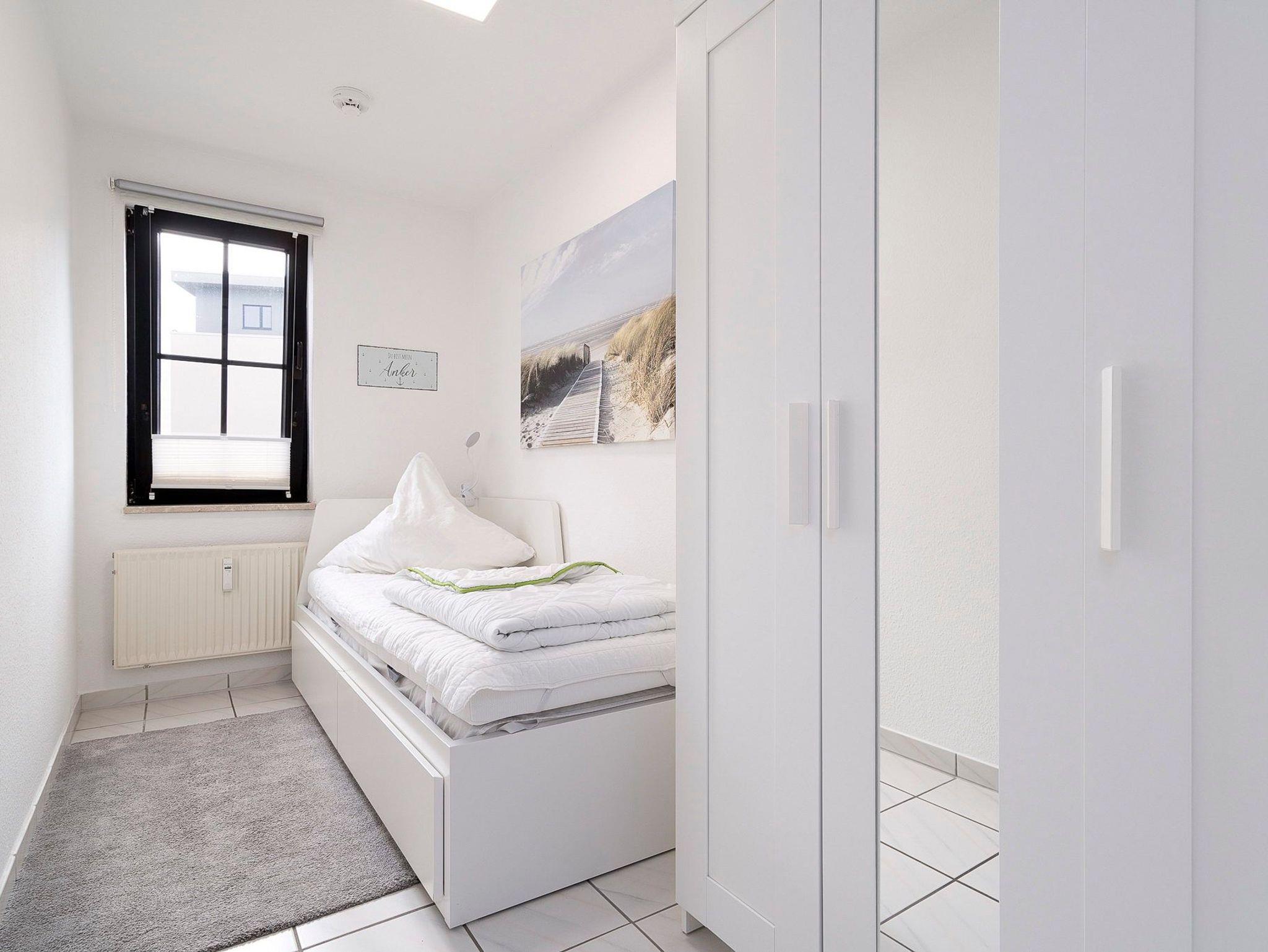 Modernes, hell gefliestes Schlafzimmer mit einem bequemen Doppelbett und einem geräumigen Kleiderschrank. Das Fenster lässt sich durch ein Innenrollo etwas verdunkeln.