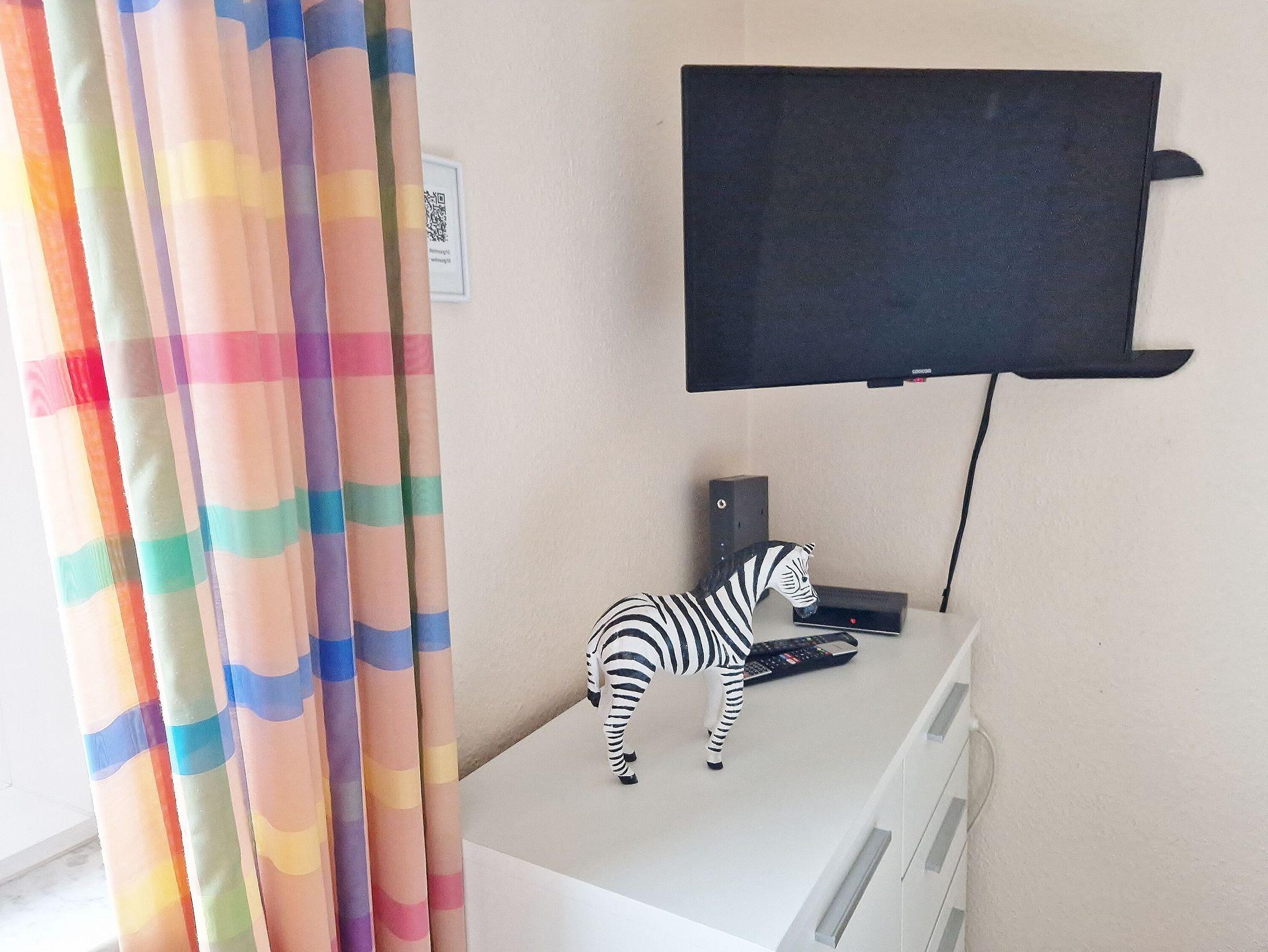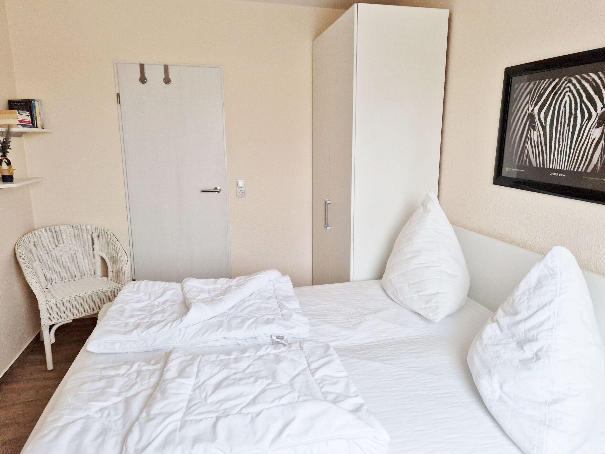 Modernes, freundliches Schlafzimmer mit direktem Zugang zum Balkon in nord-westliche Richtung. Das Schlafzimmer ist mit einem Doppelbett (2x 90x200cm), 2 Nachttischen, einem Stuhl und einem Kleiderschrank ausgestattet. Das Zimmer ist mit Laminatboden ausgelegt, die Fenster lassen sich durch einen blickdichten Vorhang verdunkeln.