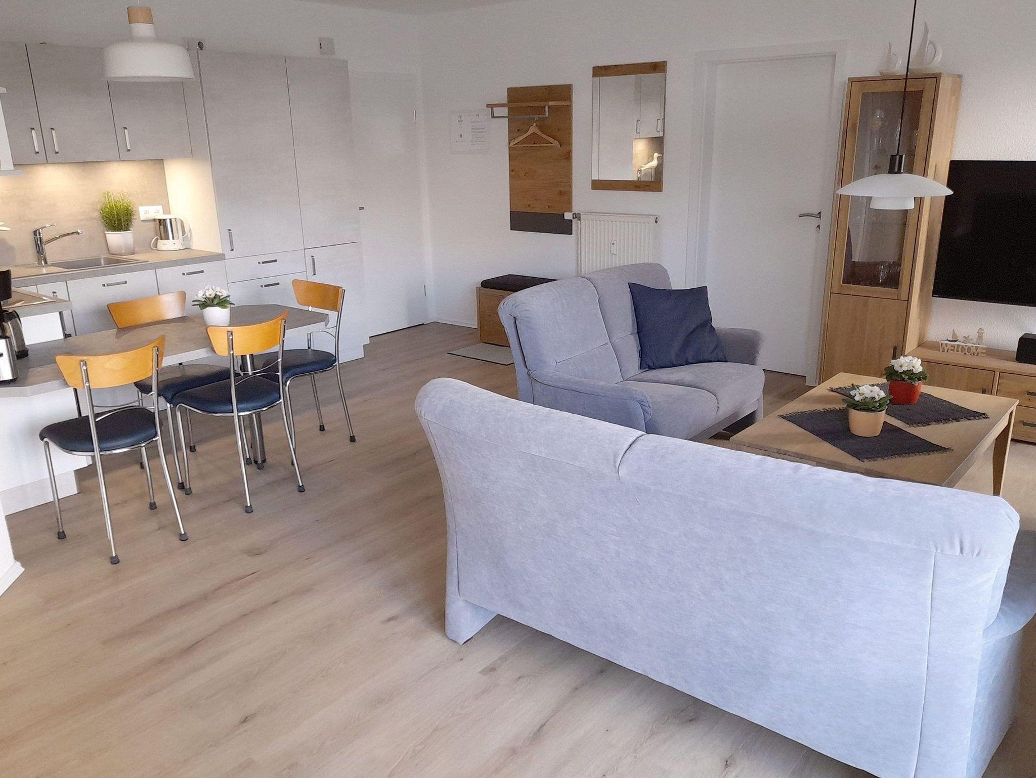 Freundliches, modernes, großzügiges Wohn- und Esszimmer mit offener Küche. Das Wohn- und Esszimmer ist mit 2 Sofas und einem Couchtisch, einem Esstisch mit 4 Stühlen und 2 Schrankbetten (je 90x200 cm)[nbsp] ausgestattet. Im Wohnzimmerbereich befindet sich ein TV-Flachbildschirm und ein Internetradio. Das Wohn-/Esszimmer ist mit Vinyl-Parkettboden ausgelegt. Vom Wohn-/Esszimmer gelangen Sie auf die große Terrasse mit kleinem Garten.