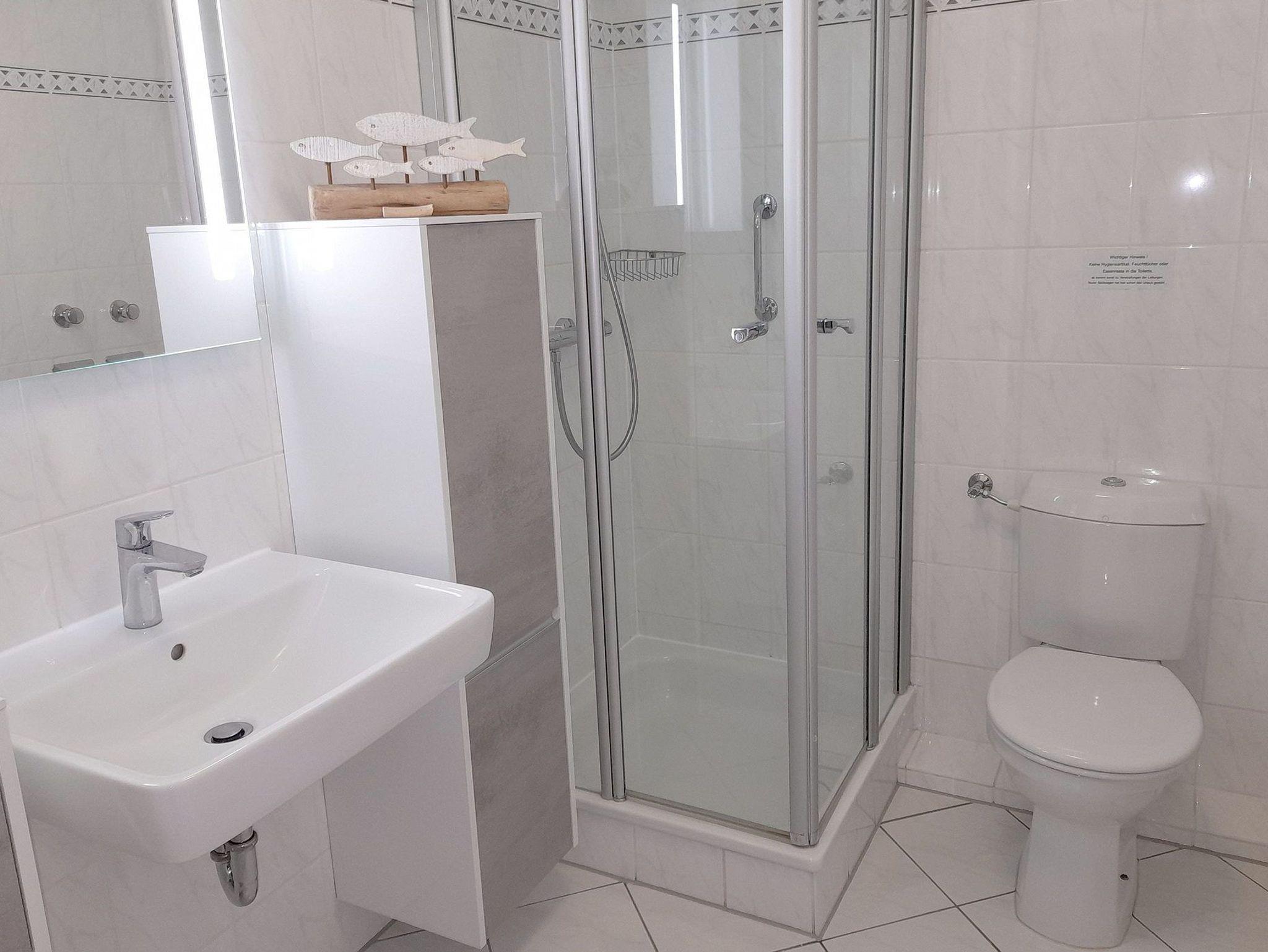 Modernes, hell gefliestes Bad mit Dusche, WC und Waschbecken.