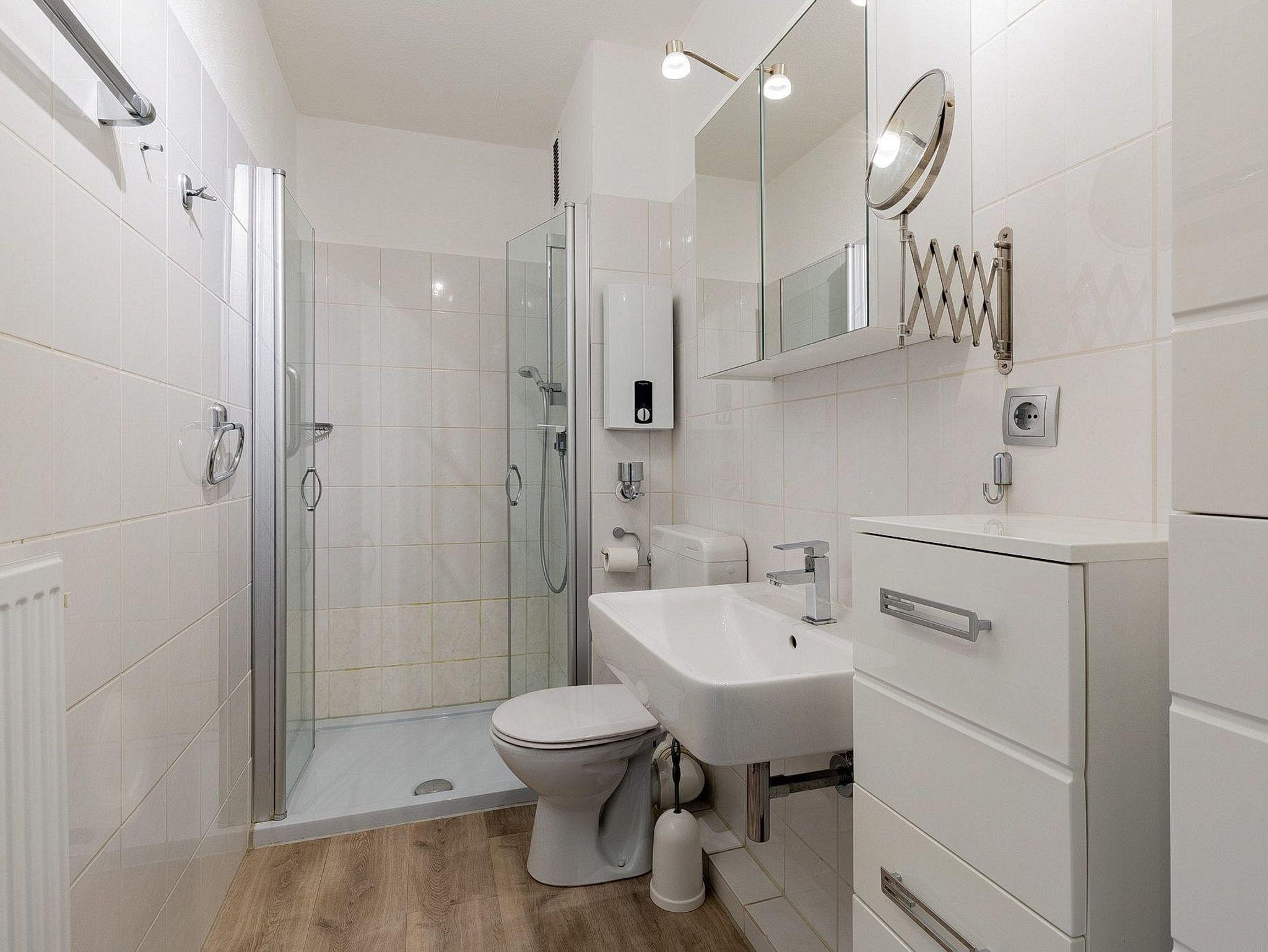 Modernes, hell gefliestes Bad mit bodentiefer Dusche (80x 100cm), WC und Waschbecken.