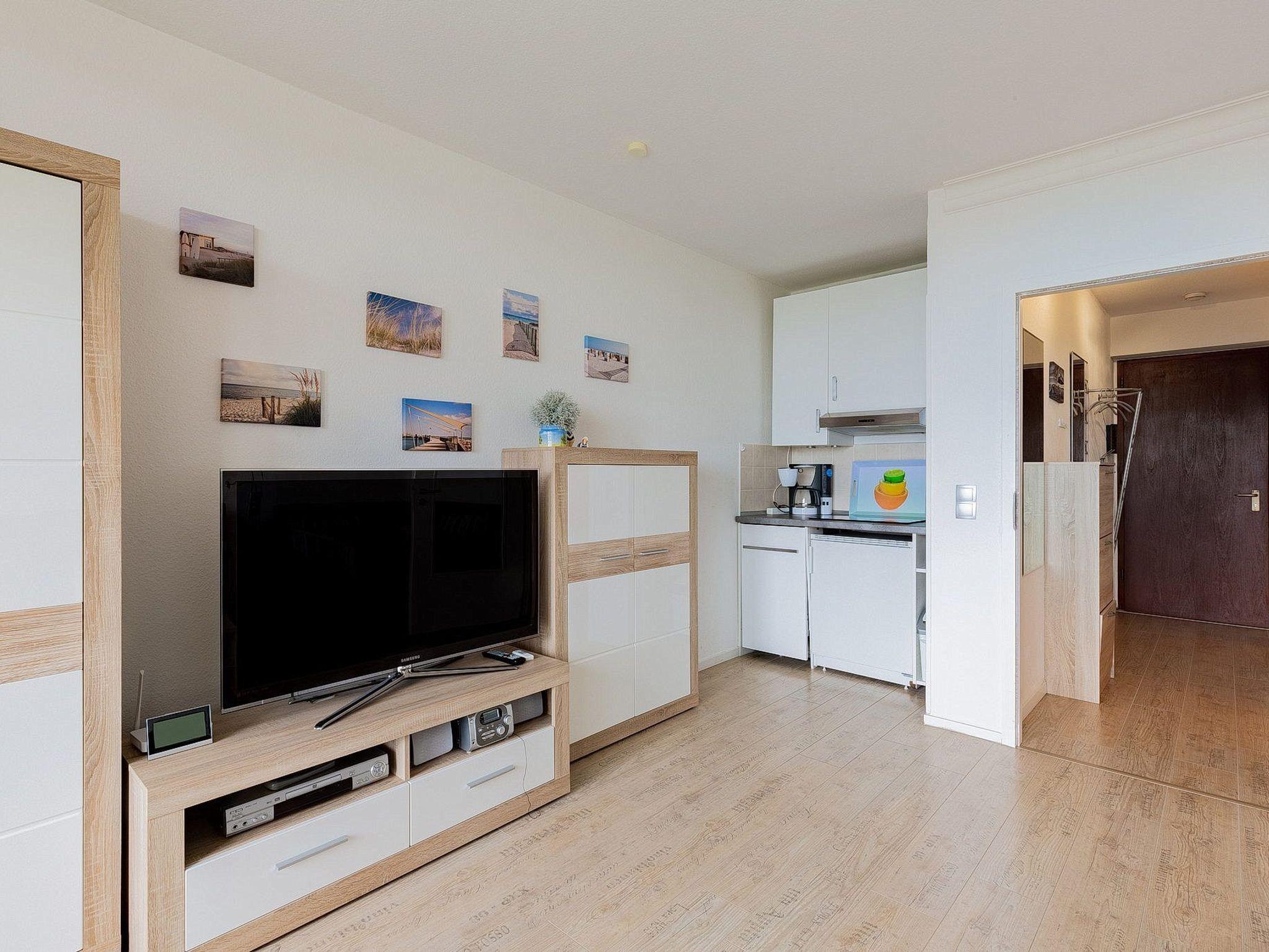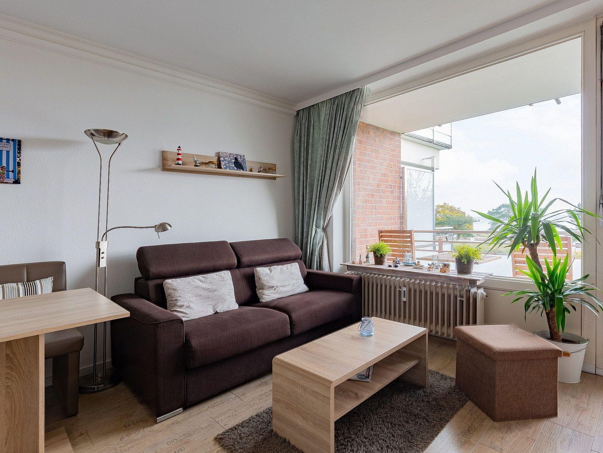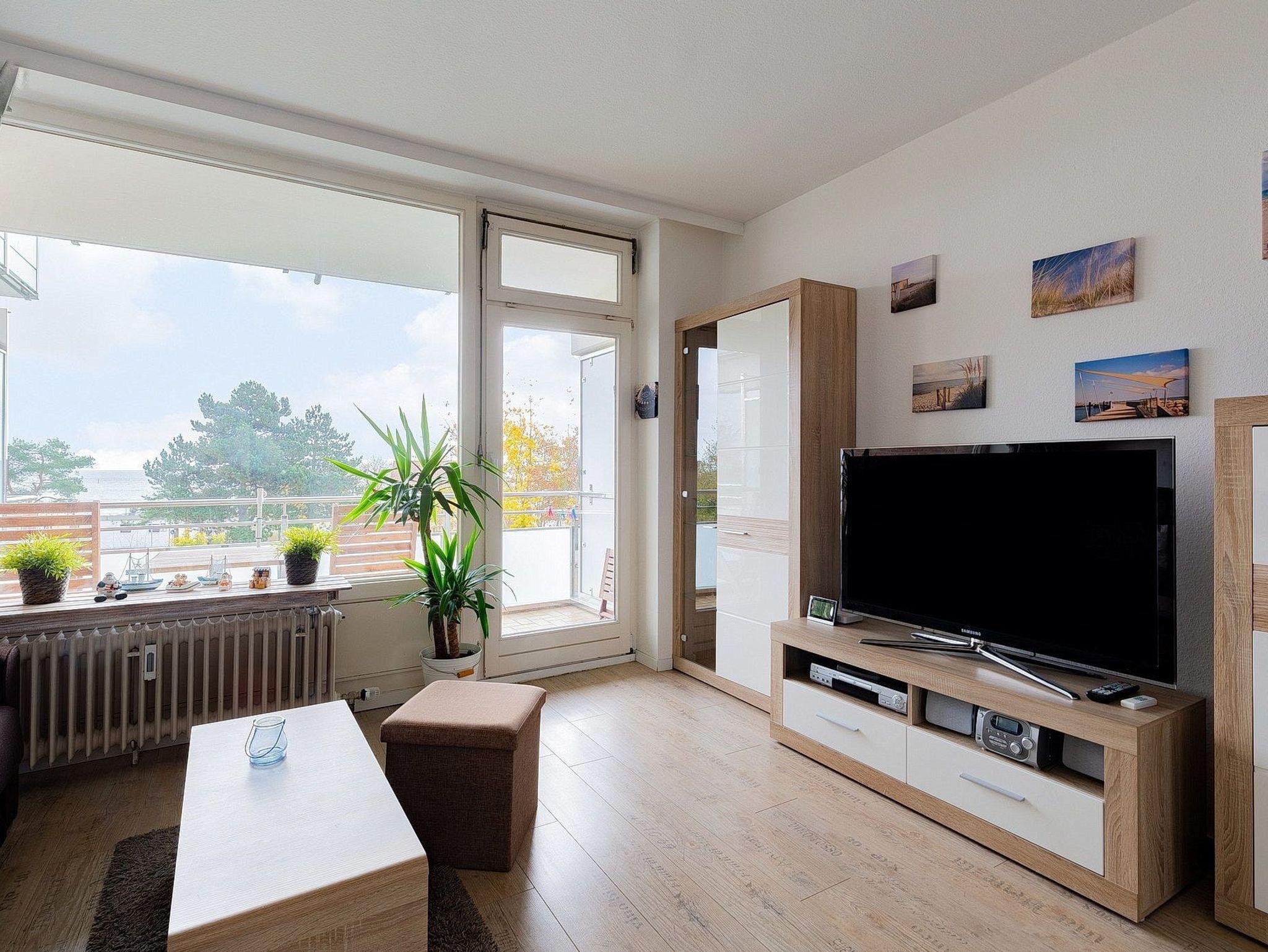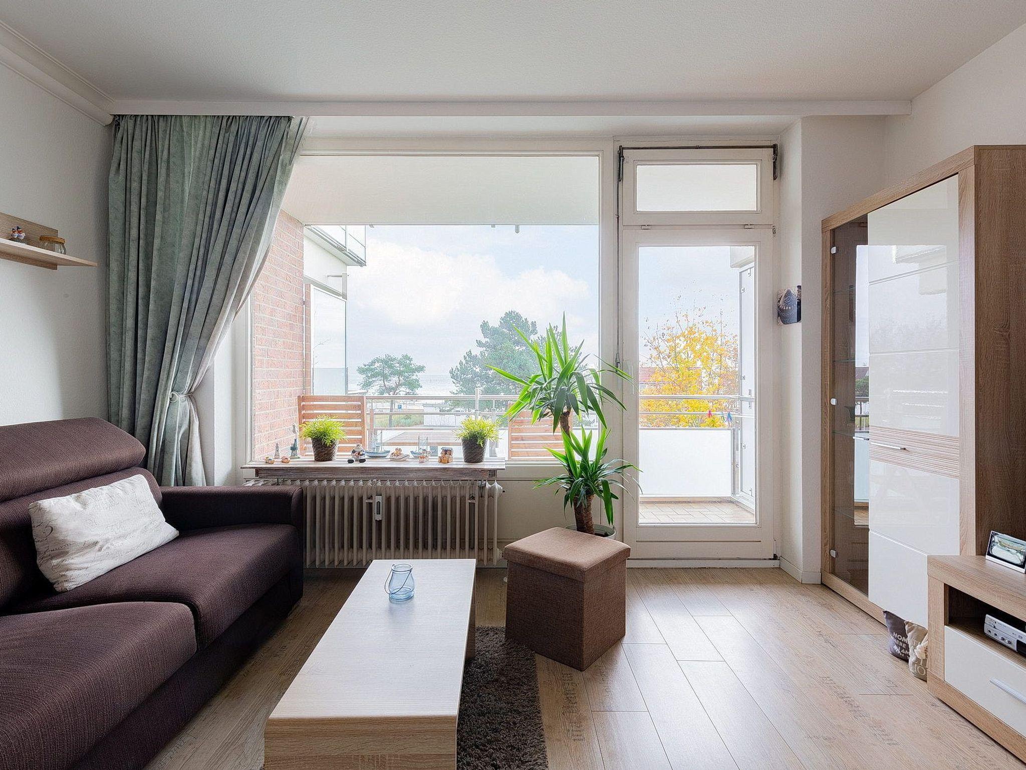 Modern ausgestattetes, helles Wohn- und Esszimmer mit direktem Zugang zum Balkon in süd-östliche Richtung mit Blick auf das Meer. Als Sonnenschutz auf dem Balkon steht Ihnen eine Markise zur Verfügung. Das Wohn- und Esszimmer ist mit einem 2er-Sofa, einem Couchtisch, einem Essplatz für 3 Personen und einem Wohnzimmer-Schrankelement ausgestattet. Zur Unterhaltung stehen ein Flachbildfernseher und ein Radio zur Verfügung. Das Wohn- und Esszimmer ist mit Laminatboden ausgelegt, das Fenster lässt sich durch einen Vorhang blickdicht verdunkeln.