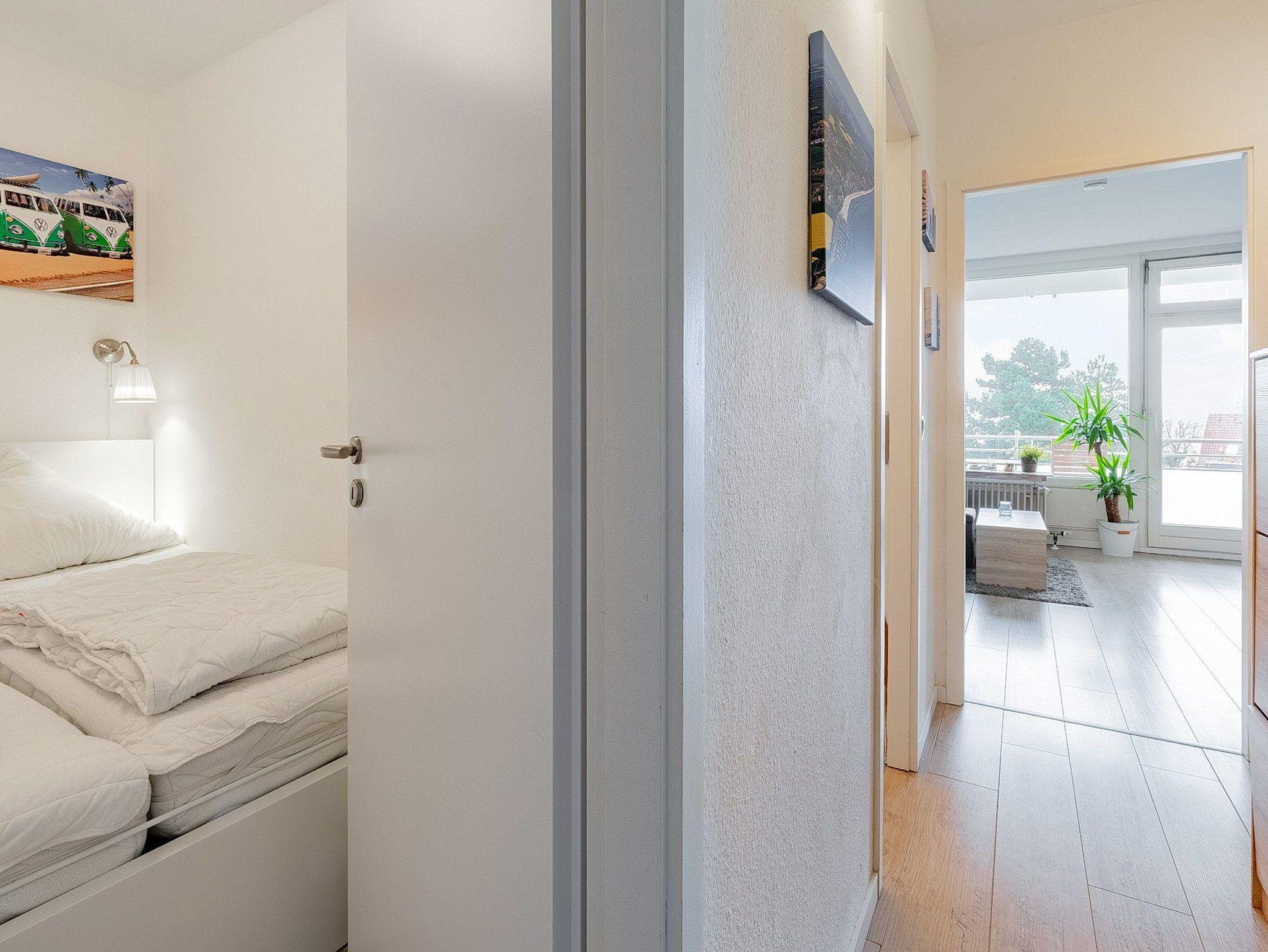 Das separate, modern ausgestattete Schlafzimmer ist mit einem Doppelbett (2x 80x200cm) und einem großen Kleiderschrank ausgestattet. Das Schlafzimmer ist mit Laminatboden ausgelegt, das Fenster zum Laubengang lässt sich durch ein Innenrollo verdunkeln