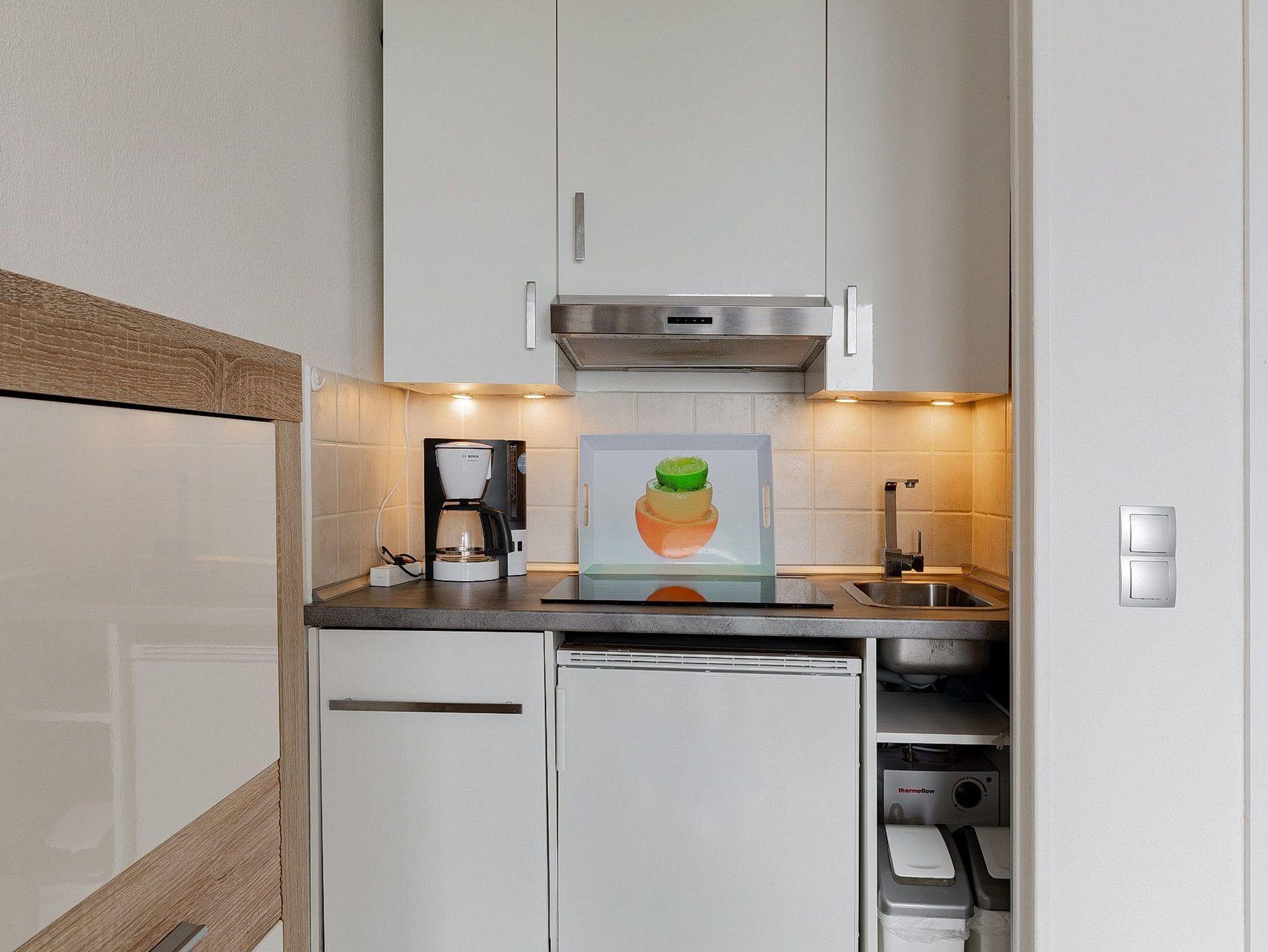 Moderne, zum Wohn- und Esszimmer offene, kleine Küchenzeile. Die komplett ausgestattet Küche verfügt über einen 4 Platten Induktionsherd, Abluft nach Außen mit 3 Stufen, einer Mikrowelle, einem Kühlschrank mit einem kleinen 3-Sterne Gefrierfach, einem Toaster, einem Wasserkocher und einer Kaffeemaschine. Ebenfalls ist die Küche mit einem Geschirrspüler ausgestattet.