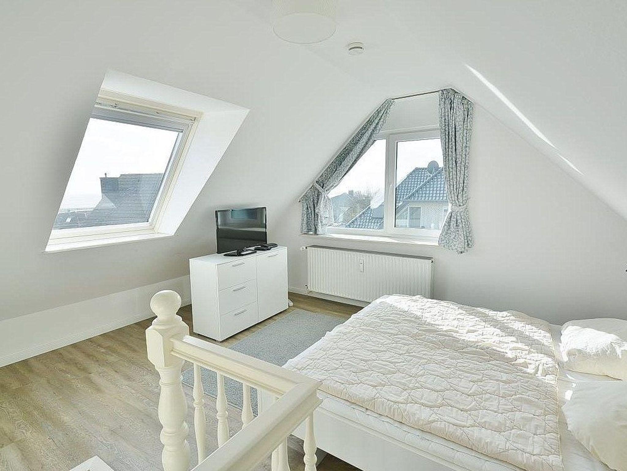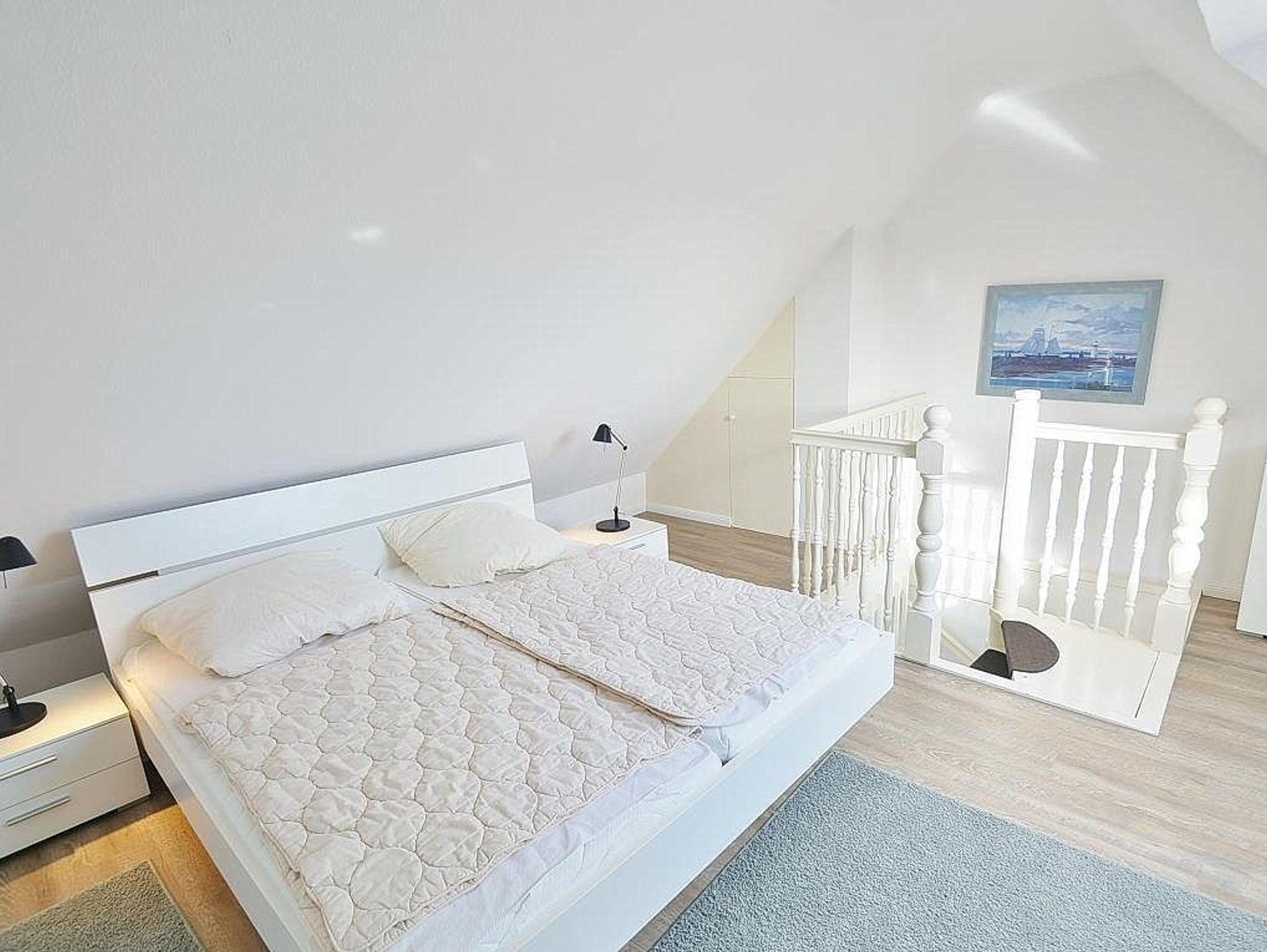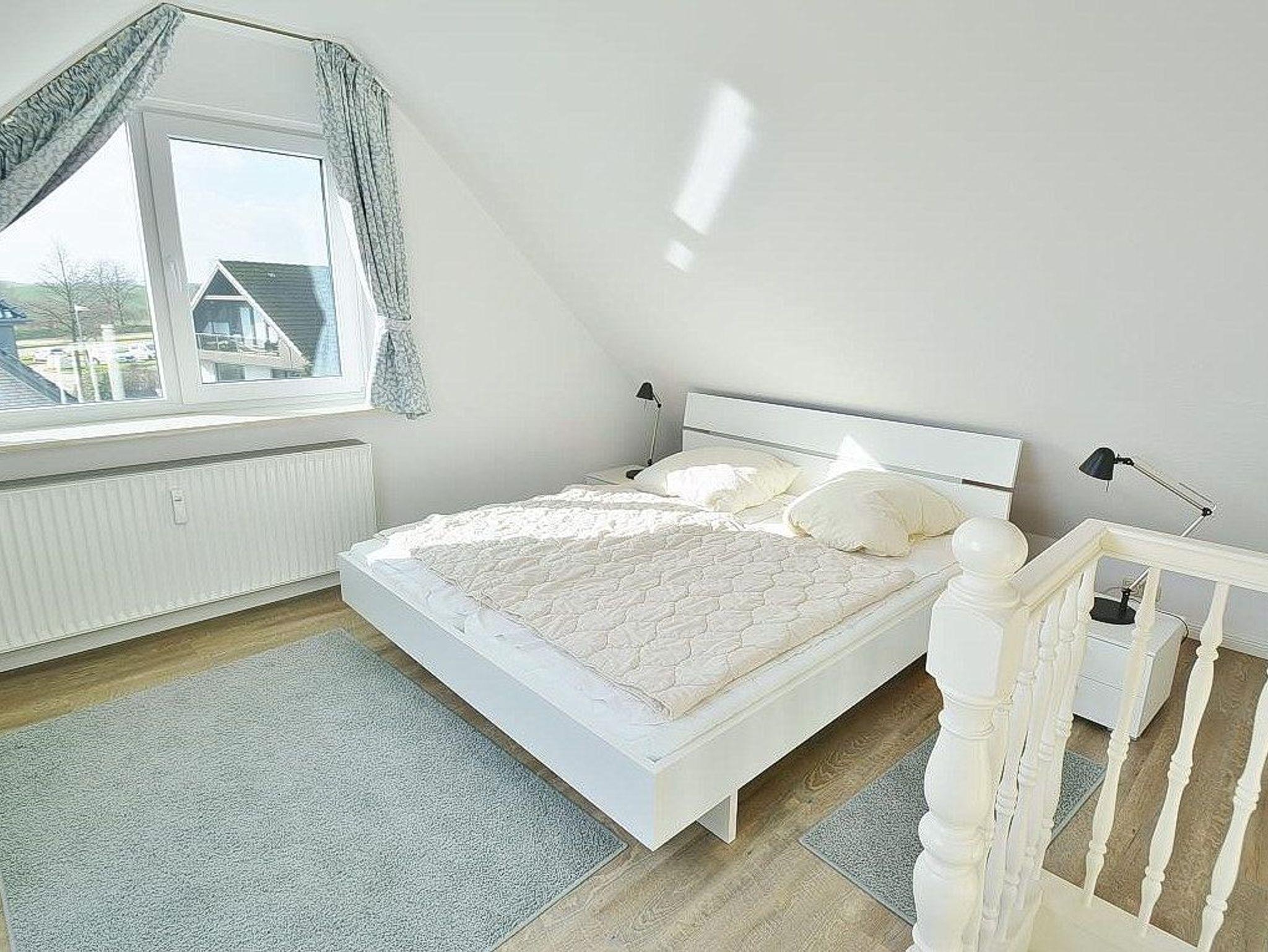 Das Schlafzimmer im 2. OG ist über eine Wendeltreppe erreichbar. Das Schlafzimmer ist mit einem Doppelbett (2x 90x200cm) und 2 Kommoden ausgestattet. Die Fenster lassen sich durch ein Innenrollo bzw. einem blickdichten Vorgang fast vollständig verdunkeln. Das Zimmer ist mit Vinylboden ausgelegt. Zur Unterhaltung steht ein Fernseher ( nur öffentlich rechtliche Sender) zur Verfügung.