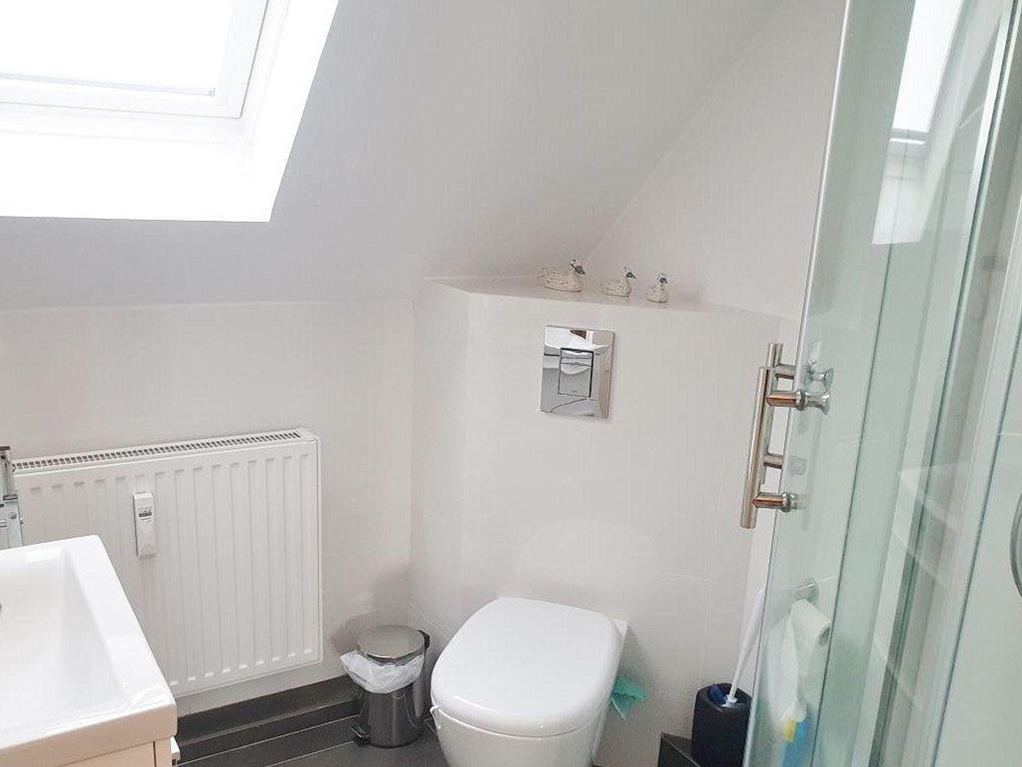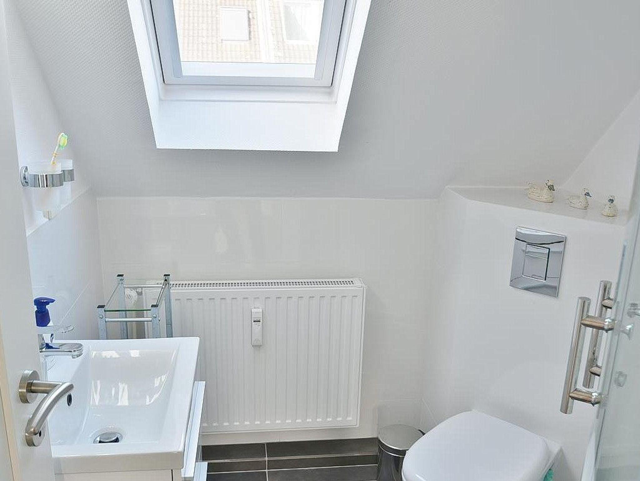 Baulich bedingt fällt das helle, freundliche Tageslichtbad eher klein und die Dusche schmal aus. Des Weiteren verfügt das Bad über ein WC und ein Waschbecken.