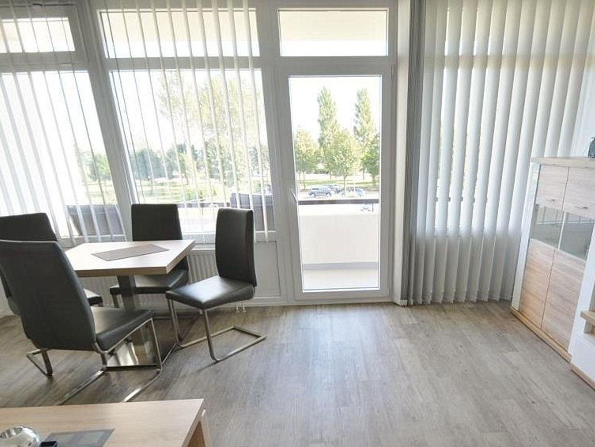 Heller moderner Wohnbereich mit direktem Zugang zum Balkon. Das Wohnzimmer ist mit einem gemütlichen Ecksofa mit Schlaffunktion (190x200cm) sowie einem Essplatz für 4 Personen ausgestattet. Zur Unterhaltung stehen ein Flachbildfernseher und eine Stereoanlage zur Verfügung. Der Raum ist mit Designerplanken ausgelegt. Die Fenster lassen sich durch Lamellen verdunkeln.