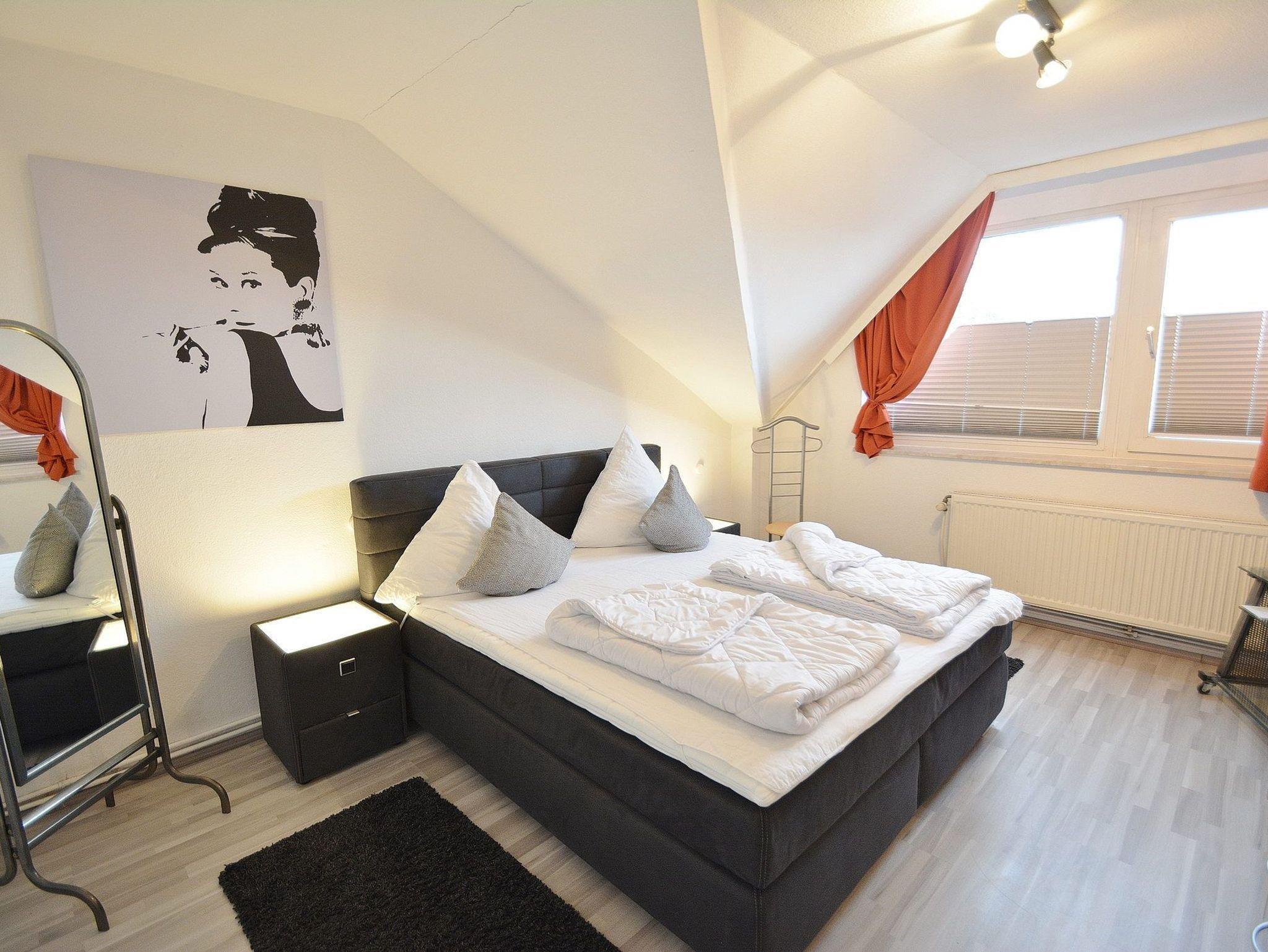 Das moderne, freundliche Schlafzimmer ist mit einem Doppelbett (180 x 200 cm), einem großen Kleiderschrank mit Spiegel ausgestattet. Das Schlafzimmer ist mit Laminatboden ausgelegt. Das Fenster lässt sich durch Blickdichte Gardinen verdunkeln.