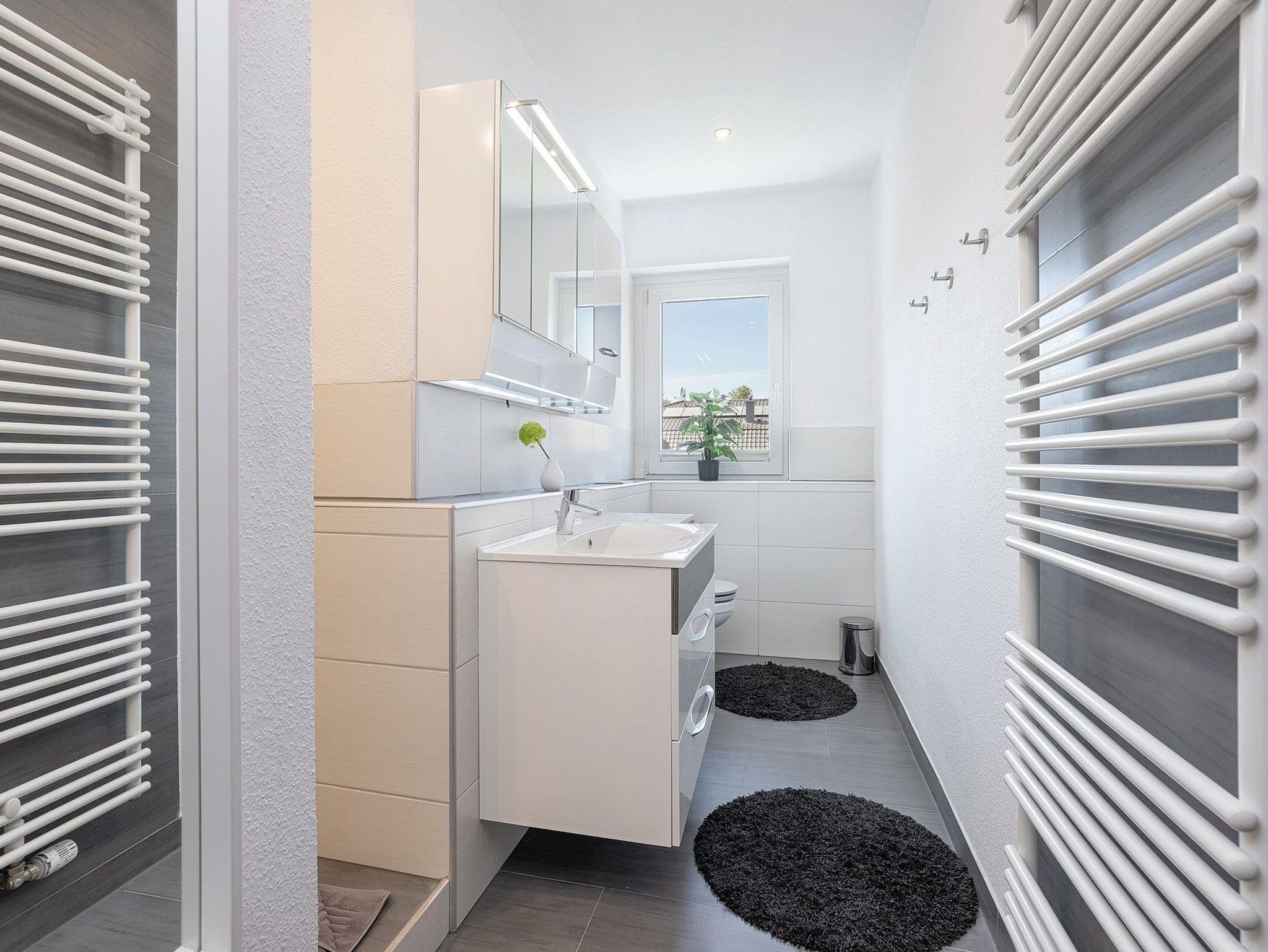 Modernes, geräumiges, freundliches Tageslichtbad mit WC, Waschbecken und Dusche.