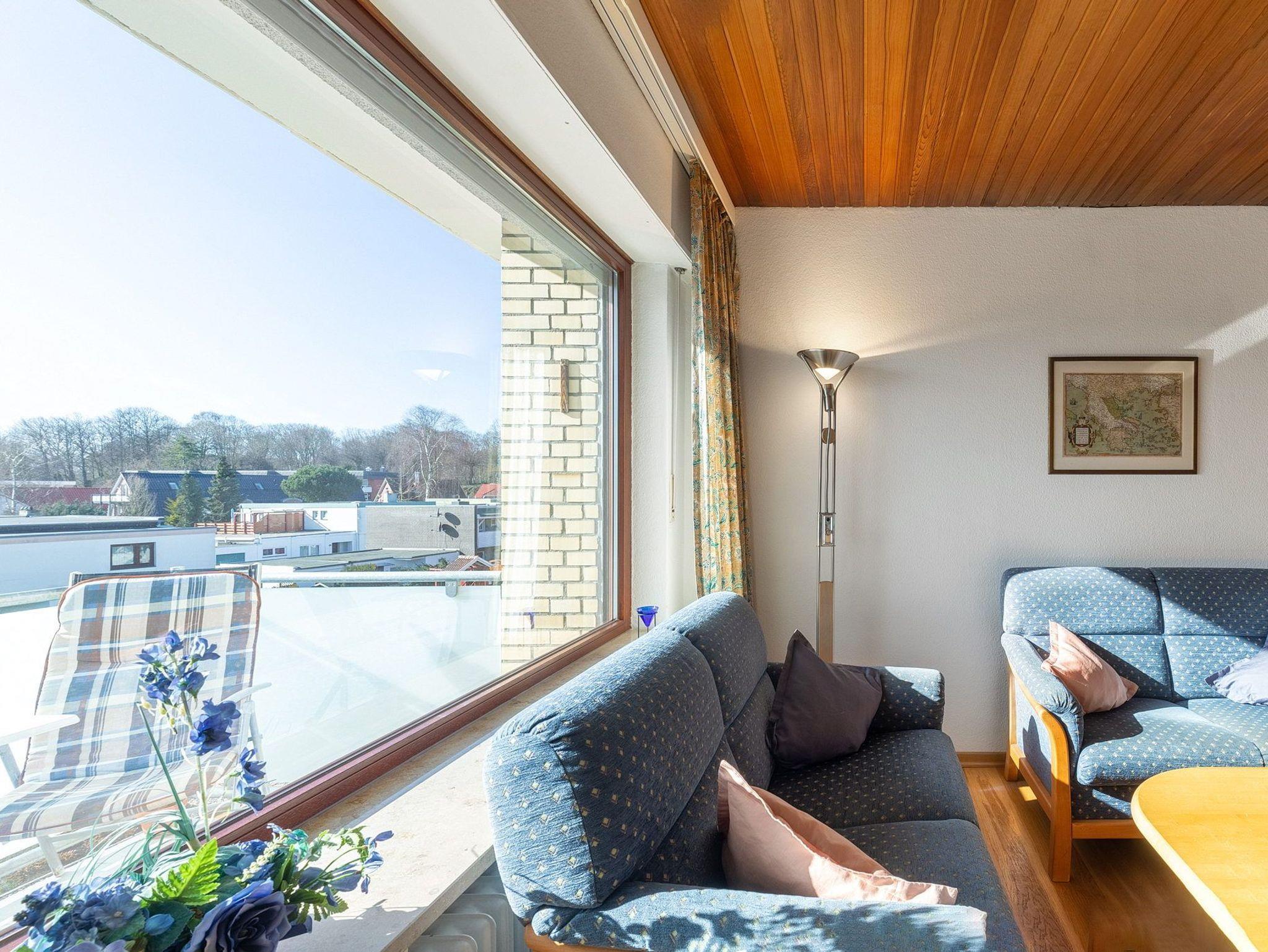 Balkon mit Markise in südliche Richtung mit Blick über die Dächer von Grömitz, PKW-Stellplatz vor dem Gebäude, Fahrrad-Ständer vor dem Gebäude. Ein Kinderhochstuhl steht kostenlos zur Verfügung.