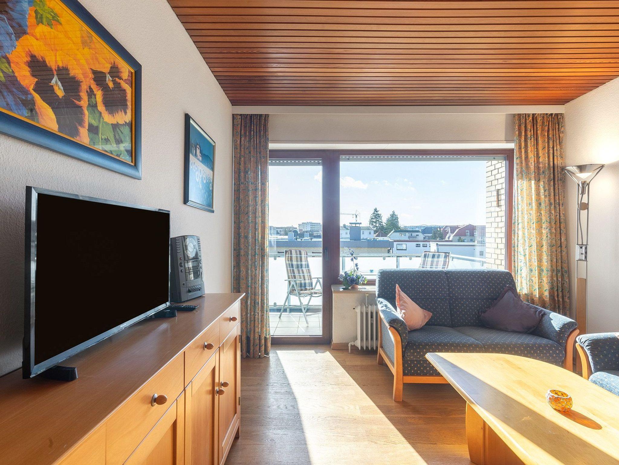 Freundliches Wohn- und Esszimmer mit direktem Zugang zum Balkon. Das Wohn- und Esszimmer ist mit einem Essplatz für 4 Personen, einer Kommode und 2 Couchen ausgestattet. Zur Unterhaltung stehen ein Fernseher und eine Mini-Stereoanlage mit CD-Player zur Verfügung. Das Wohn- und Esszimmer ist mit Parkett-Boden ausgelegt, das Fenster lässt sich durch ein Außenrollo vollständig verdunkeln.