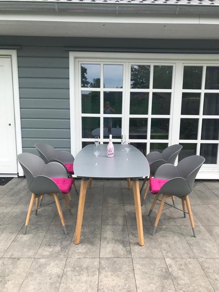 Der Garten ist komplett eingezäunt, hat einen Grillkamin, Terrassenmöbel und Sonnenliegen.