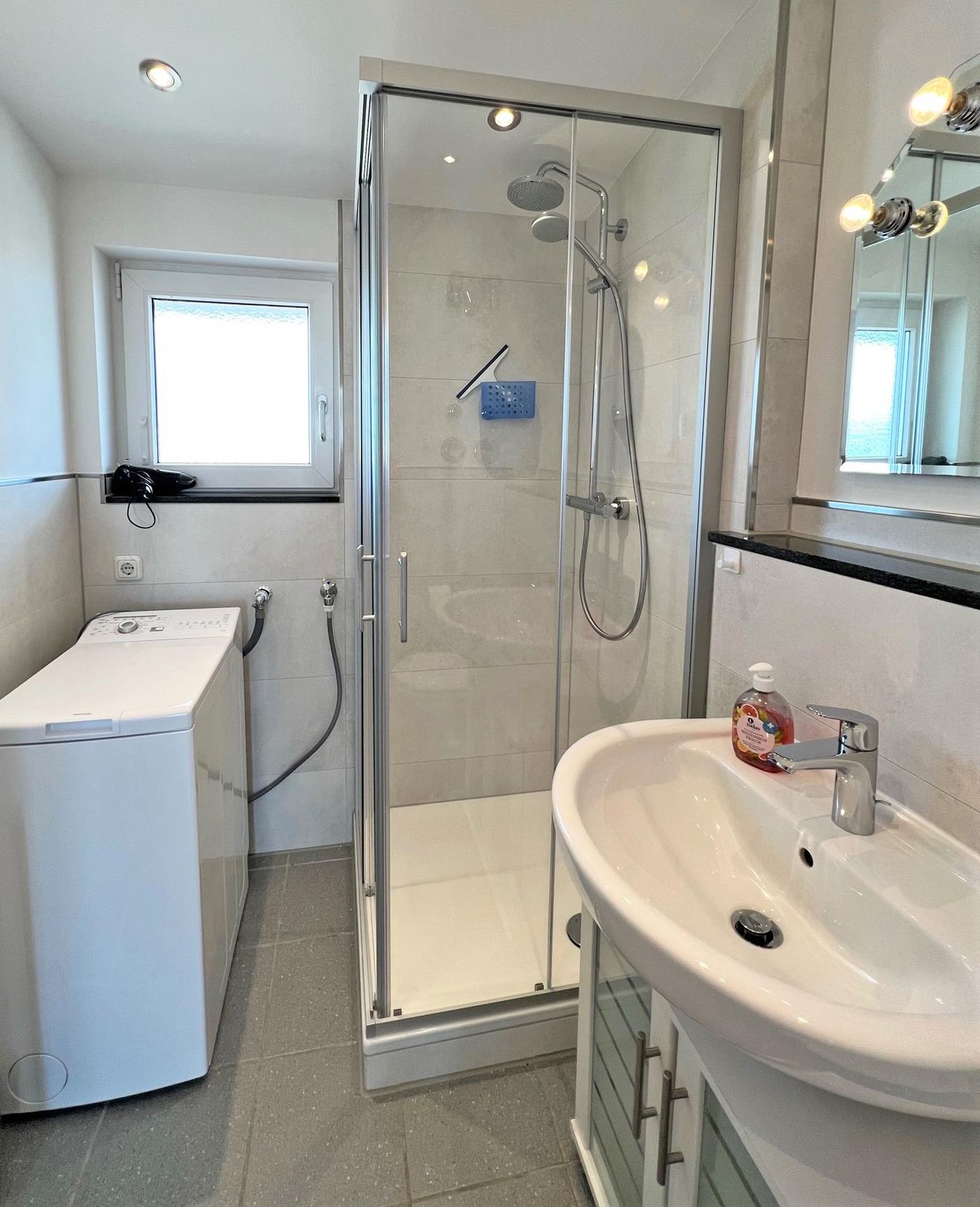 Das Duschbad ist hell gefliest und bietet Ihnen ein WC, ein Waschbecken sowie eine Eckdusche.