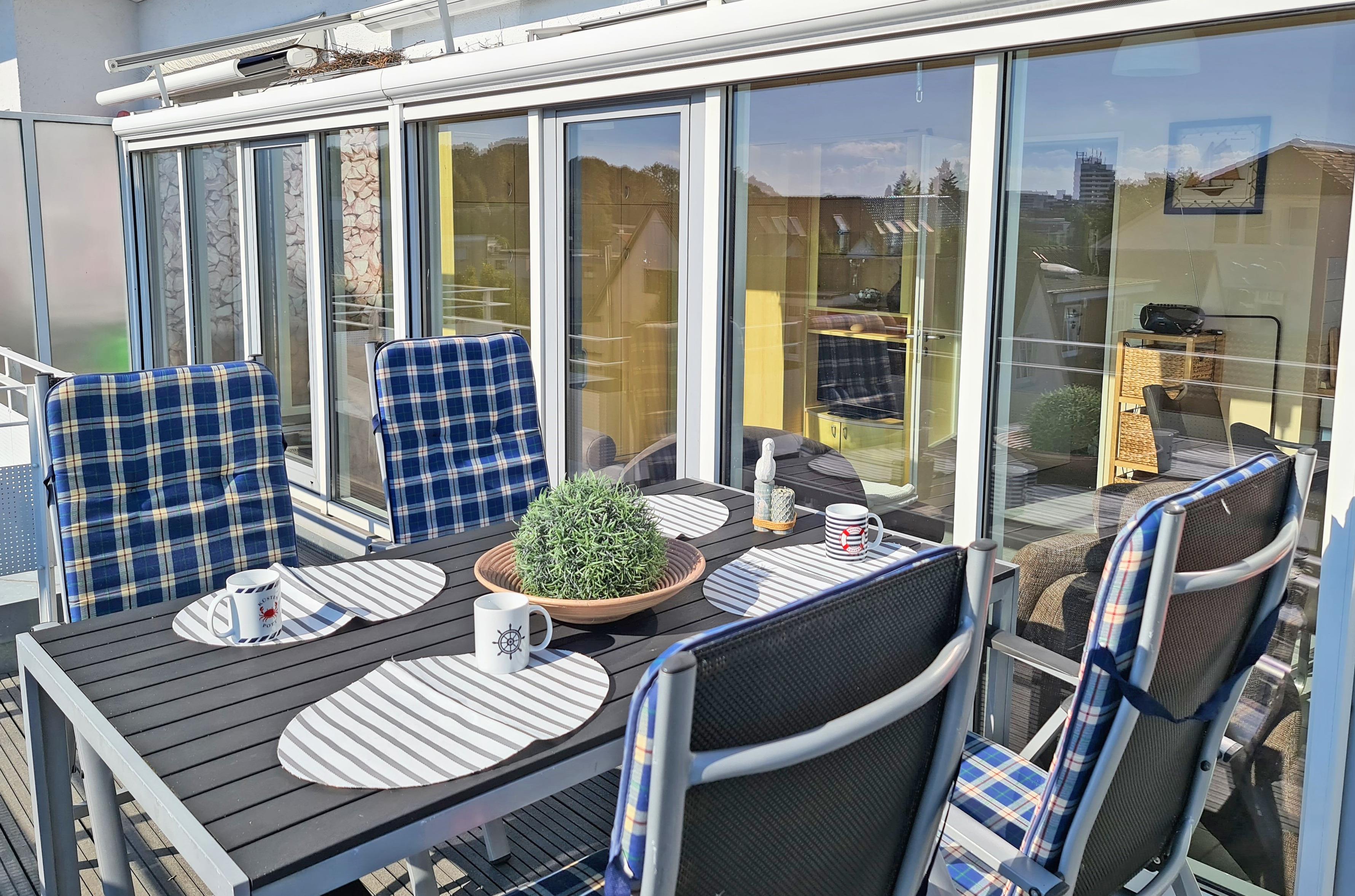 Im hellen Wohnzimmer erwartet Sie eine gemütliche Eckcouch (Schlafcouch), ein Radio, ein TV sowie eine geräumige Schrankwand. Die Wintergarten ähnliche Gestaltung im Wohnzimmer bietet Ihnen einen besonders schönen Ausblick über Grömitz in Richtung Ostsee. Von hier aus gelangen Sie auf die möblierte Süd-Ost-Dachterrasse.