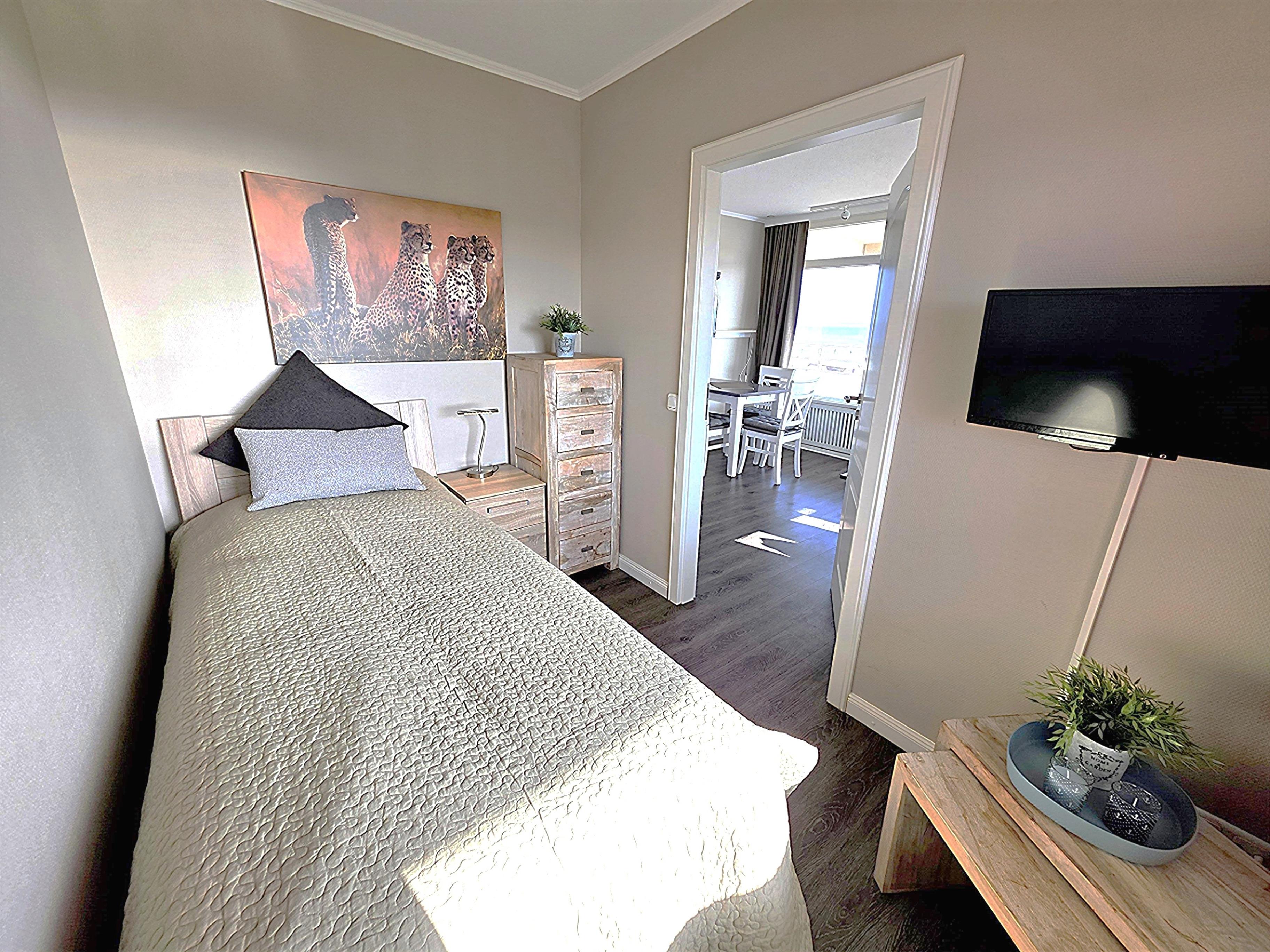 Vom Wohnzimmer gelangen Sie weiter in das separate Kinderzimmer, das über ein Einzelbett und einen Flach-TV verfügt.