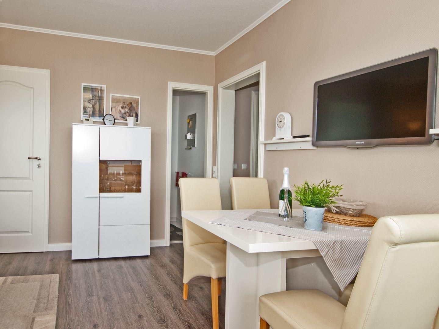 Der großzügige Wohn-/ Essbereich bietet eine Couchgarnitur für gemütliche Abende. Zur Unterhaltung steht Ihnen ein Flach-TV/Radio zur Verfügung.