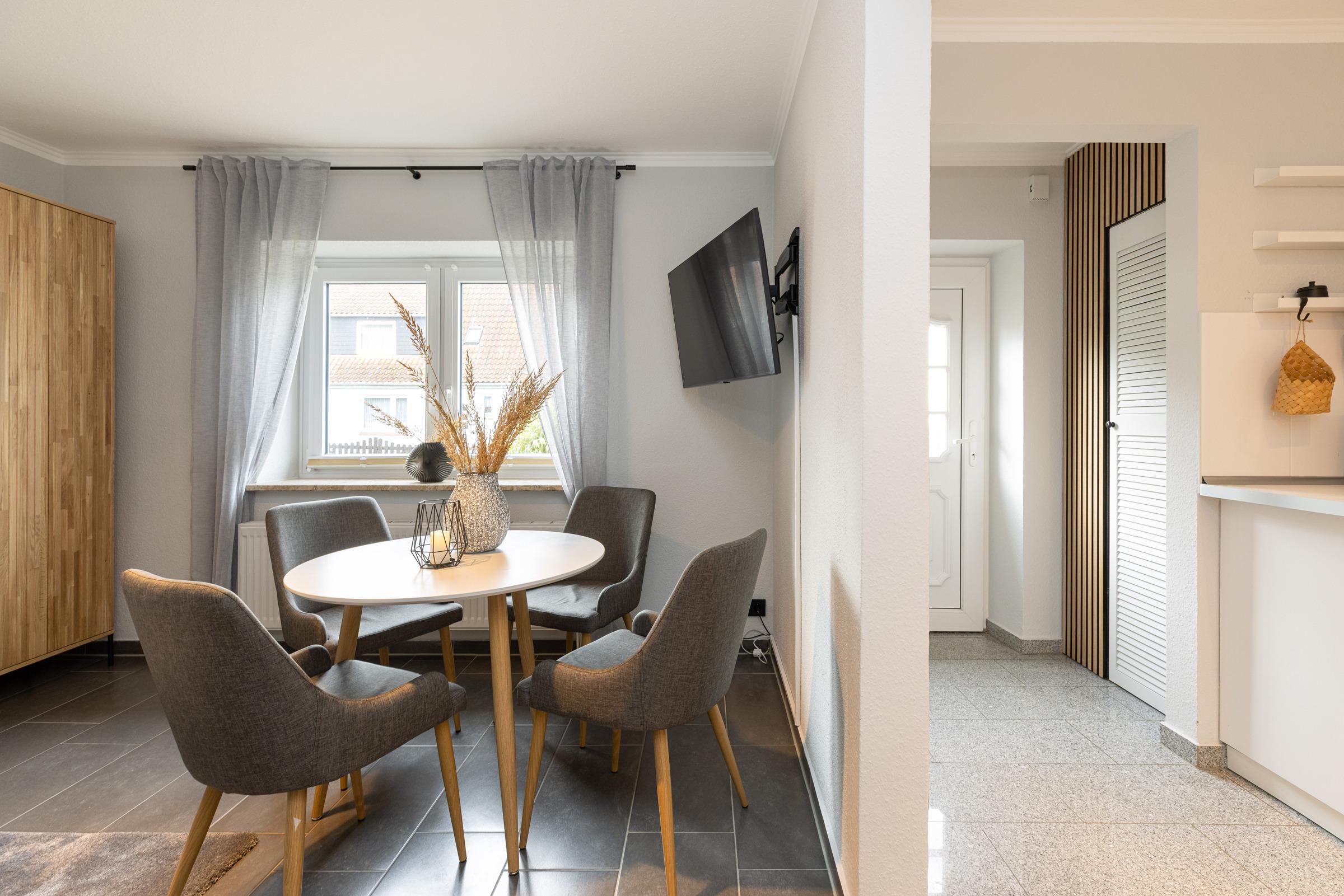Es empfängt Sie ein freundlicher Wohnraum mit Winkelcouch, Tisch und einladendem Ambiente. Die integrierte Essecke liegt direkt am Fenster und in unmittelbarer Nähe der offenen Küche.