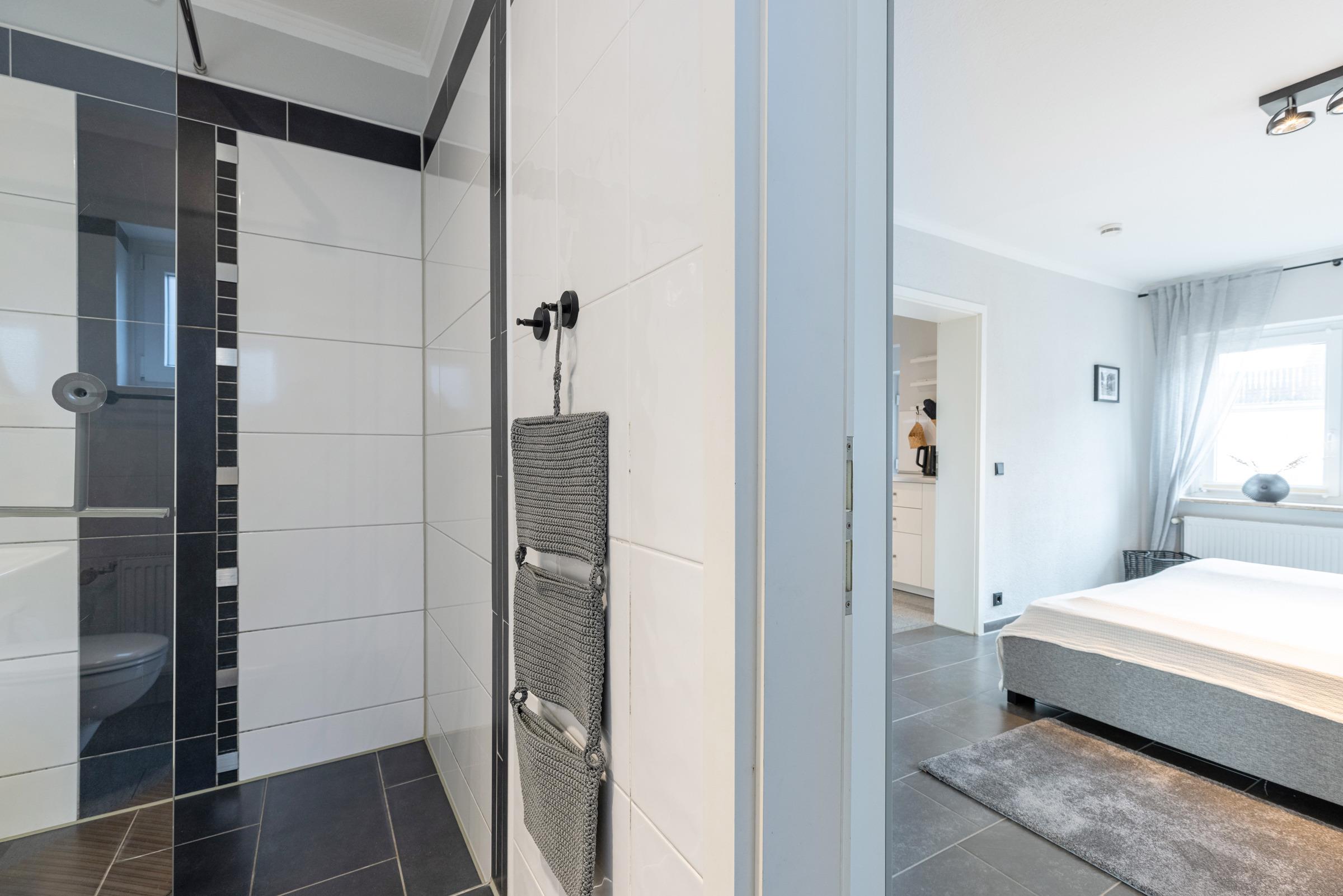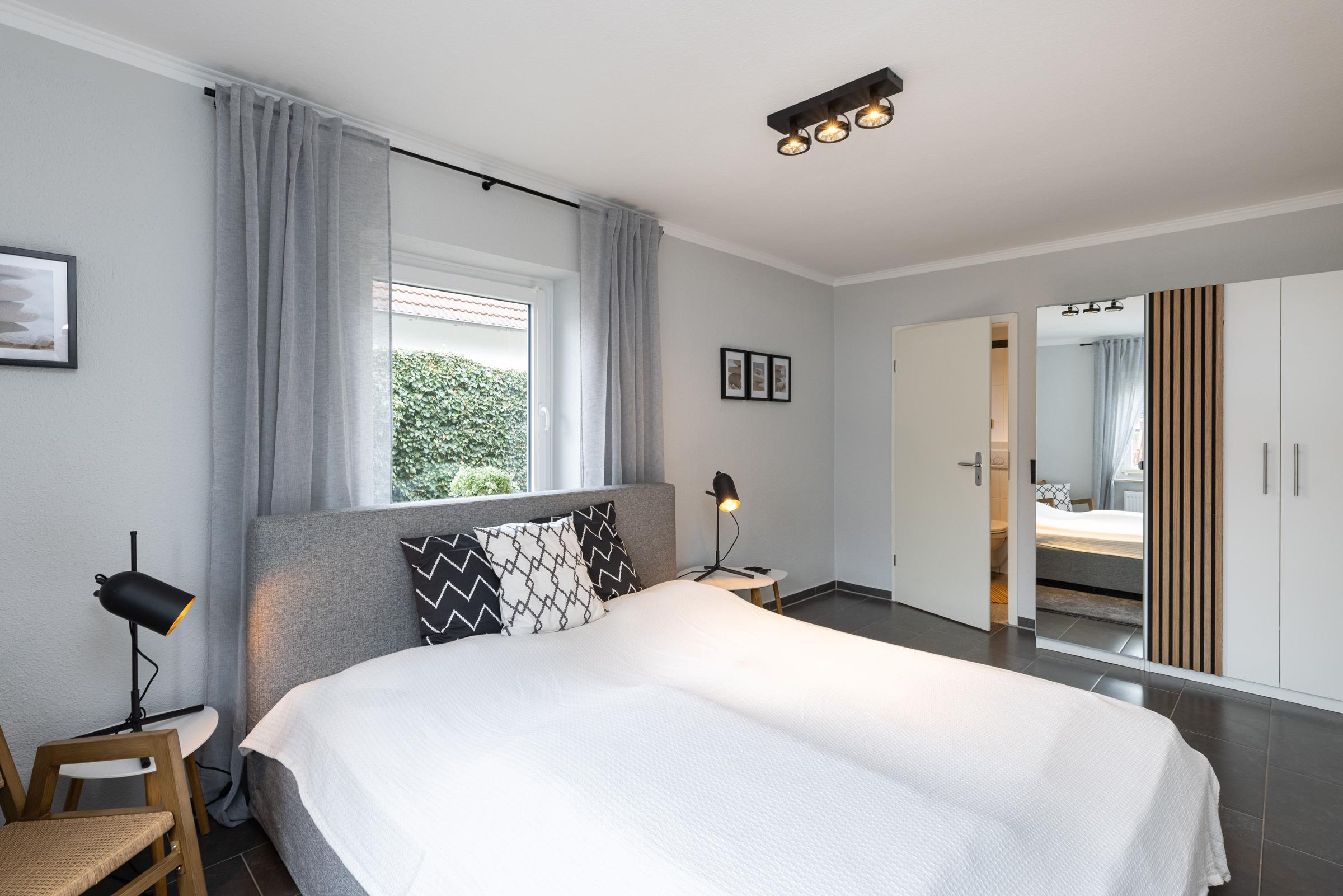 Zur Linken liegt der großzügige erste Schlafraum mit Doppelbett (180x200 cm), großem Kleiderschrank und kleiner Sitzgelegenheit am Fenster. Das angeschlossene Duschbad wird über dieses Schlafzimmer erreicht. Die Wohnung ist daher insbesondere für Familien geeignet.