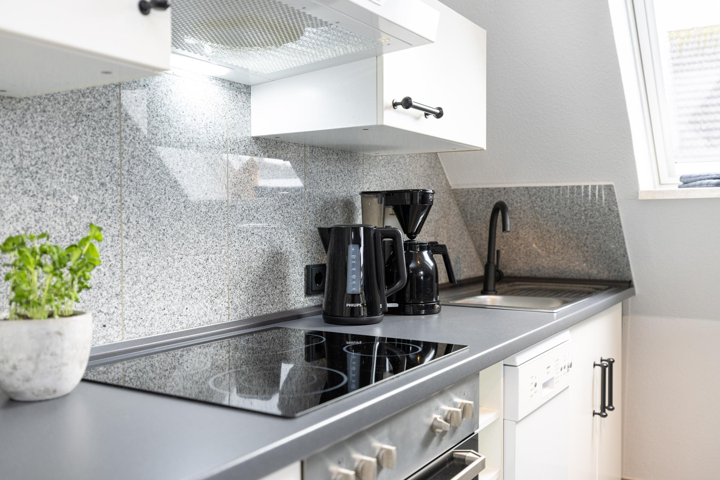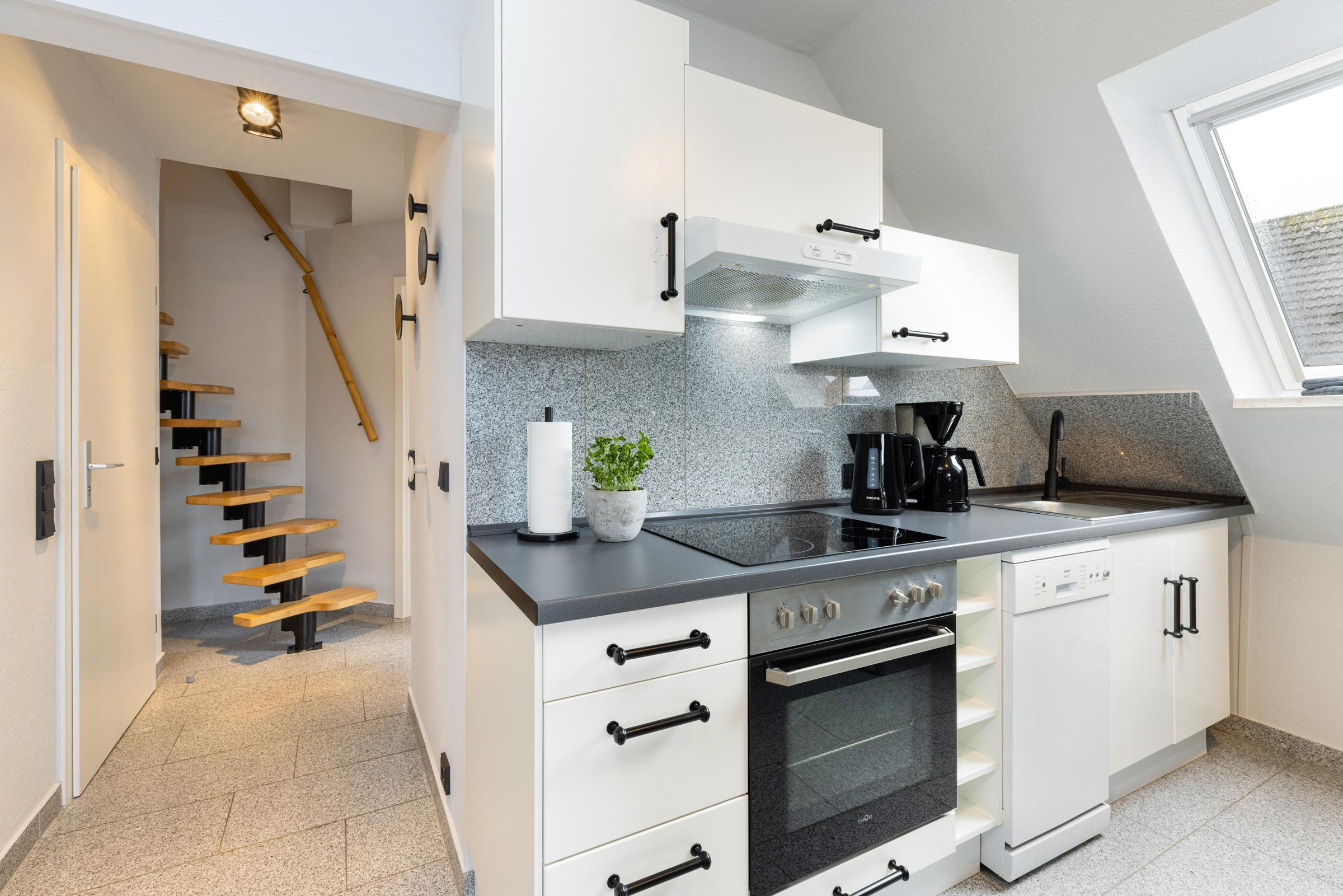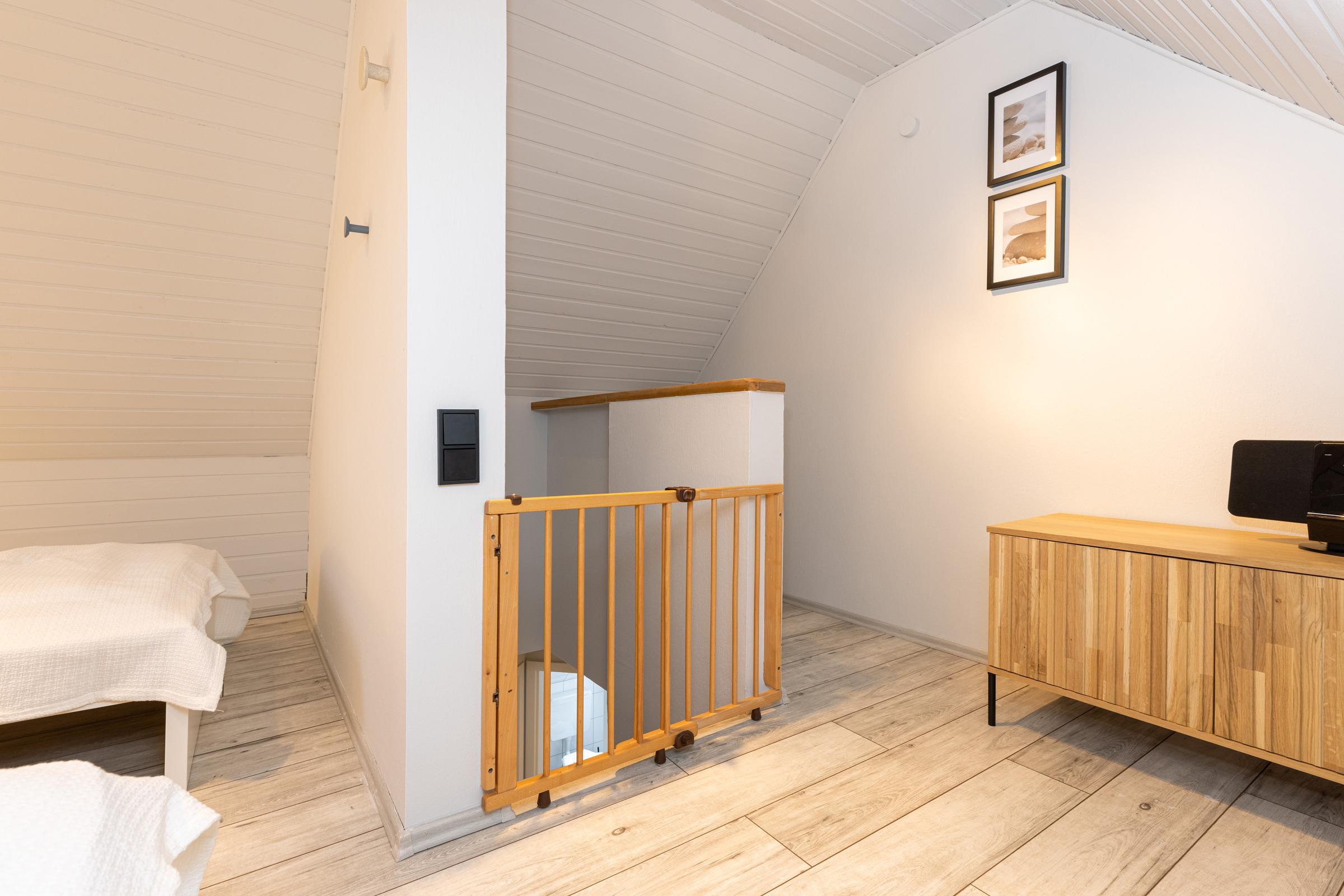 Wohnraum mit Essbereich, Einbauküche mit Esstresen, 1. Schlafraum mit Doppelbett (180 x 200 cm), 2. Schlafraum in der Galerie mit 2 Einzelbetten ist über eine Raumspartreppe erreichbar (für Kleinkinder eher nicht geeignet), Balkon, SAT-TV, DVD-Player, Dusche/WC, Garten, Fahrrad-Abstellraum, WLAN + Parkplatz für 1 PkW vorhanden und inklusive.
