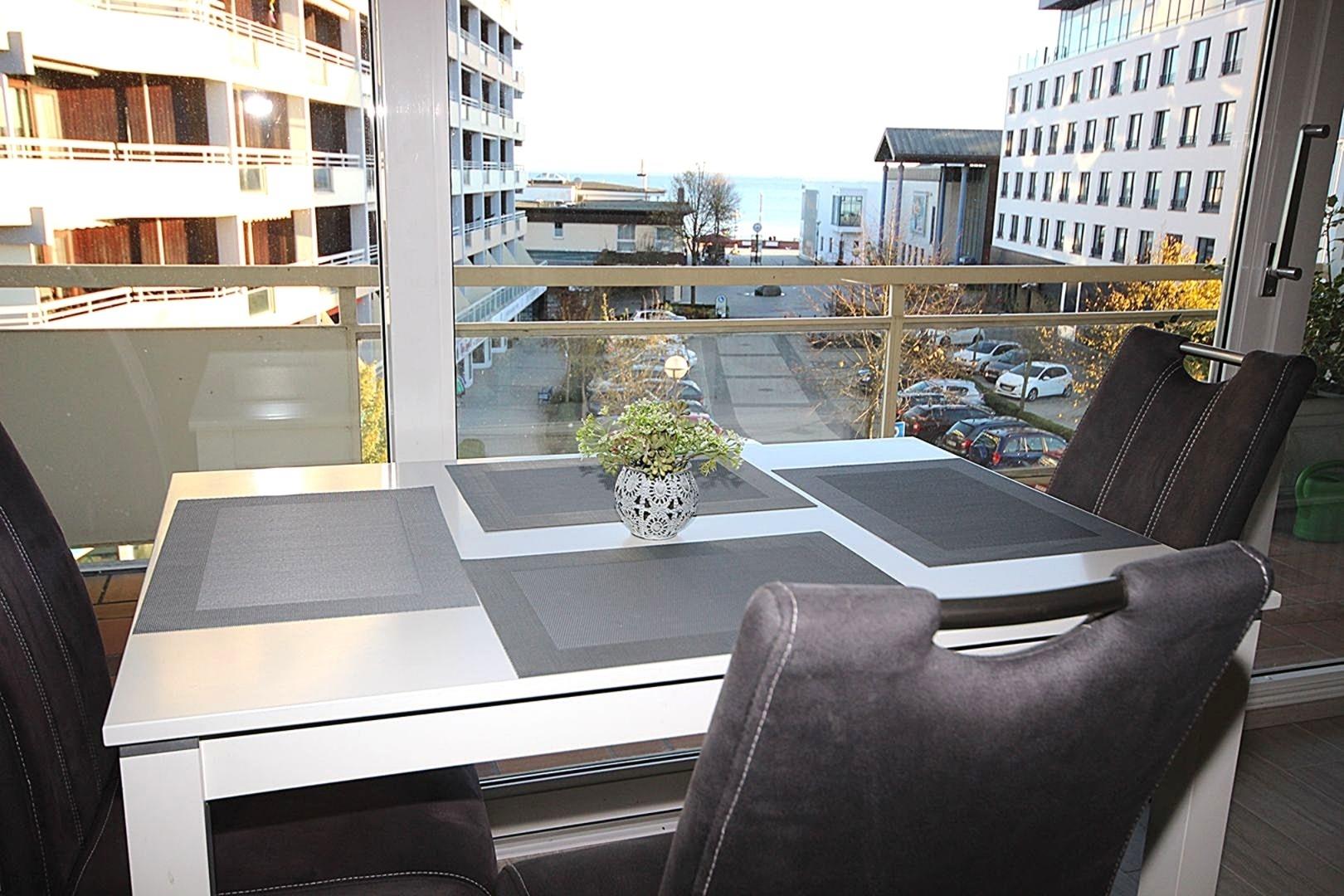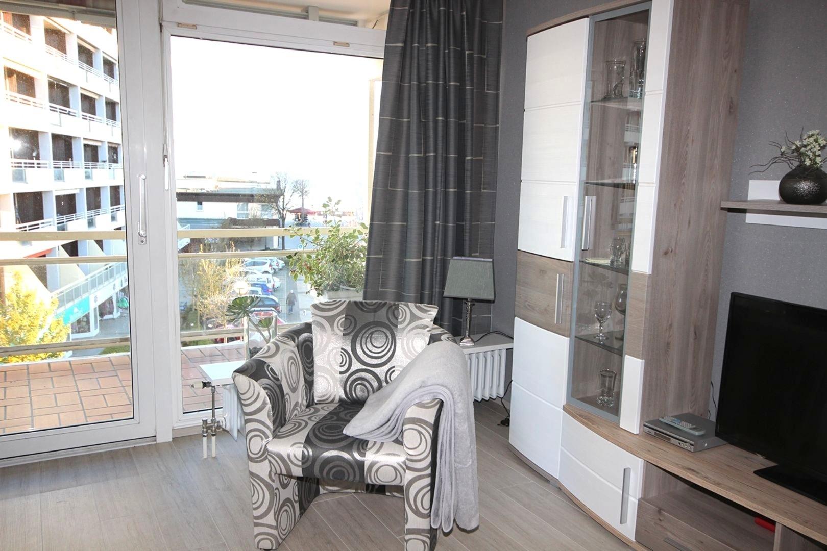 Der gemütliche Wohnbereich hat einen Essplatz und eine stilvolle Couchgarnitur, die zum Bett für 2 Pers. umfunktioniert werden kann, TV, DVD, CD-Radio große, möblierte Loggia mit Markise und Ostseeblick. (ca.50 m²)