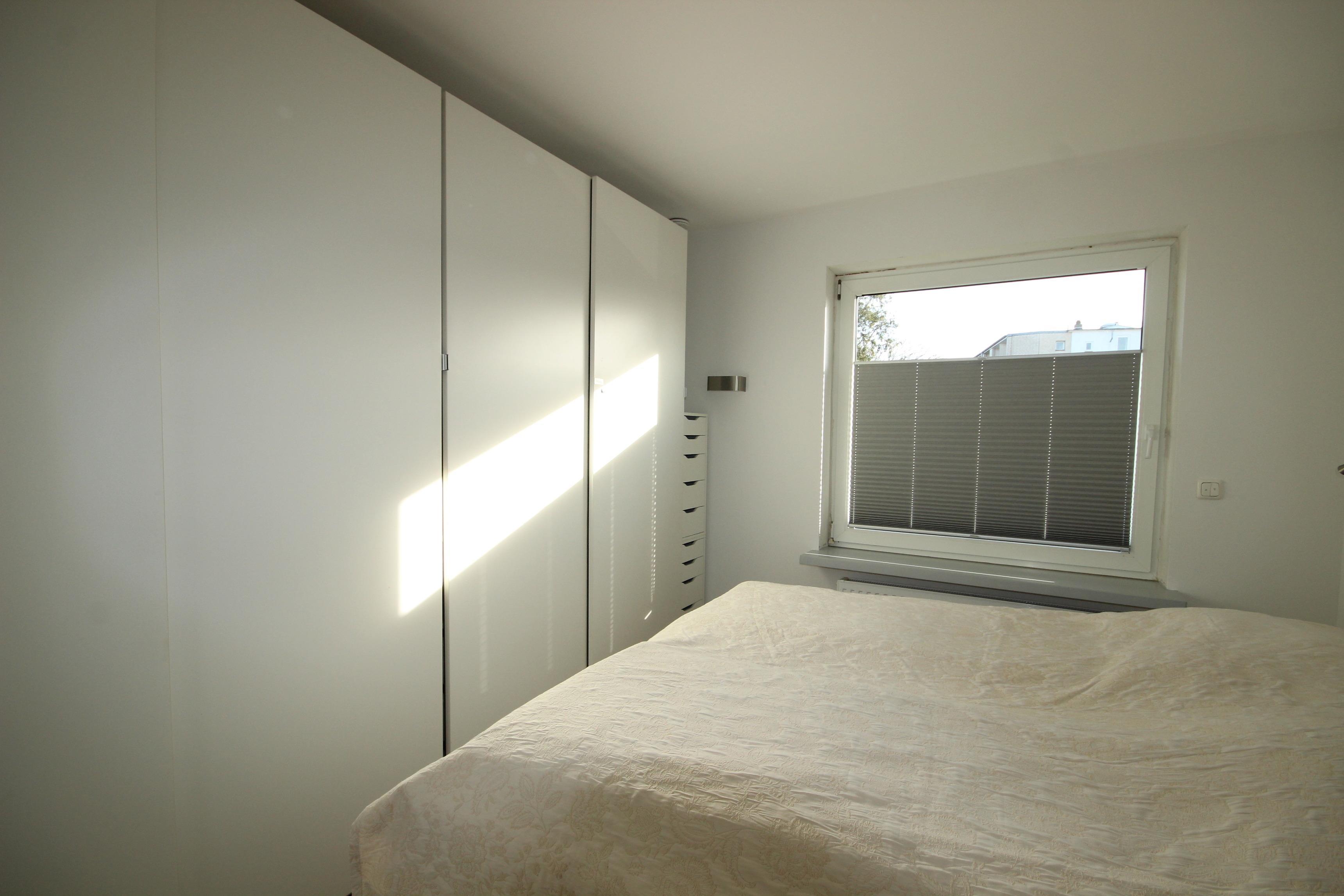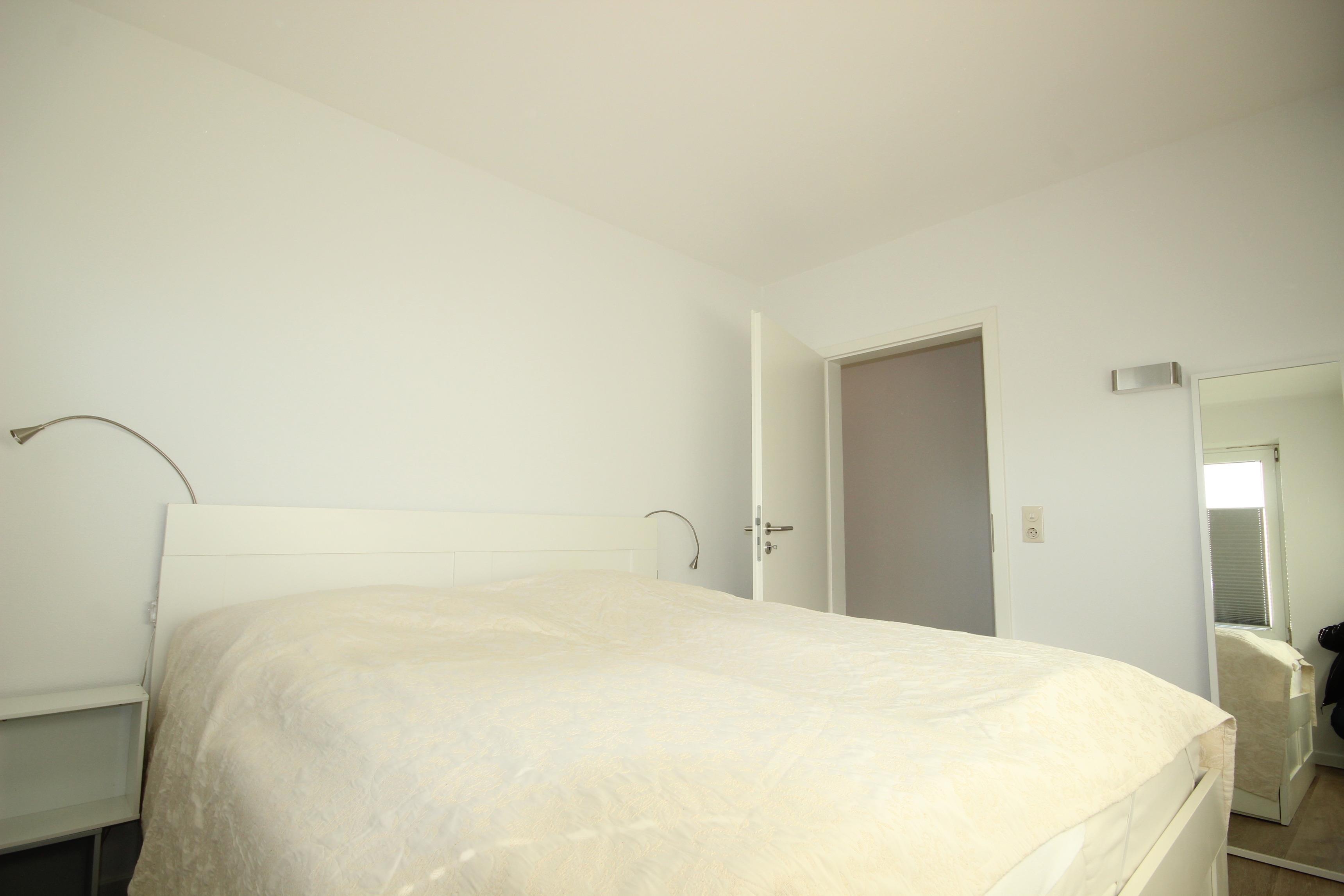 Das helle, gemütliche Schlafzimmer ist möbliert mit einem komfortablen Doppelbett & Kleiderschrank.