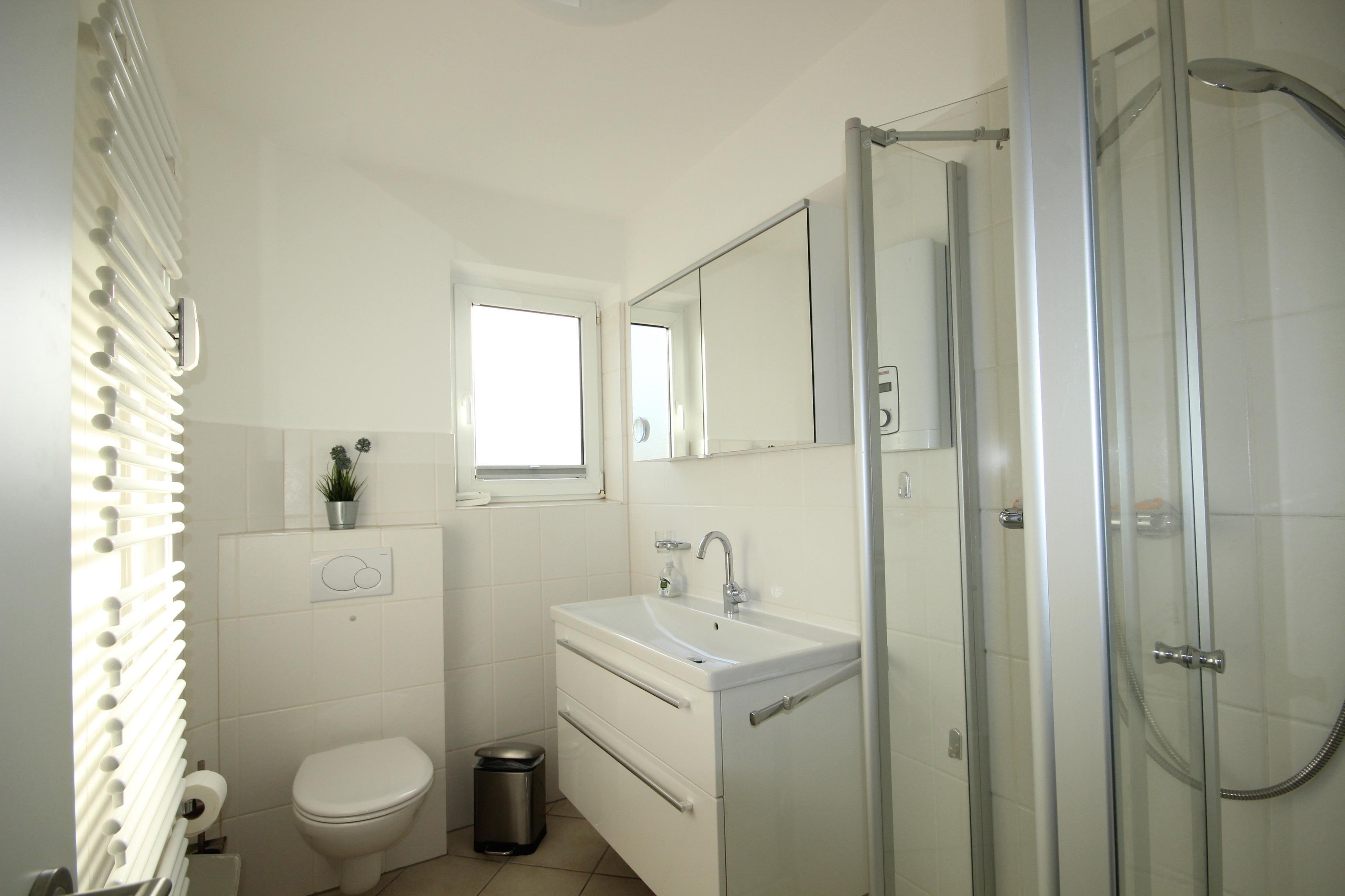 Modernes, hell gefliestes Bad mit Dusche, Waschbecken & WC.