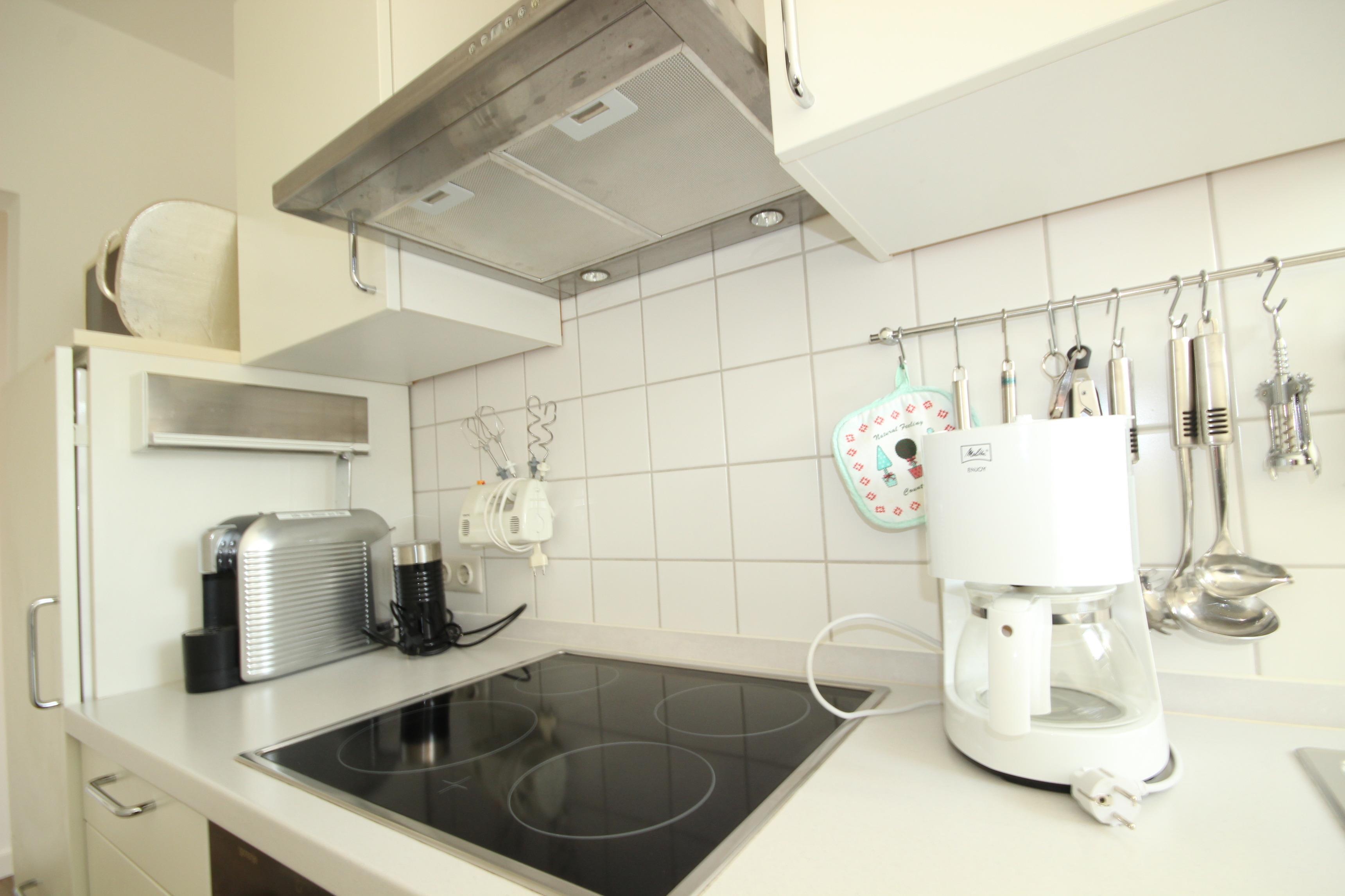 Die moderne Einbauküche ist mit Cerankochfeld, Backofen, Mikrowelle, Kühlschrank mit Gefrierfach, Geschirrspülmaschine sowie den üblichen Küchengeräten sehr gut ausgestattet.