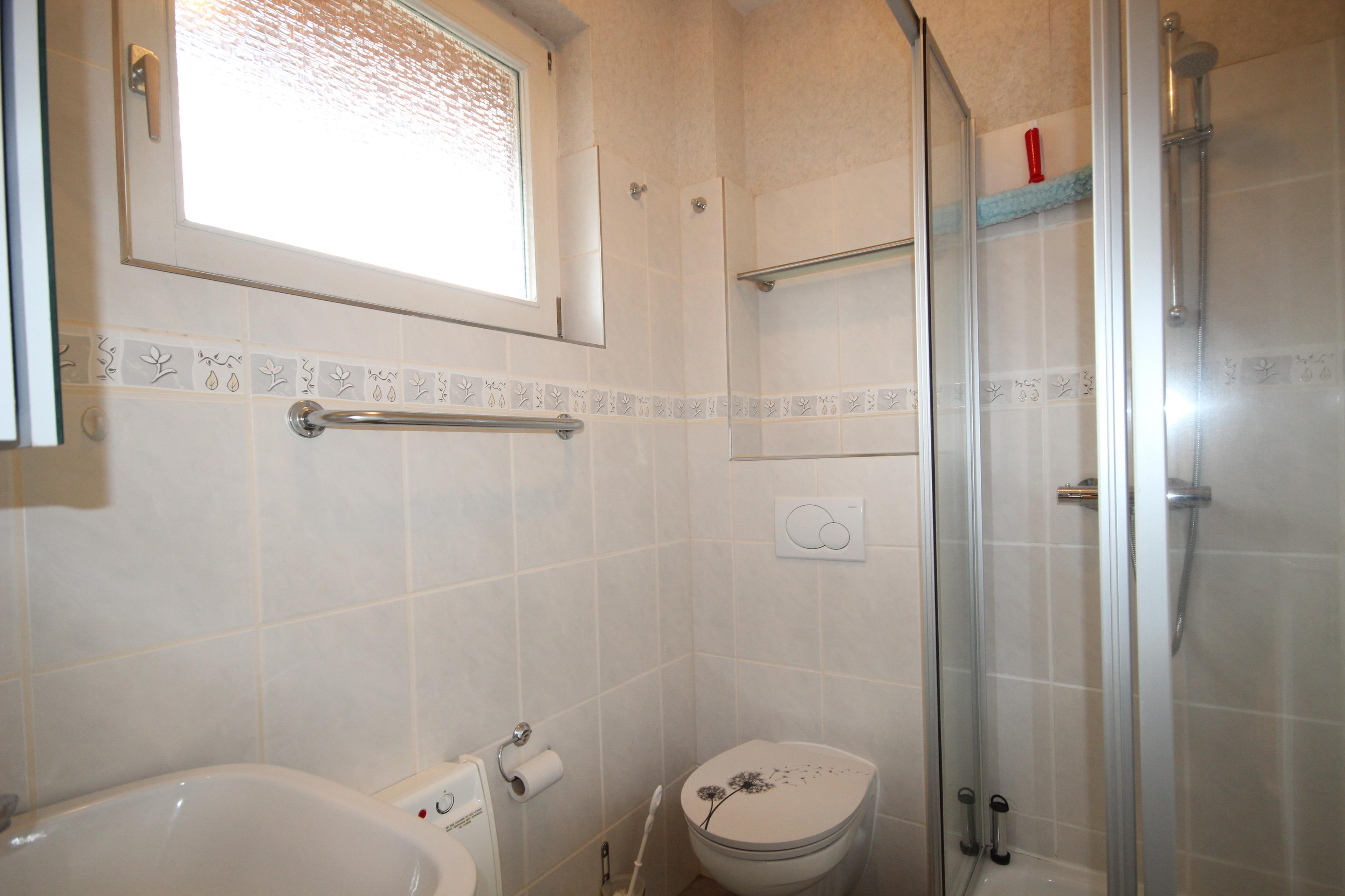 Im EG ist ein helles Tageslicht-Bad mit Dusche, WC & Waschbecken vorhanden.
