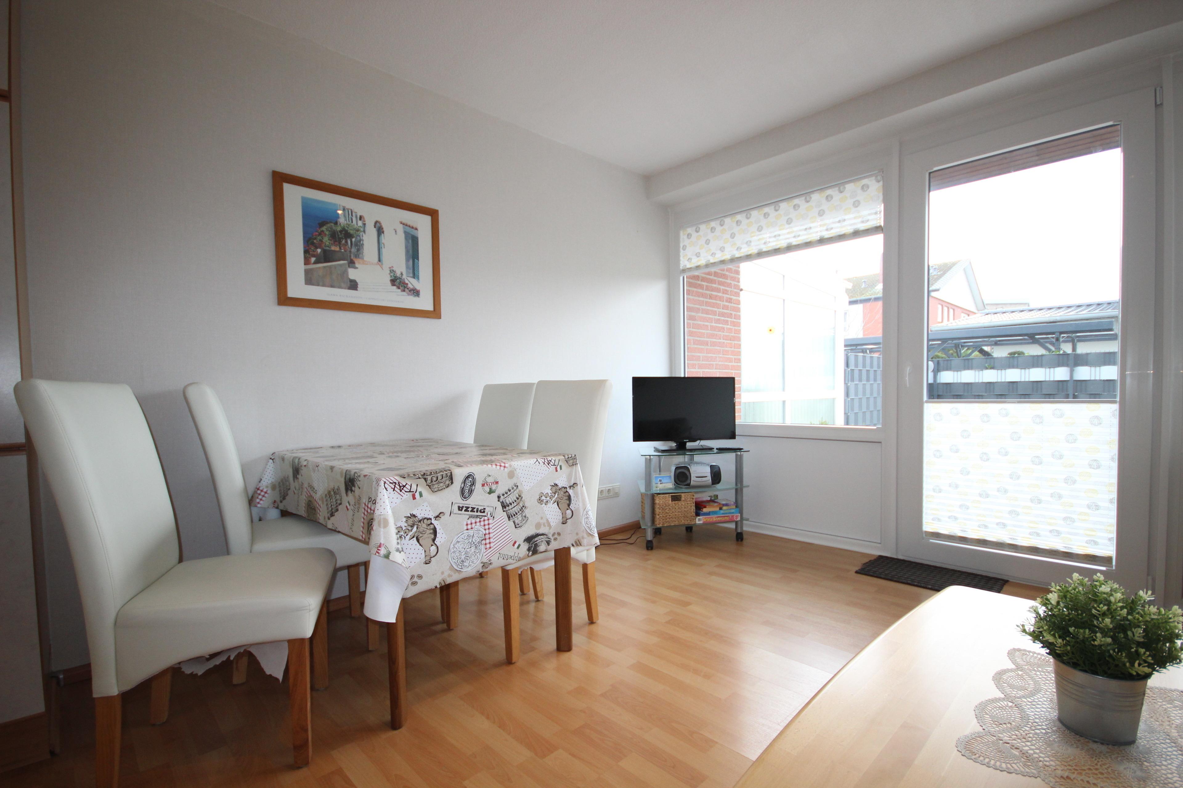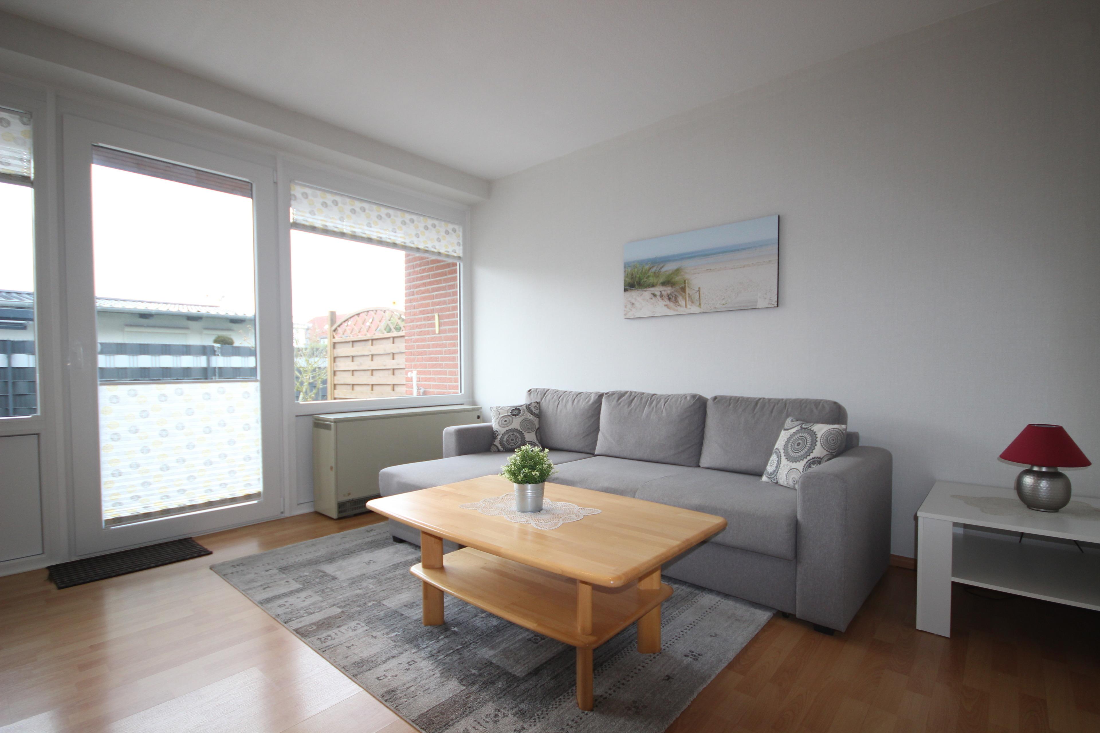 Das gemütliche Wohnzimmer ist möbliert mit bequemer Couchgarnitur, Essplatz, Sat-TV und CD-Radio und Zugang zur sonnigen, möblierten Terrasse mit Sonnenschirm.
