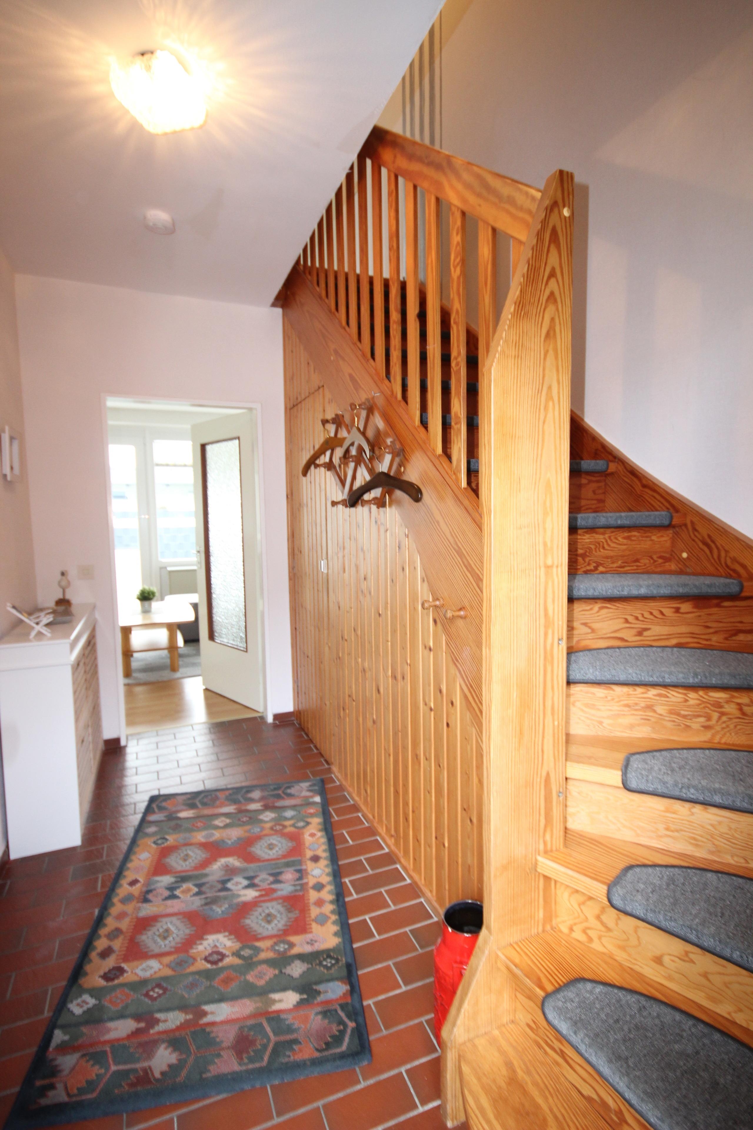 Im OG befinden sich ein Schlafzimmer mit Doppelbett und Kleiderschrank.
