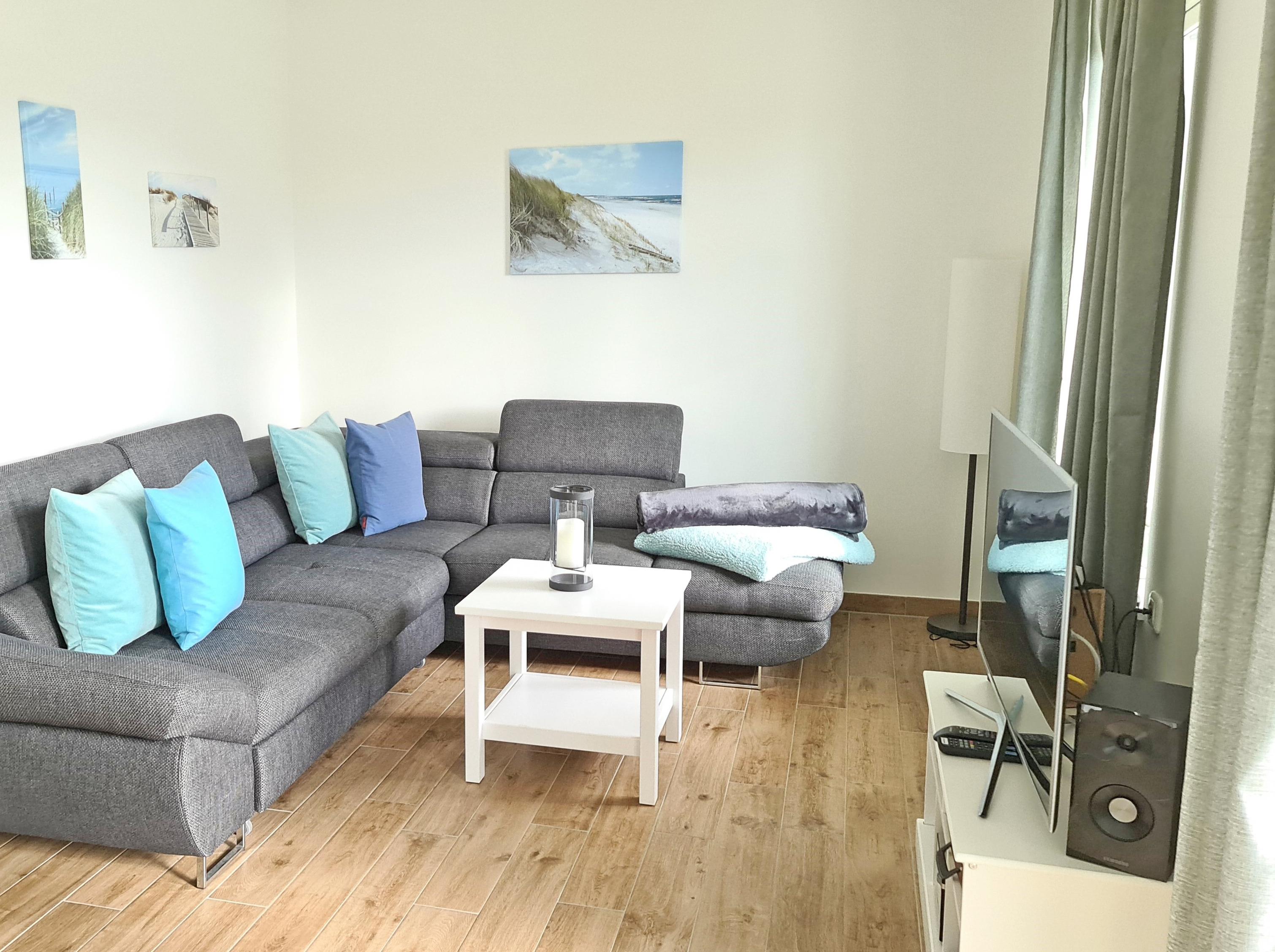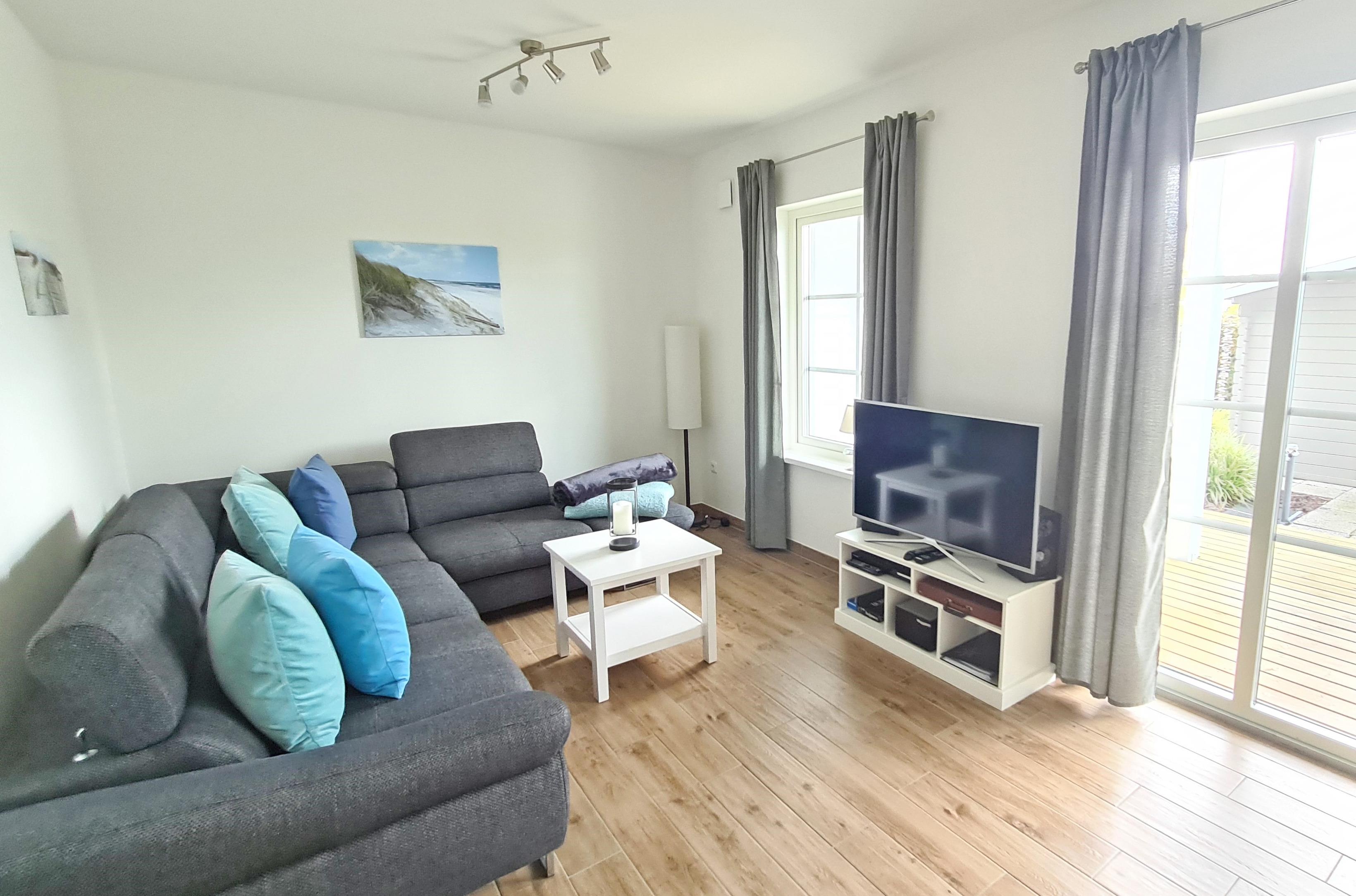 Modernes, geschmackvoll eingerichtetes Wohn- und Esszimmer mit Terrassenzugang. Das Wohn- und Esszimmer ist mit einem Schlafsofa, einem Sessel, einer Kommode und einem Essplatz mit 4 Stühlen ausgestattet. Das Zimmer ist mit Vinylboden ausgelegt. Zur Unterhaltung steht ein Sat-Fernseher zur Verfügung.