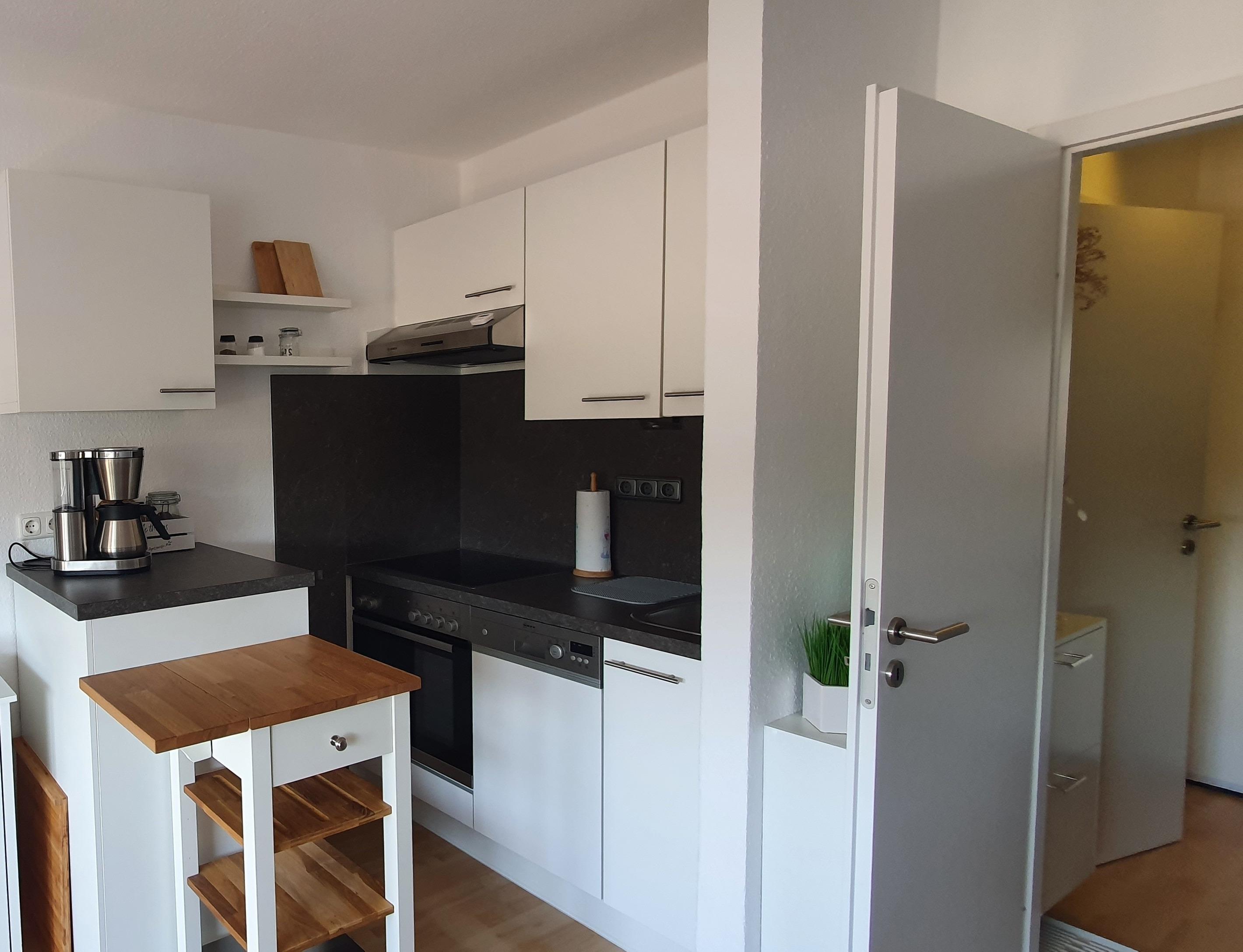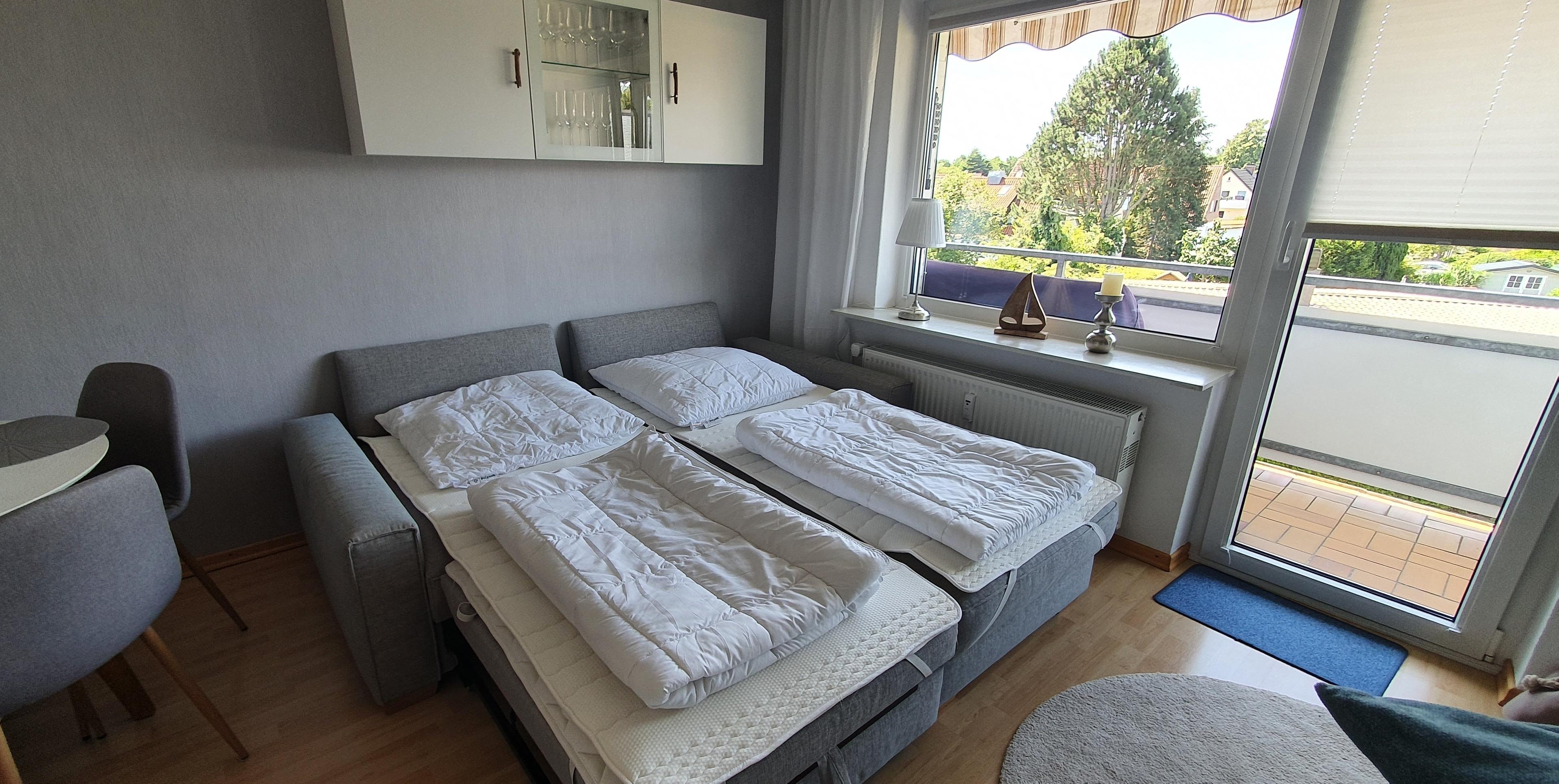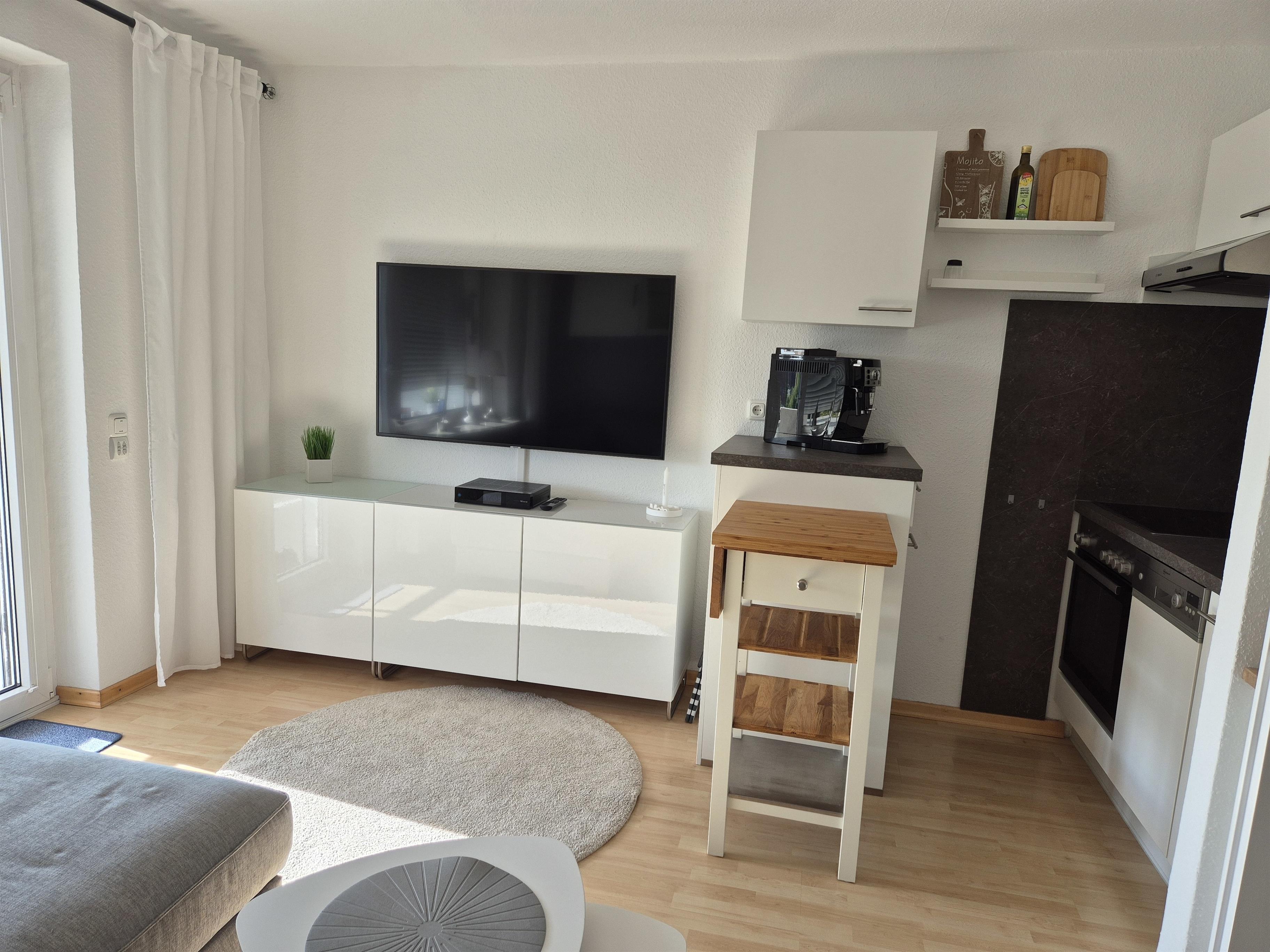 Es befindet sich eine Schlafnische mit einem 120×200 cm Bett und im Wohnzimmer eine neuen (Schlaf)Couch 180×200cm Liegefläche. Es schließt sich nahtlos der Essbereich mit Esstisch an. Daneben befindet sich die offene Küche. Die neue Küchenzeile ist mit einer Geschirrspülmaschine, Kühlschrank mit Gefrierfach, Herd und Cerankochfeld, Kaffeemaschine, Wasserkocher, Toaster ausgestattet.
