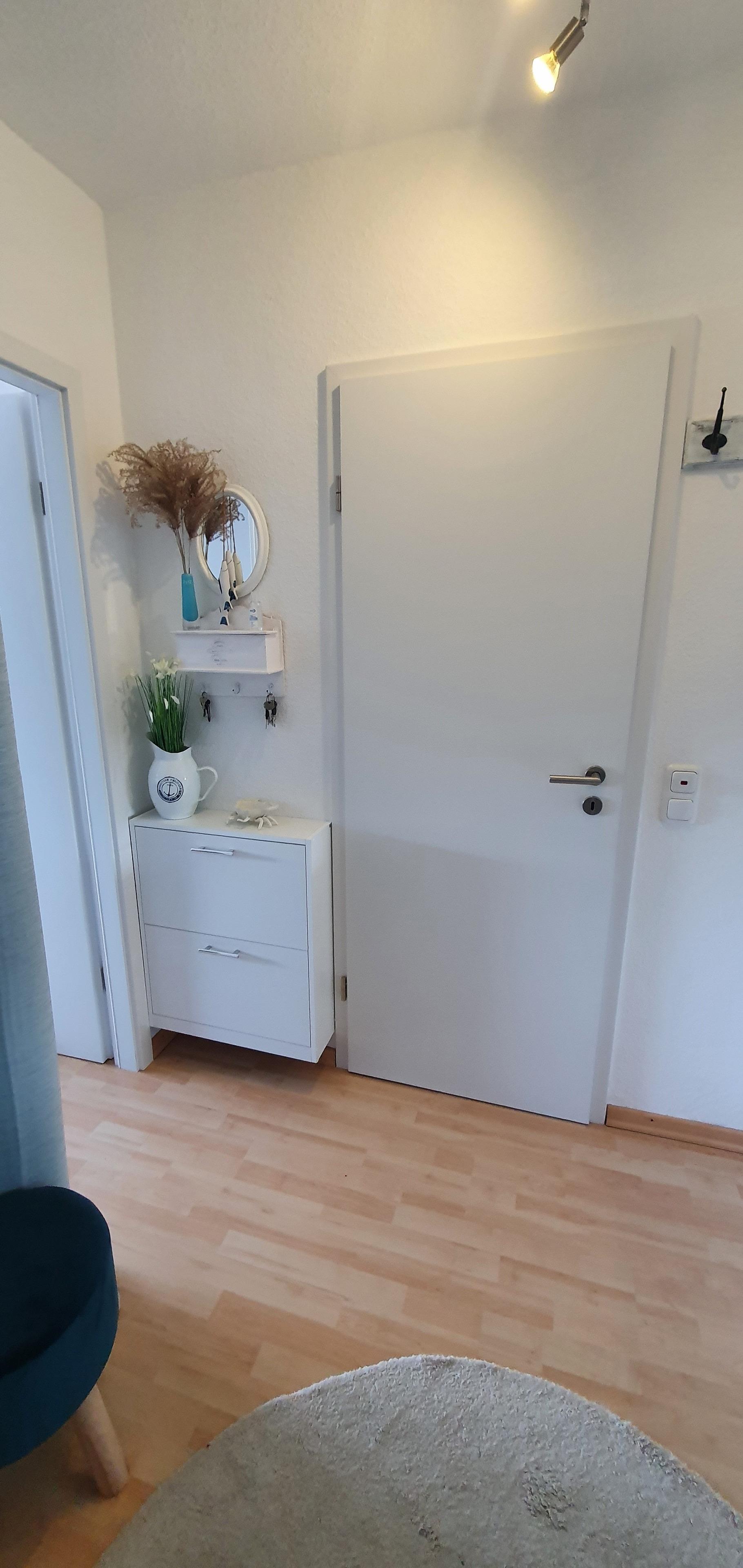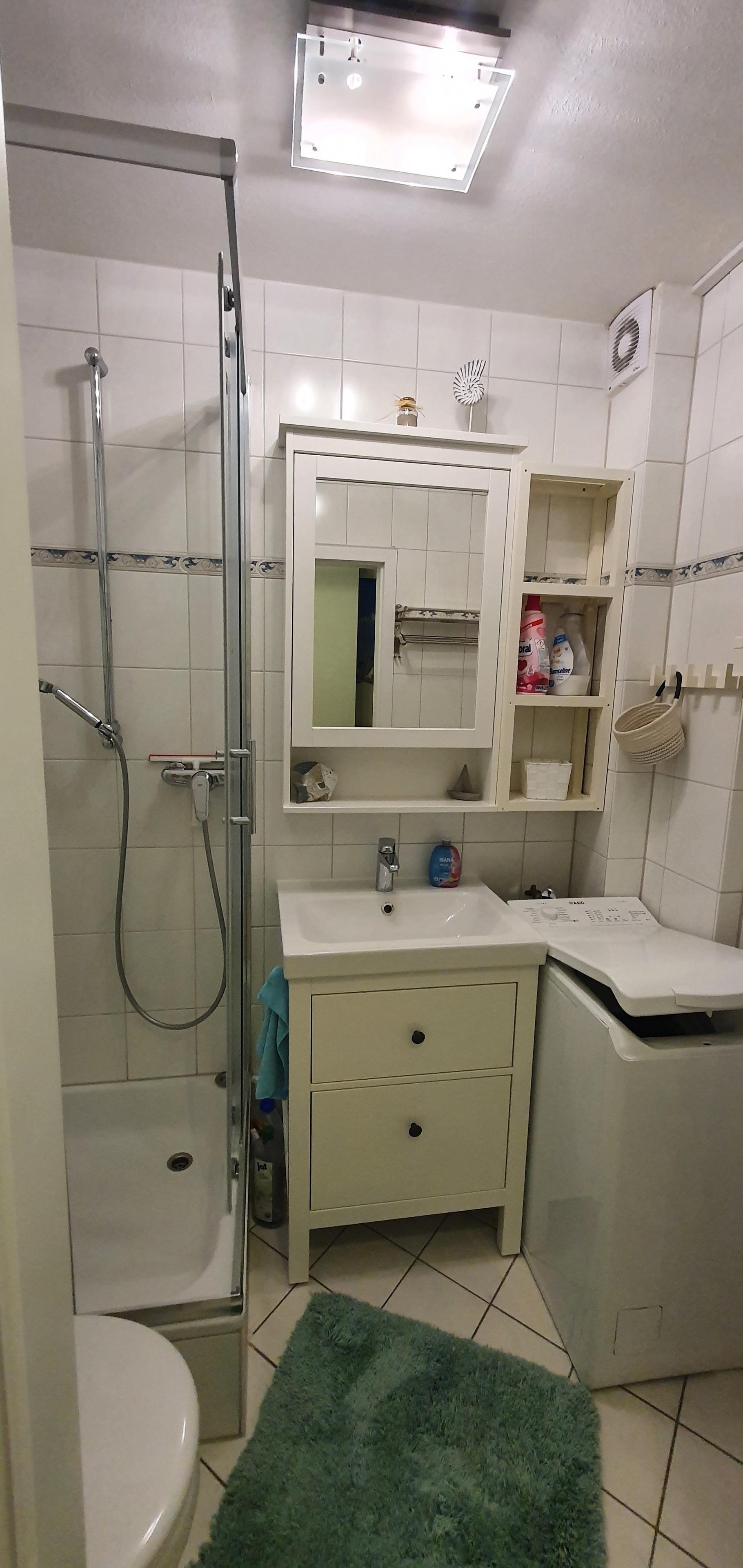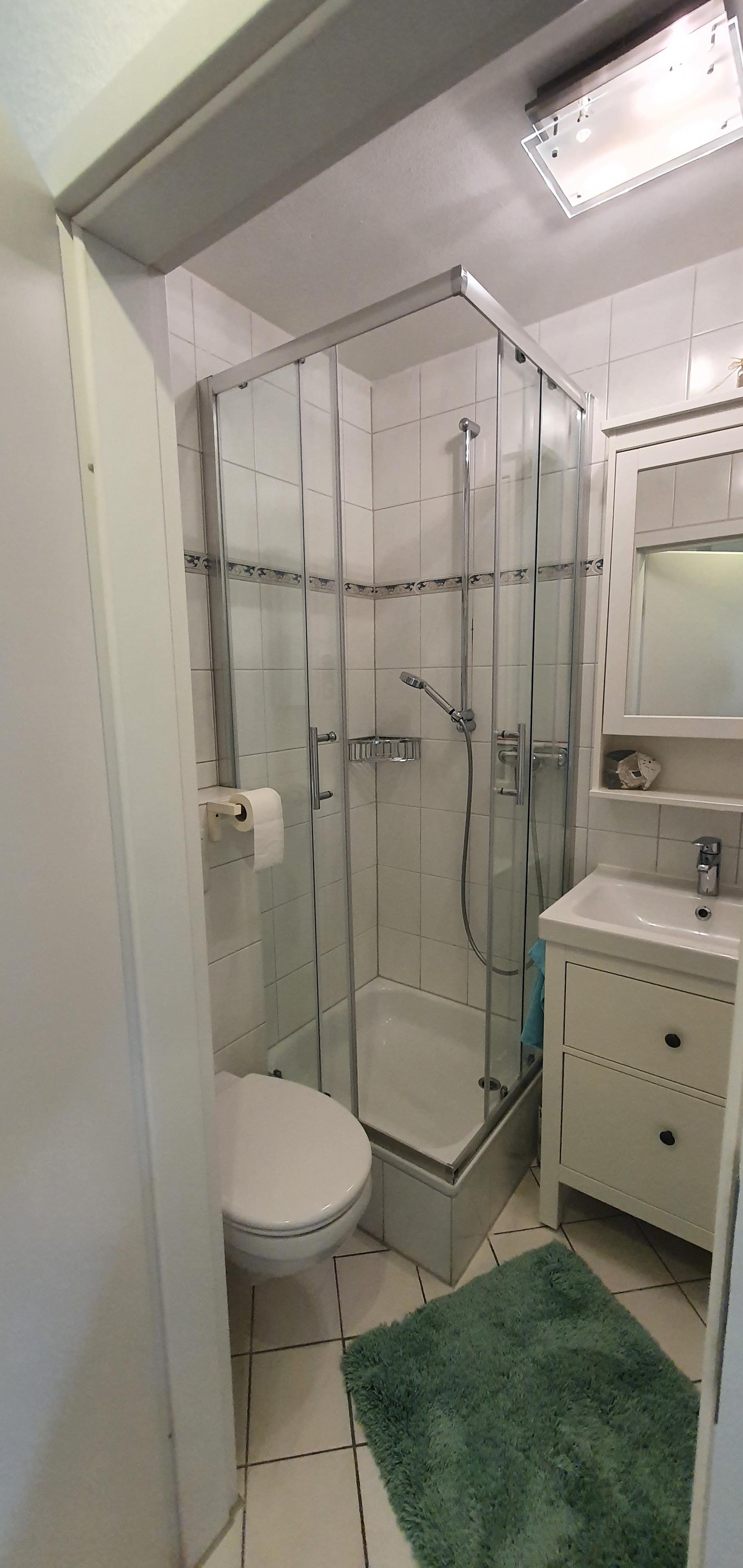 Des Weiteren verfügt die Ferienwohnung über ein kleines Badezimmer mit Dusche, WC und Waschmaschine.