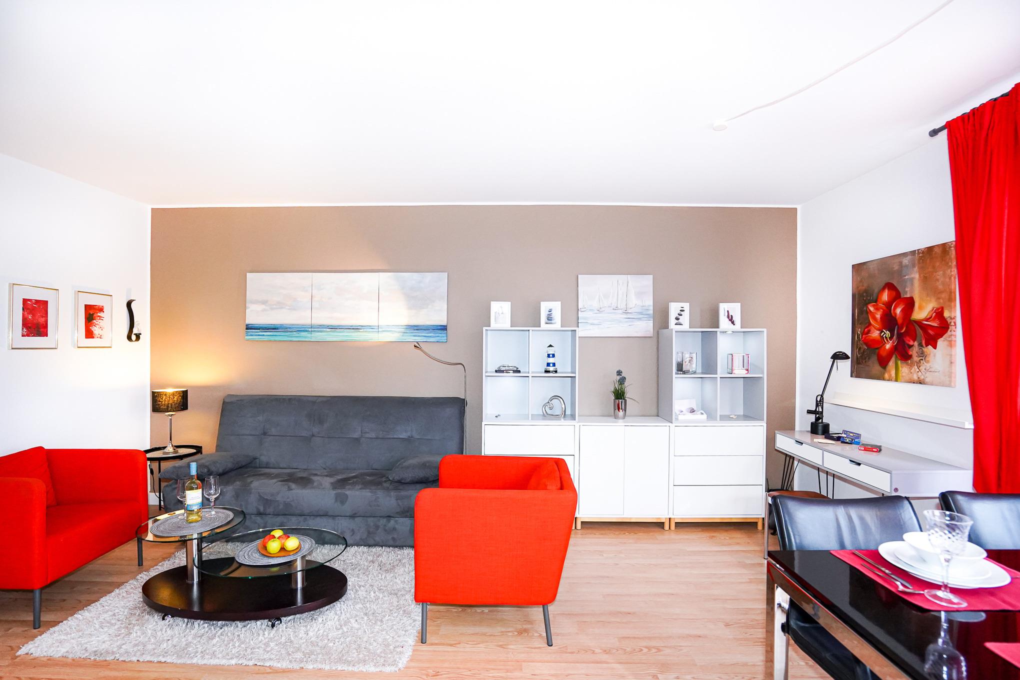 Der Wohnbereich begrüßt Sie hell und lichtdurchflutet mit einer herrlich großen Fensterfront und direktem Balkonzugang. Ausgestattet mit einem Sofa, zwei Sesseln, einem Schreibtisch und einem Esstisch für vier Personen fühlen Sie sich wie zu Hause. Die moderne, sehr gut ausgestattete Küche ist offen gestaltet und perfekt in den Wohnraum integriert.