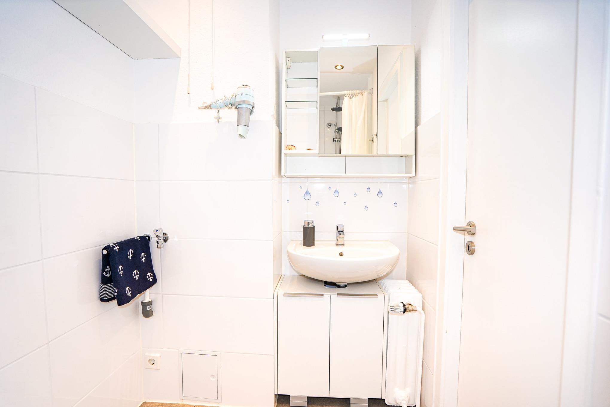 Das hell geflieste Bad bietet Ihnen eine Dusche, einen Waschtisch, ein WC und diverse Ablagemöglichkeiten.