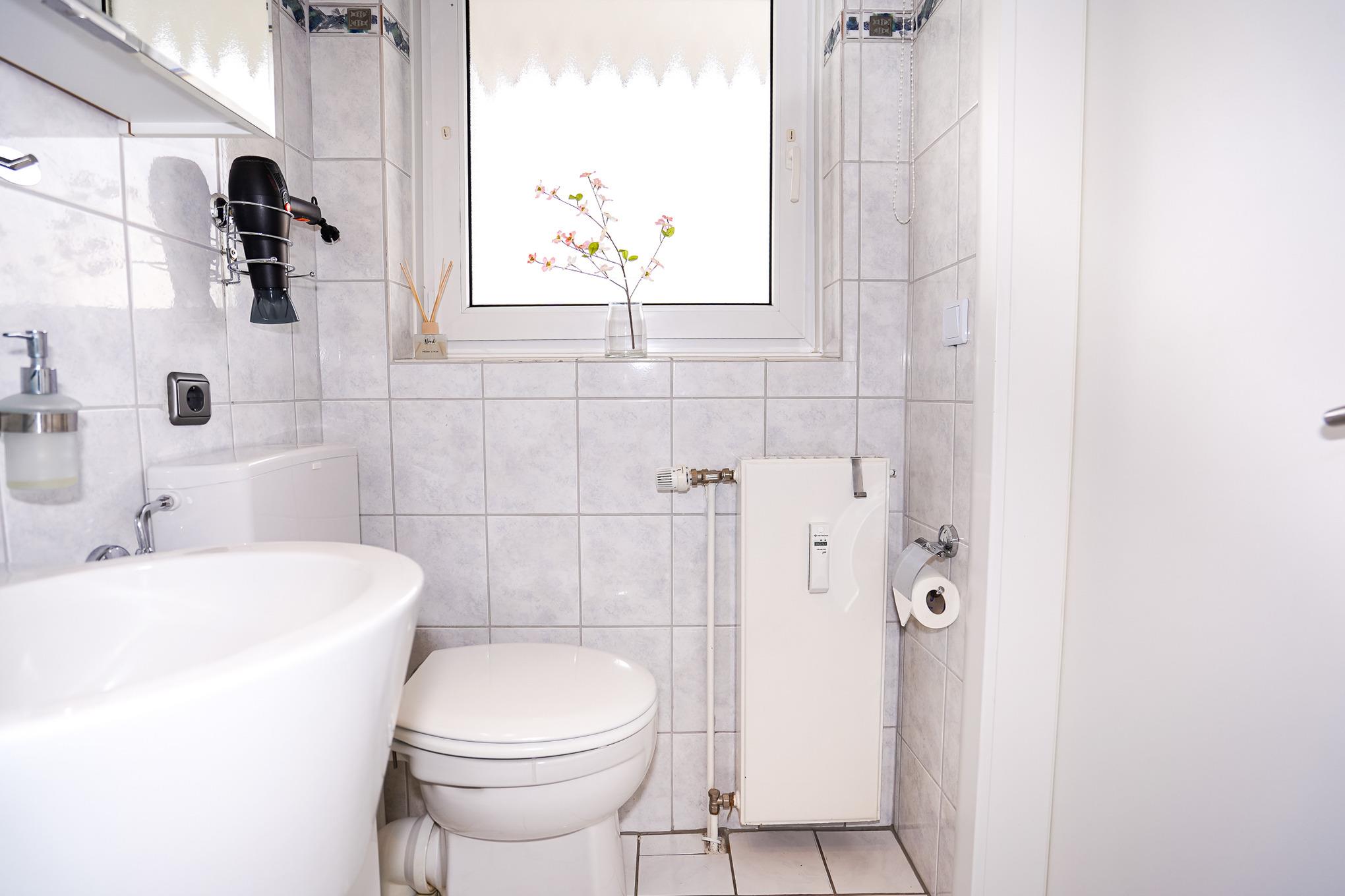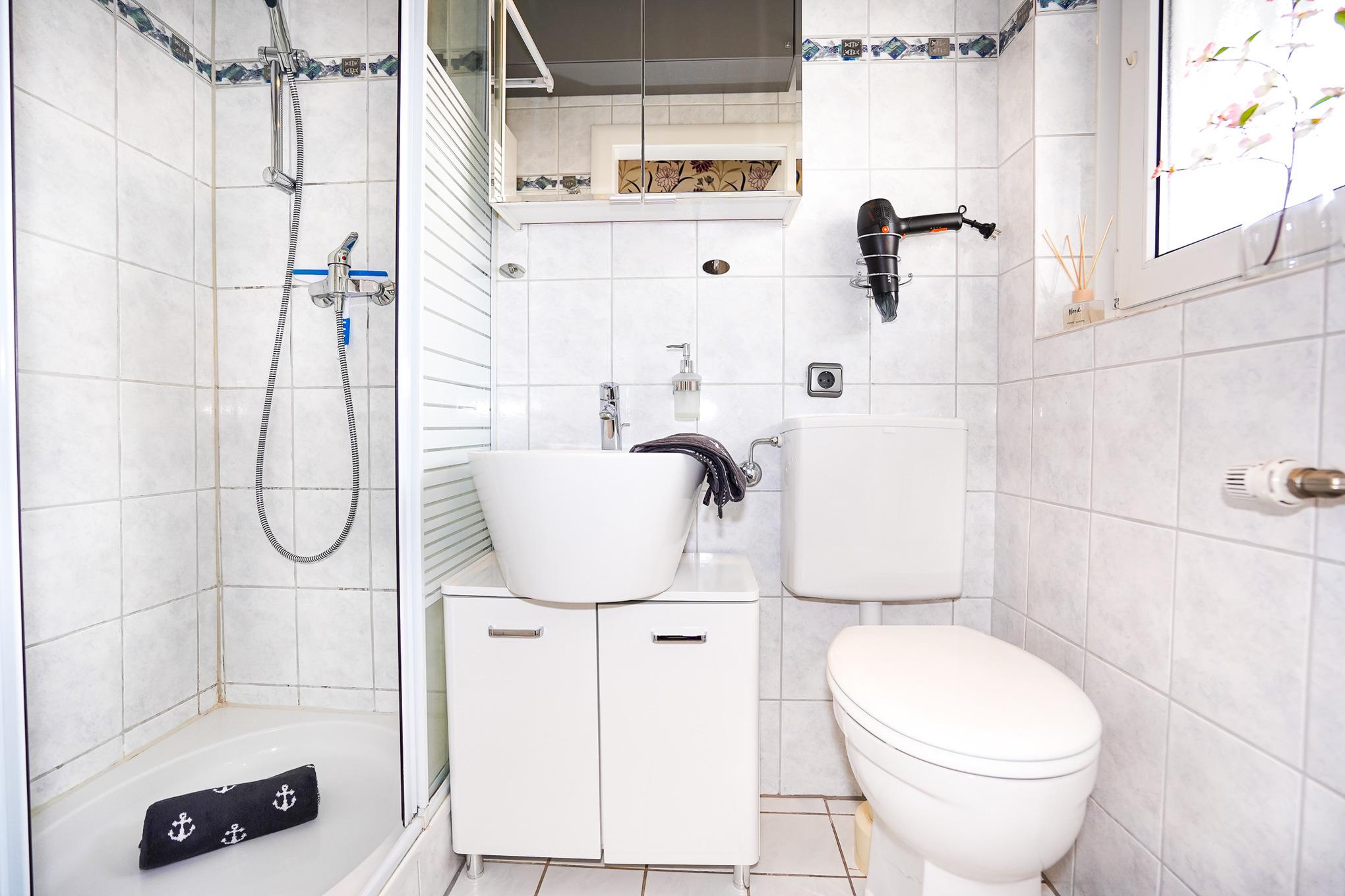 Das hell geflieste, Tageslicht-Bad mit Eckdusche bietet zudem Platz für einen Bad- sowie Spiegelschrank.