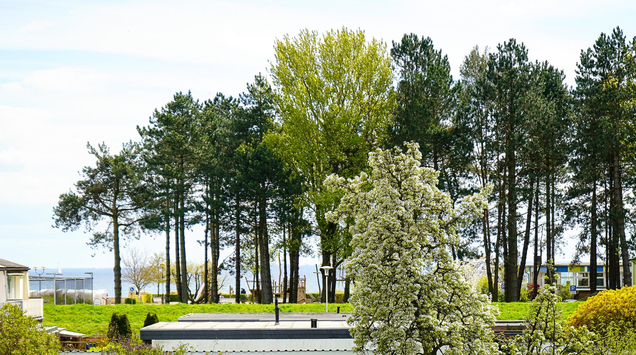 Der lichtdurchflutete Wohnraum wurde mit einem neuen Designer-Vinylboden ausgelegt und teilt sich optisch in zwei Bereiche auf. Ein geräumiger Kleiderschrank und ein Regal mit allerlei Stauraum trennen den Wohnbereich mit kuscheliger Sofaecke, Flat-Screen-TV und einem kleinen Esstisch für 2 Personen vom Schlafbereich. Hier ist auch der Zugang zum lauschigen Balkon. Ein Strandkorb sowie weitere Sitzmöglichkeiten bieten den ganzen Tag über einen sonnigen Blick in Richtung Ostsee.